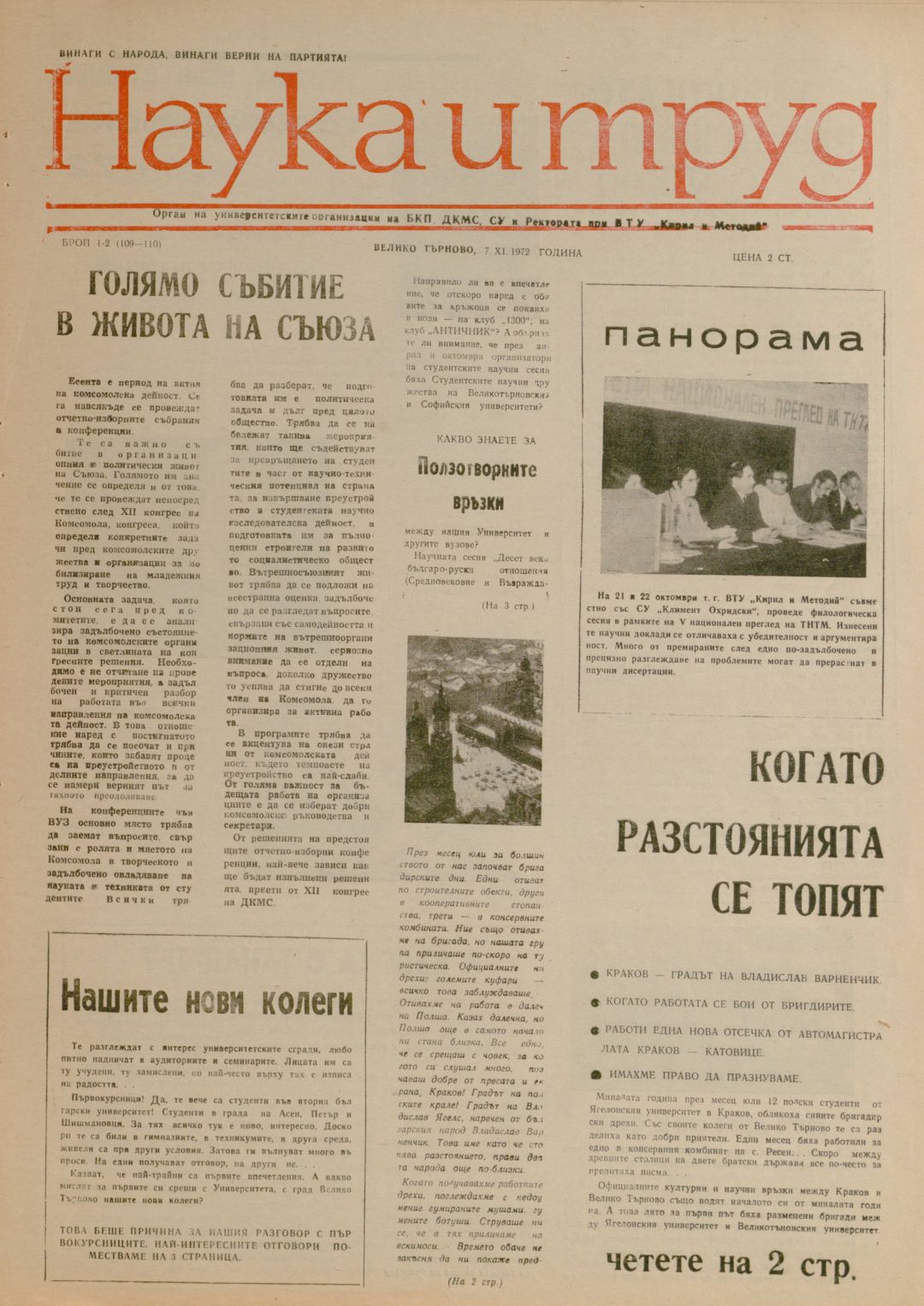 Год.11, 1-2 (109-110). Наука и труд : Орган на институтските комитети на БКП, ДКМС, СУ и Ректората при ВПИ "Братя Кирил и Методий"