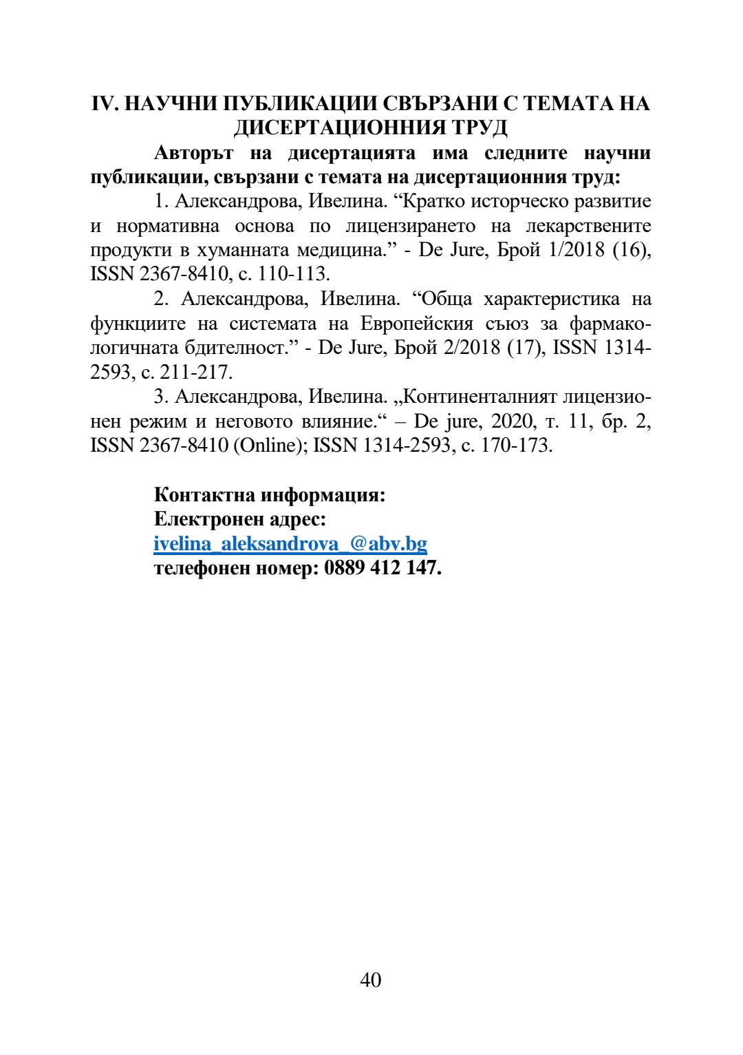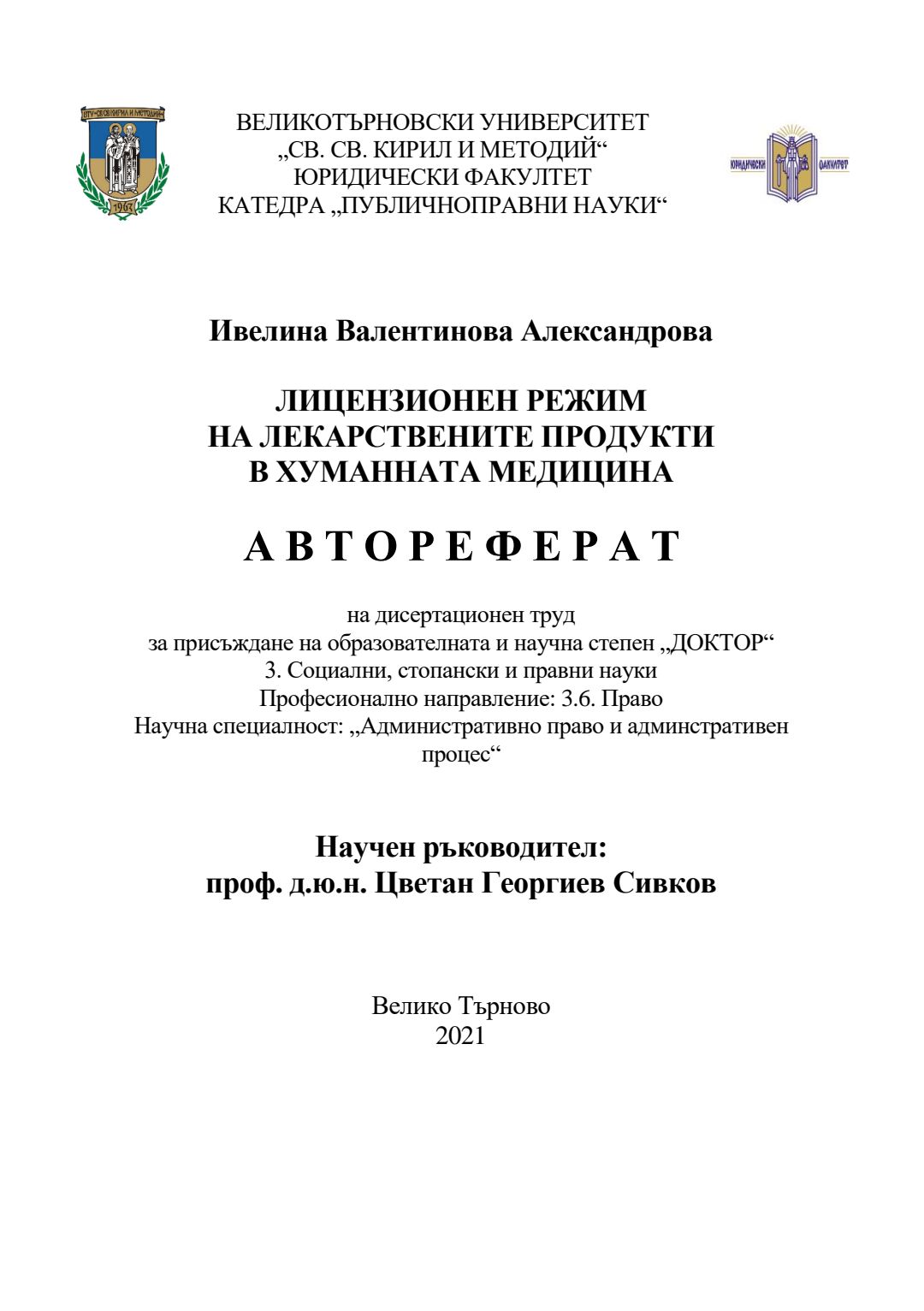 Лицензионен режим на лекарствените продукти в хуманната медицина : Автореферат / Ивелина Валентинова Александрова ; Науч. ръководител Цветан Георгиев Сивков