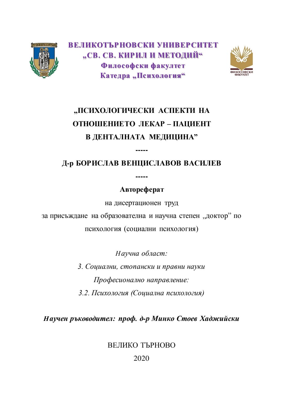 Психологически аспекти на отношението лекар – пациент в денталната медицина : Автореферат / Борислав Венциславов Василев ; Науч. ръководител Минко Стоев Хаджийски