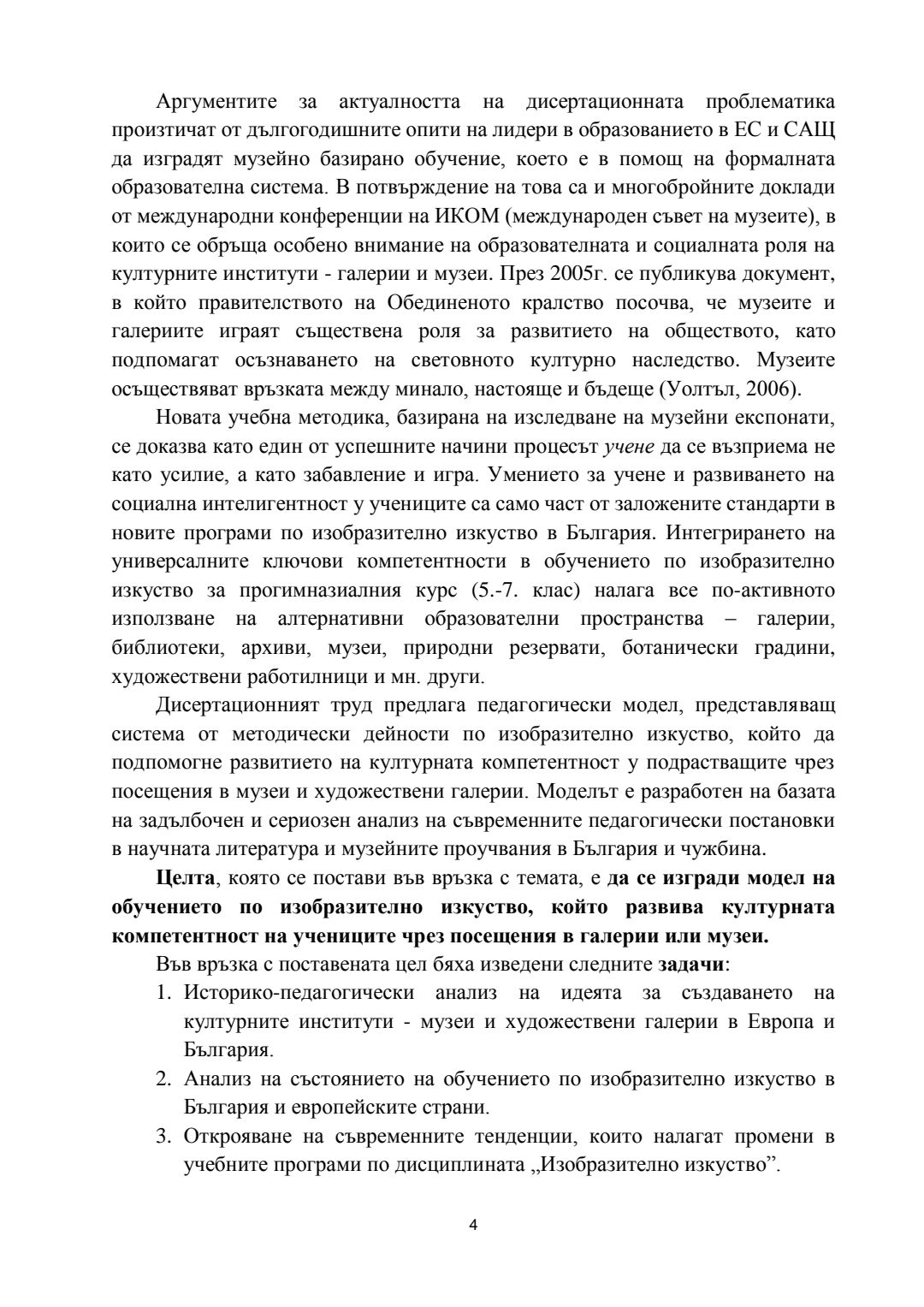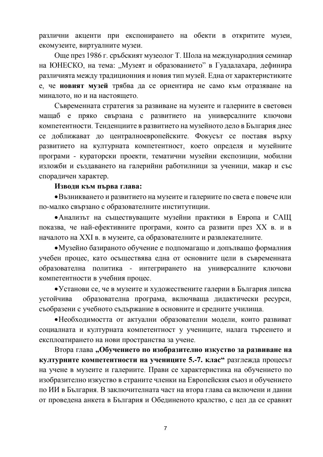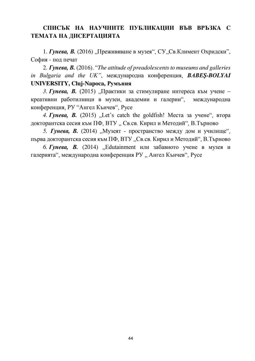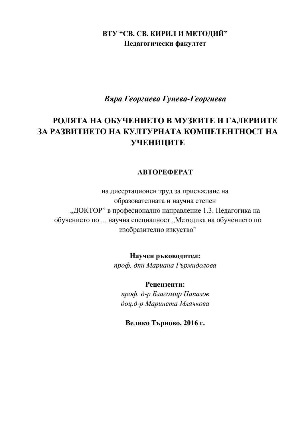 Ролята на обучението в музеите и галериите за развитието на културната компетентност на учениците : Автореферат / Вяра Георгиева Гунева-Георгиева ; Науч. ръководител Мариана Гърмидолова