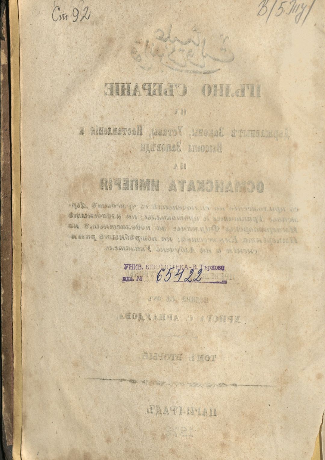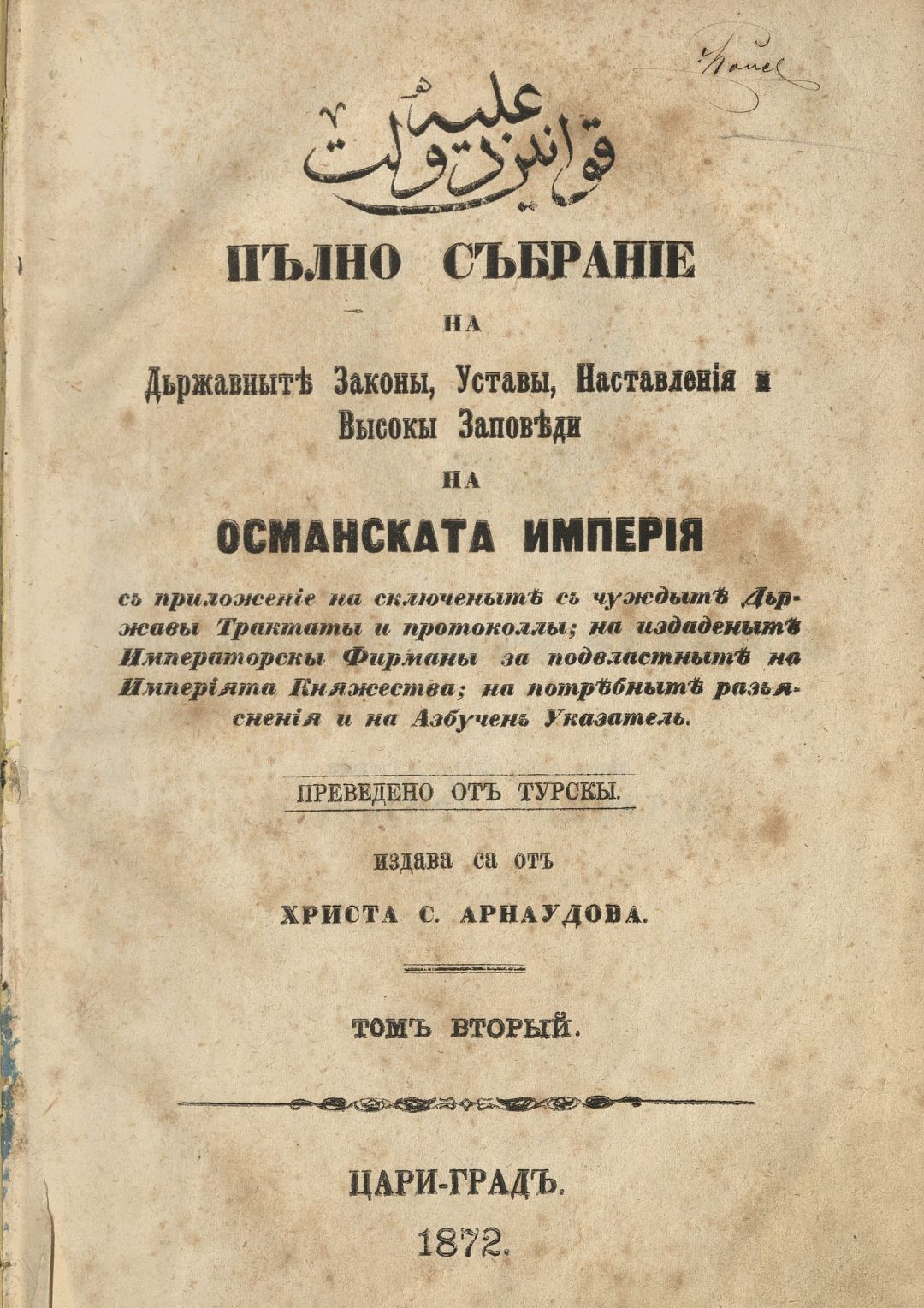 Пълно събрание на държавните закони, устави, наставления и високи заповеди на Османската империя, с приложение на сключените с чуждите държави трактати и протоколи; на издадените императорски фирмани за подвластните на империята княжества... : на потребните разяснения и на азбучен указател : Т. 1–3.