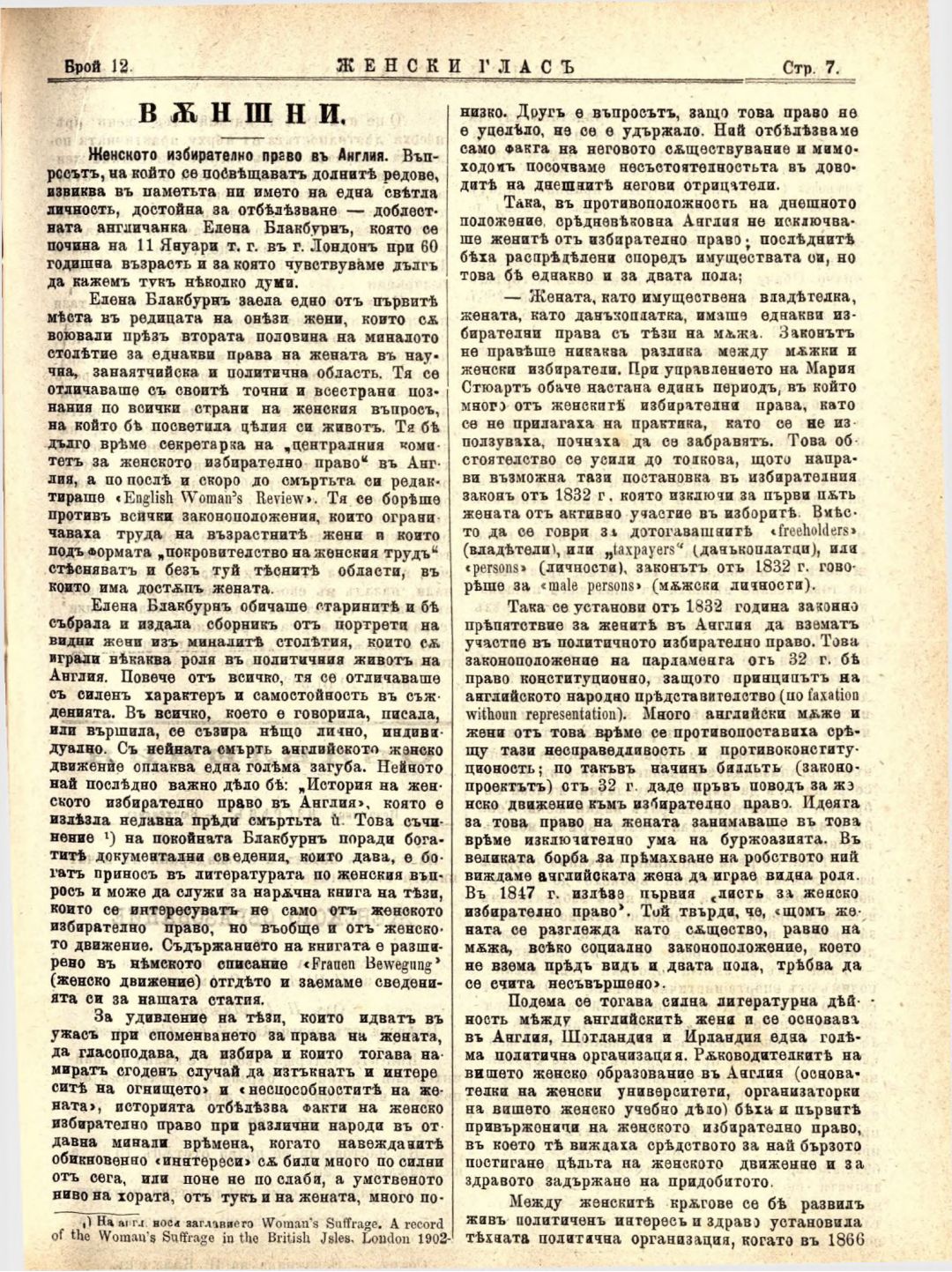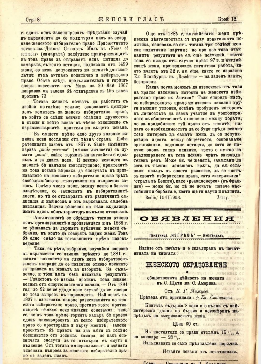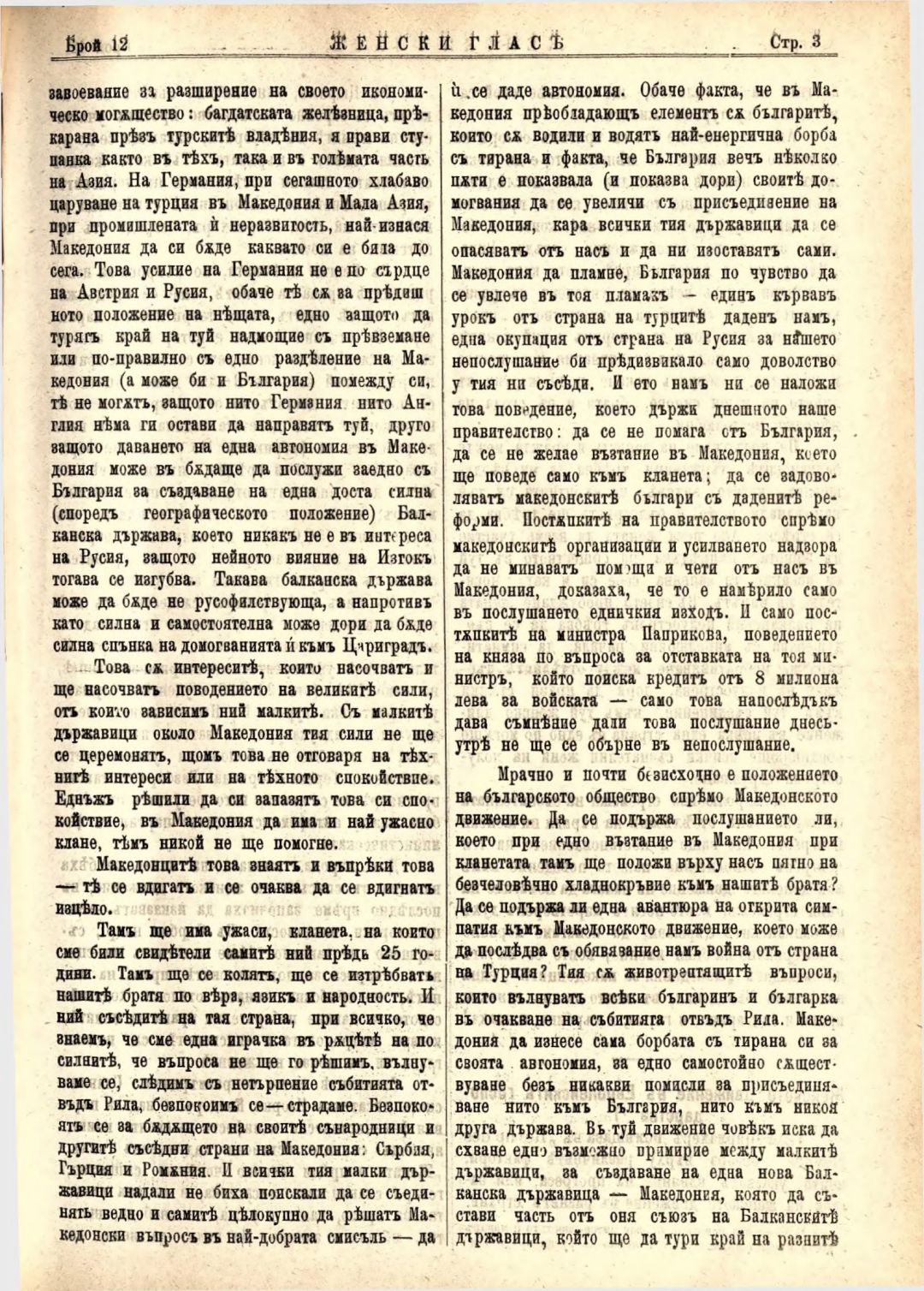 Год. 4,№ 12 Женски глас : Орган на българския женски съюз