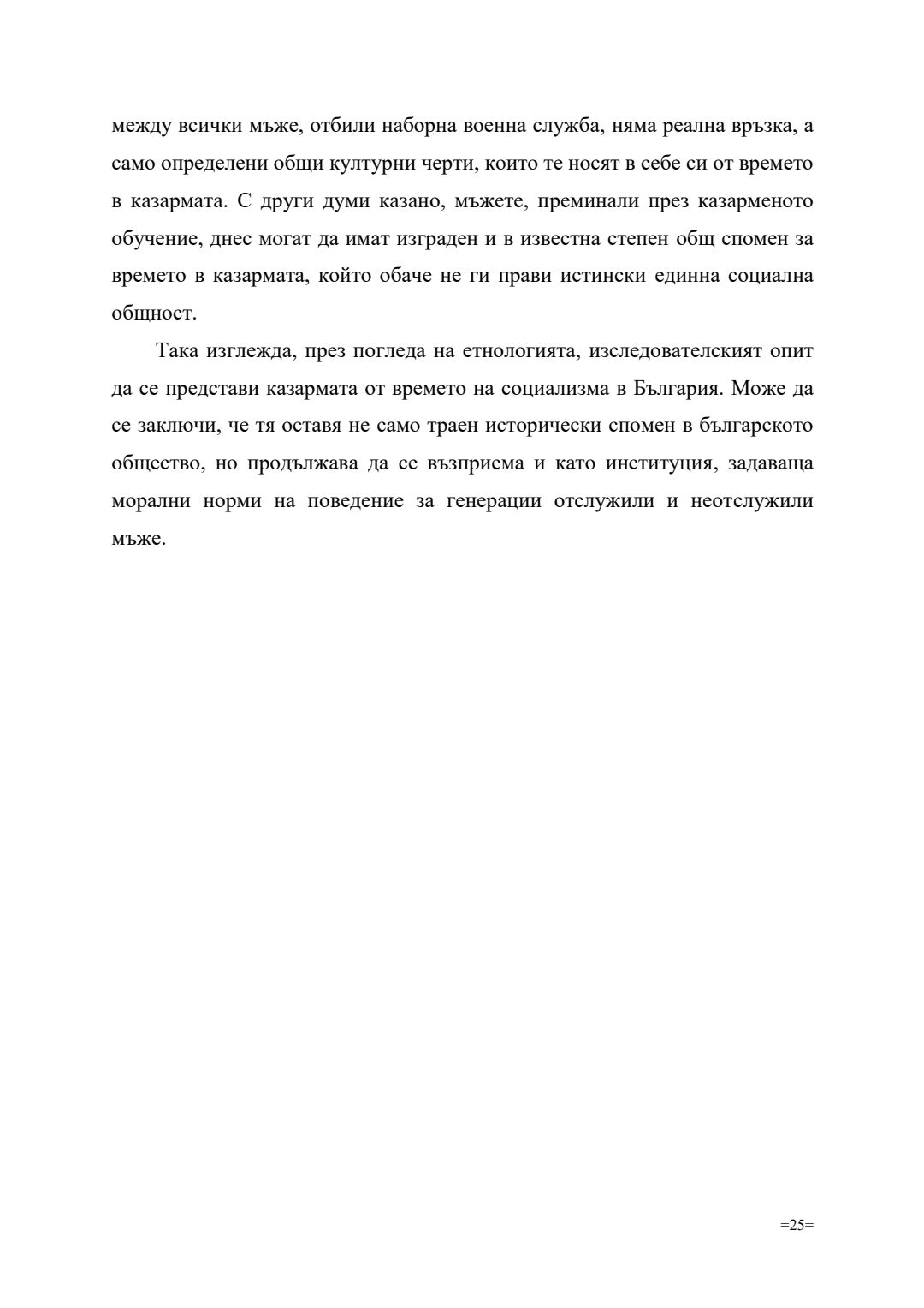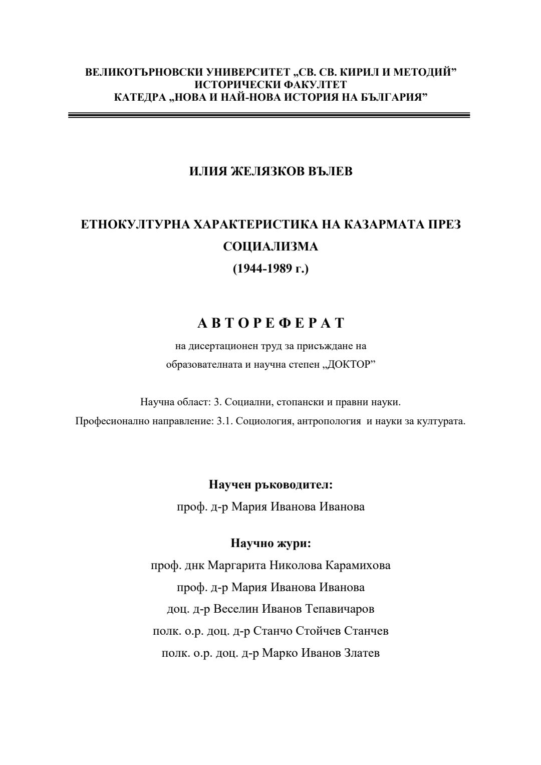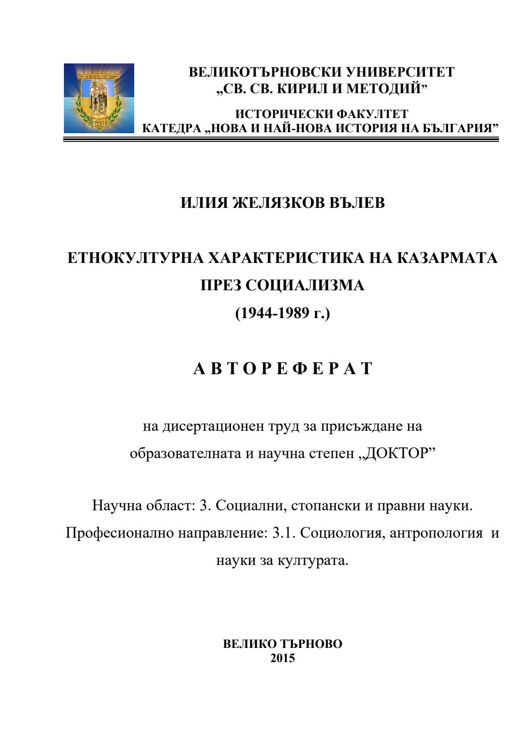 Етнокултурна характеристика на казармата през социализма (1944-1989 г.) / Илия Желязков Вълев ; Науч. ръководител Мария Иванова