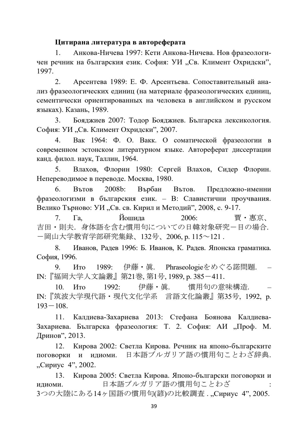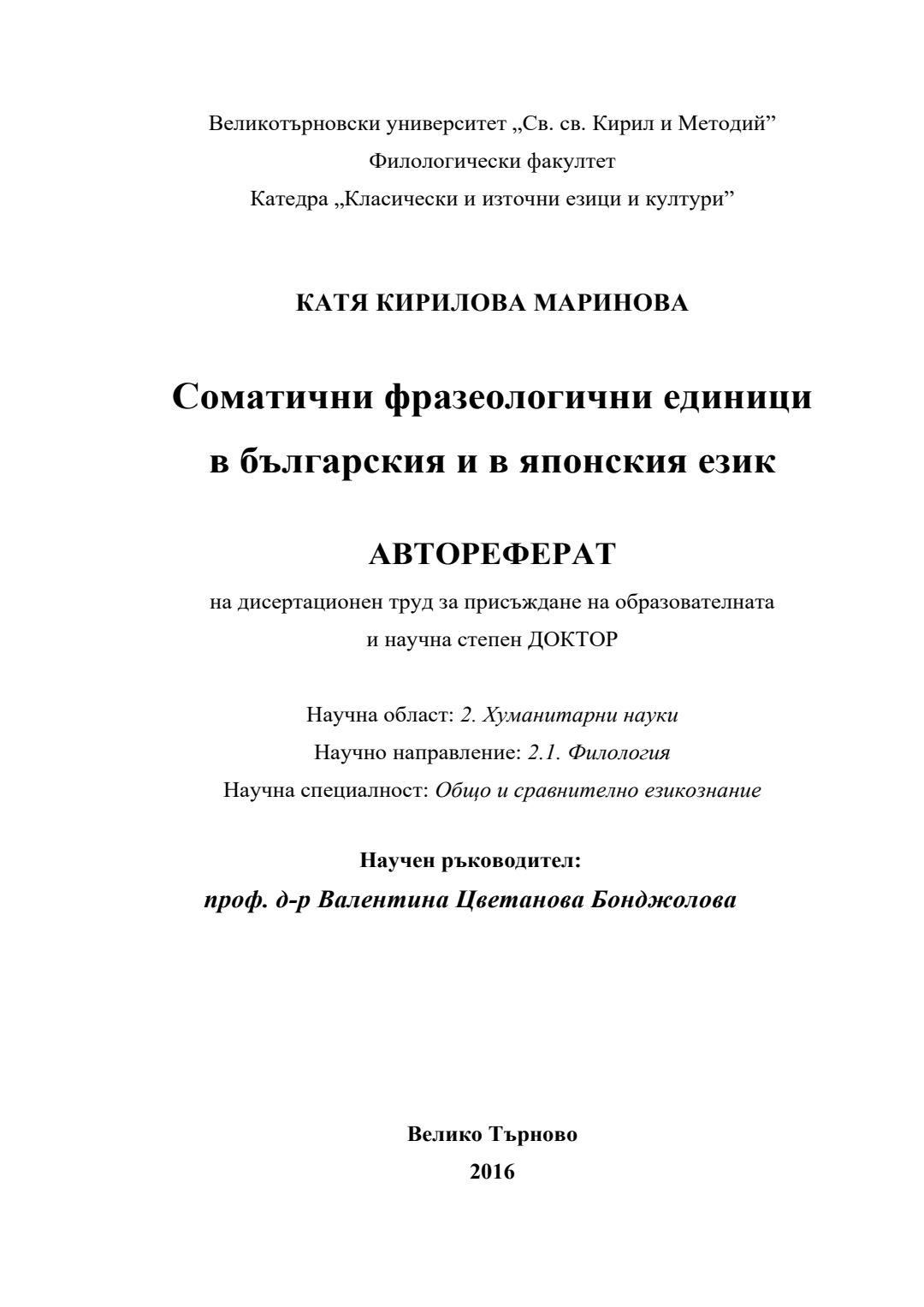 Соматични фразеологични единици в българския и в японския език : Автореферат / Катя Кирилова Маринова ; Науч. ръководител Валентина Бонджолова