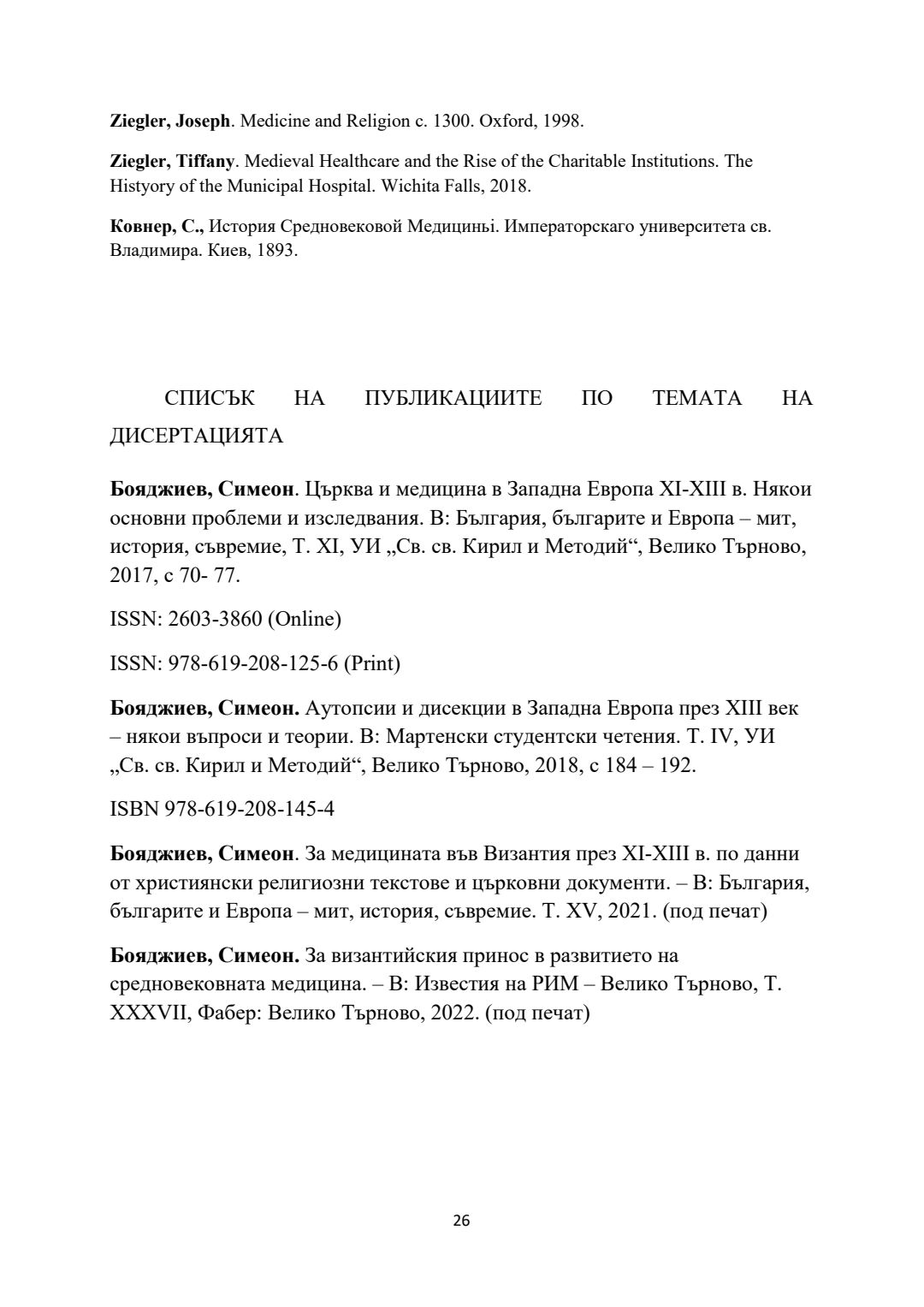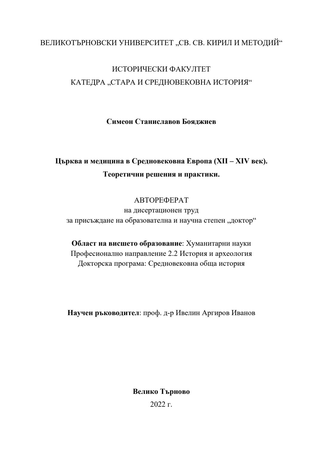 Църква и медицина в Средновековна Европа (XII - XIV век). Теоретични решения и практики : Автореферат / Симеон Станиславов Бояджиев ; Науч. ръководител Ивелин А. Иванов