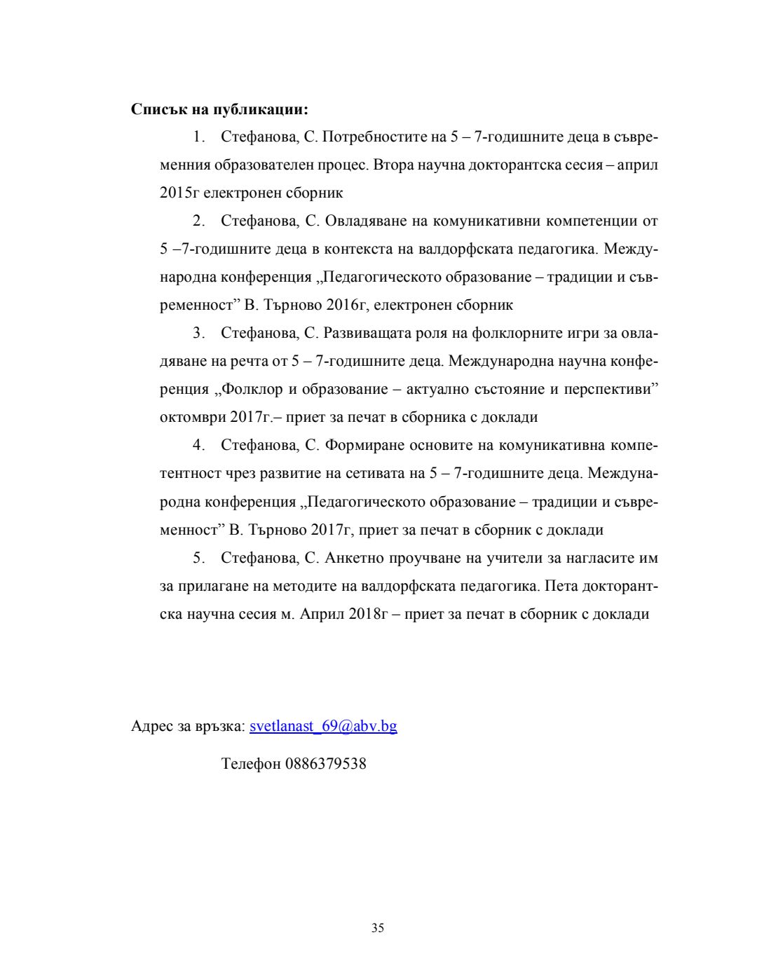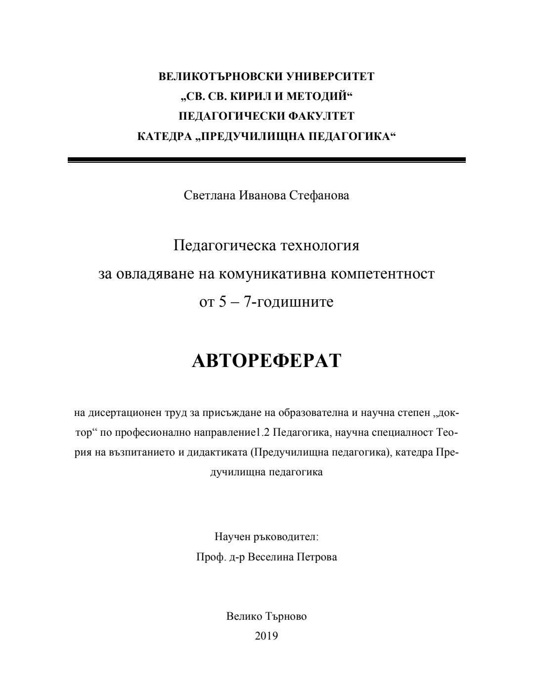 Педагогическа технология за овладяване на комуникативна компетентност от 5-7-годишните : Автореферат / Светлана Иванова Стефанова ; Науч. ръководител Веселина Петрова