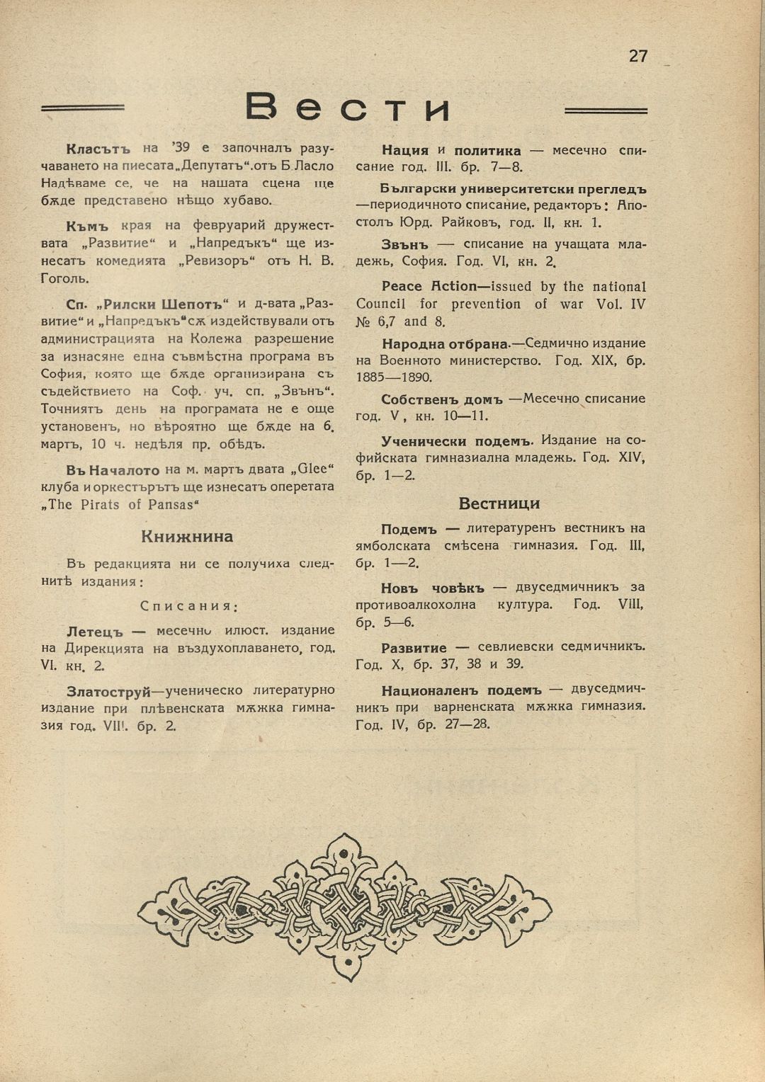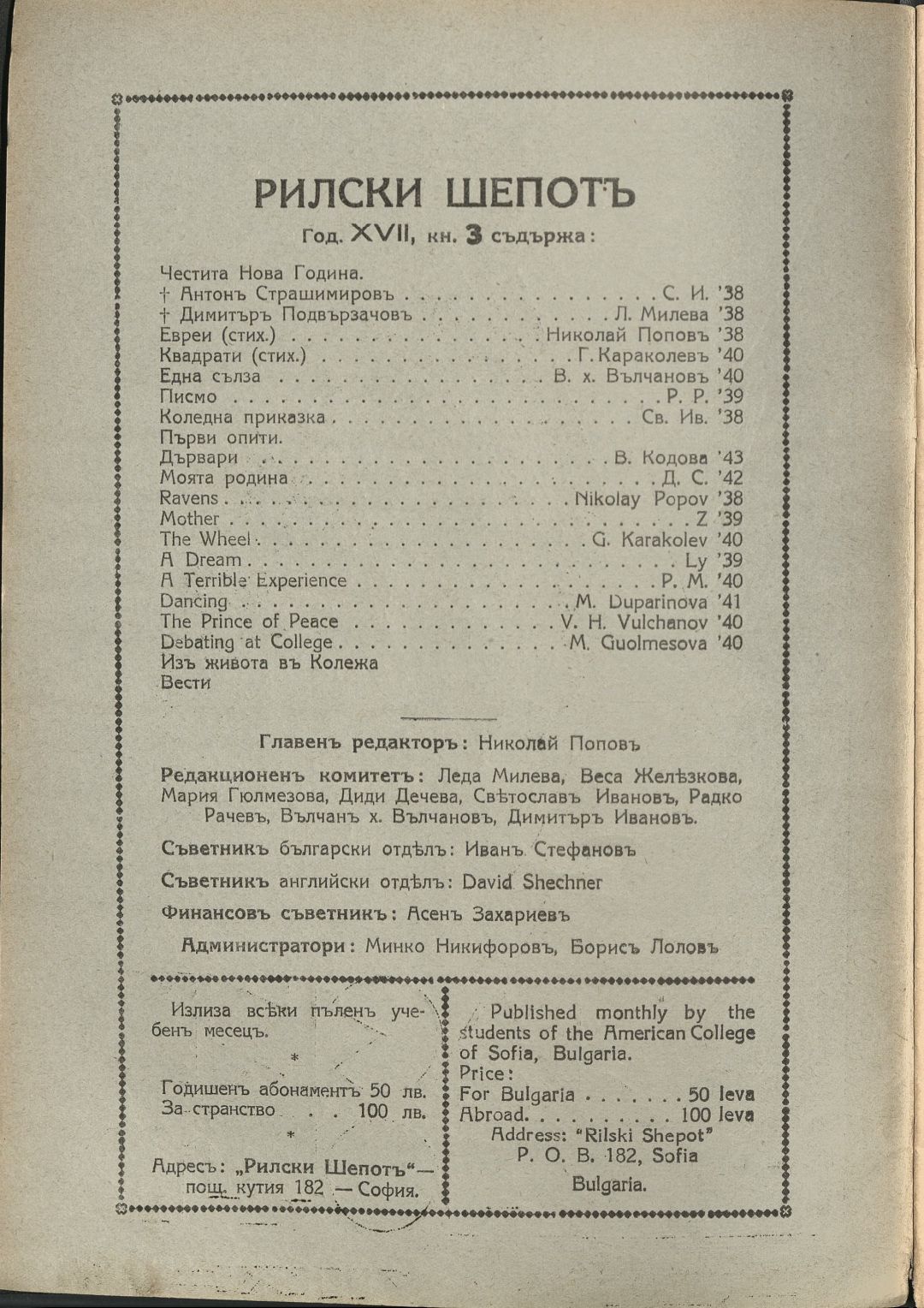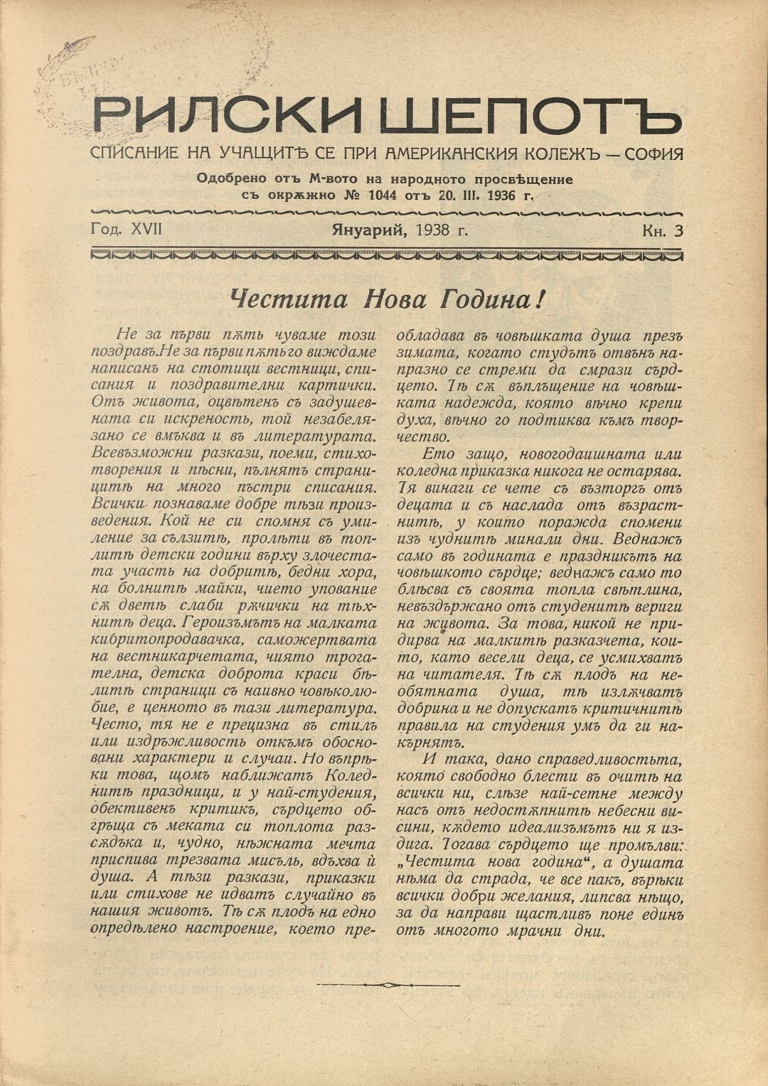 Год. 17, Кн. 3. Рилски шепот : Орган на учащите се при Американския колеж - София / Американски колеж - София