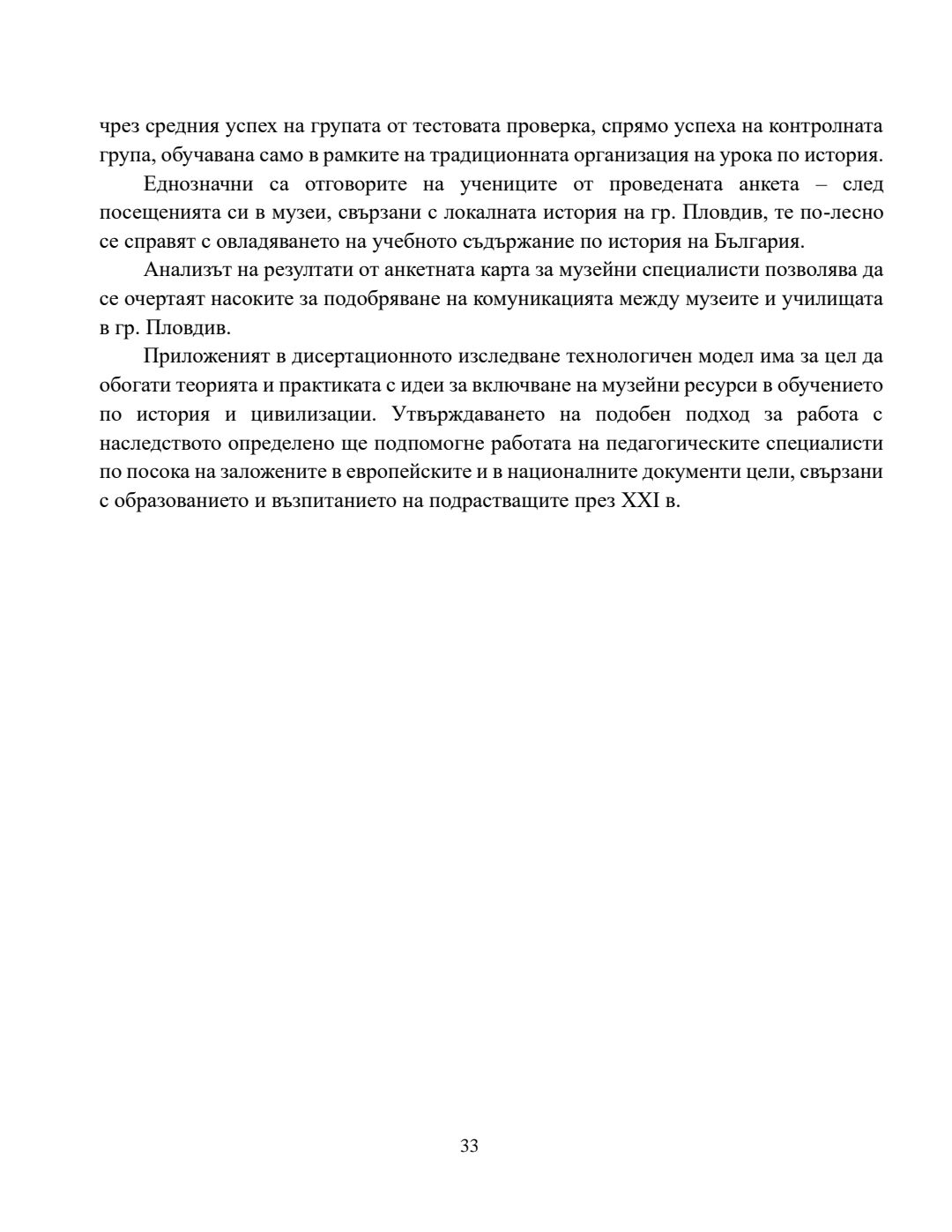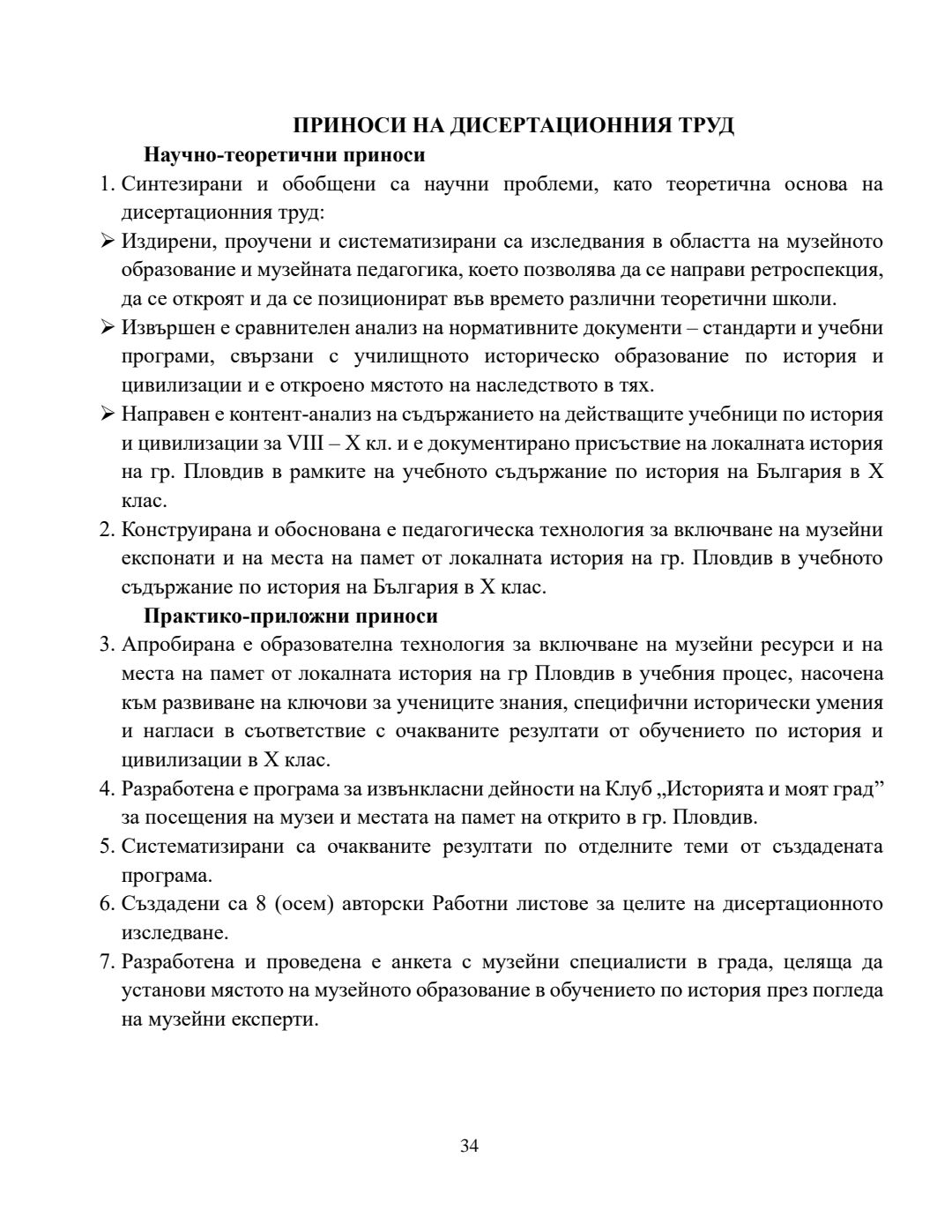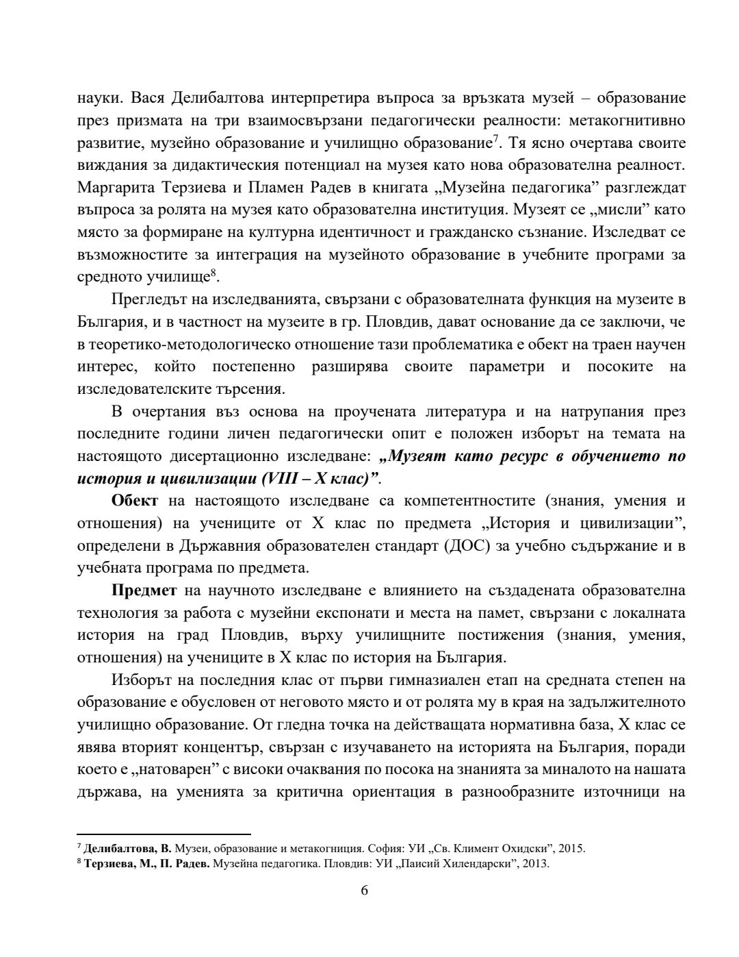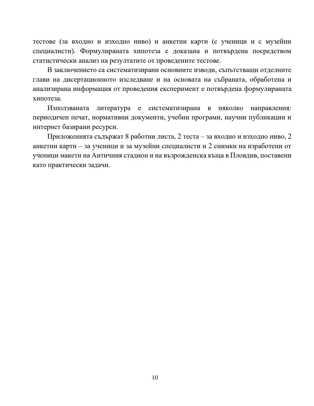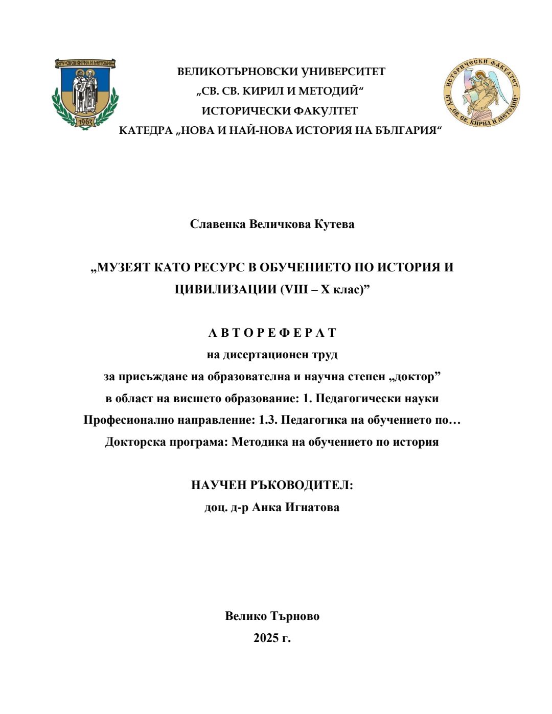 Музеят като ресурс в обучението по история и цивилизации (VIII – X клас) : Автореферат / Славенка Величкова Кутева ; Науч. ръководител Анка Игнатова
