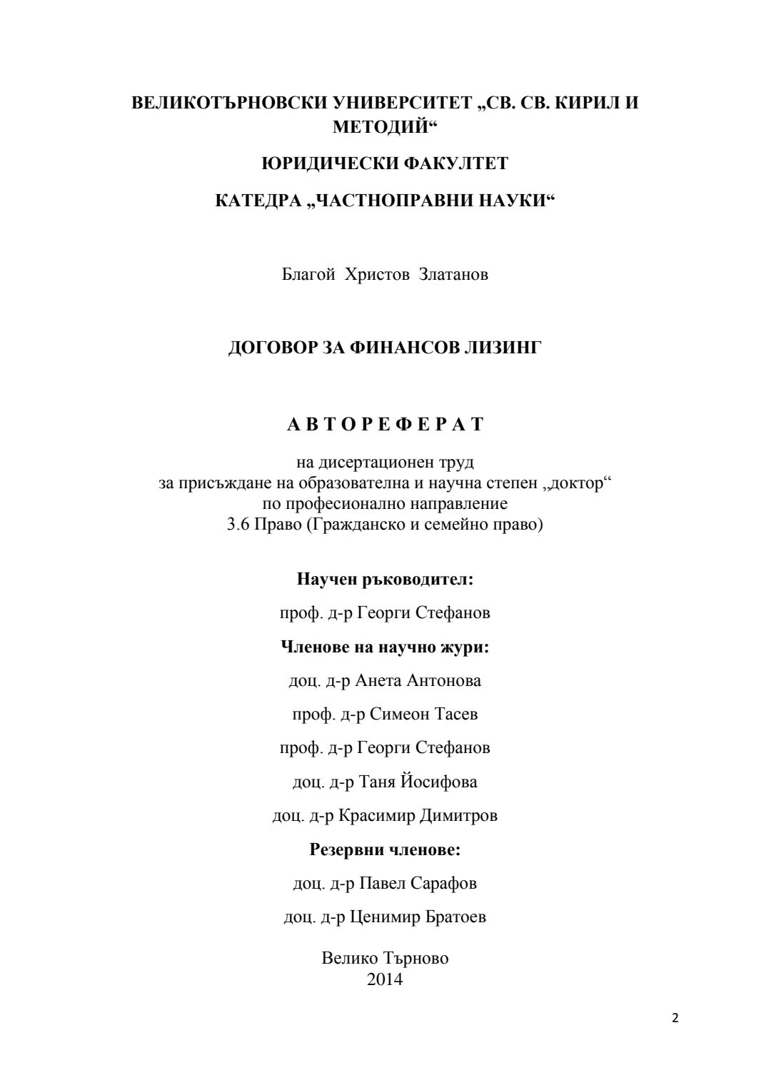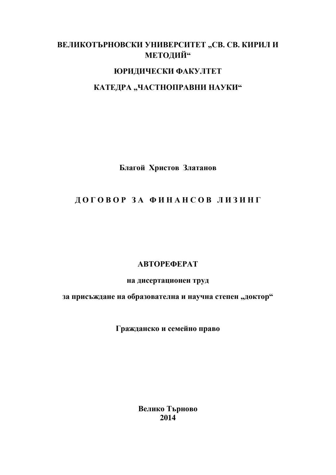 Договор за финансов лизинг : Автореферат / Благой Христов Златанов ; Науч. ръководител Георги Стефанов Иванов