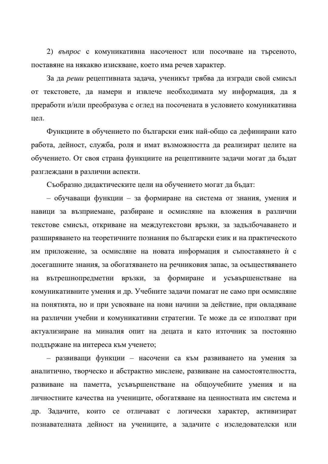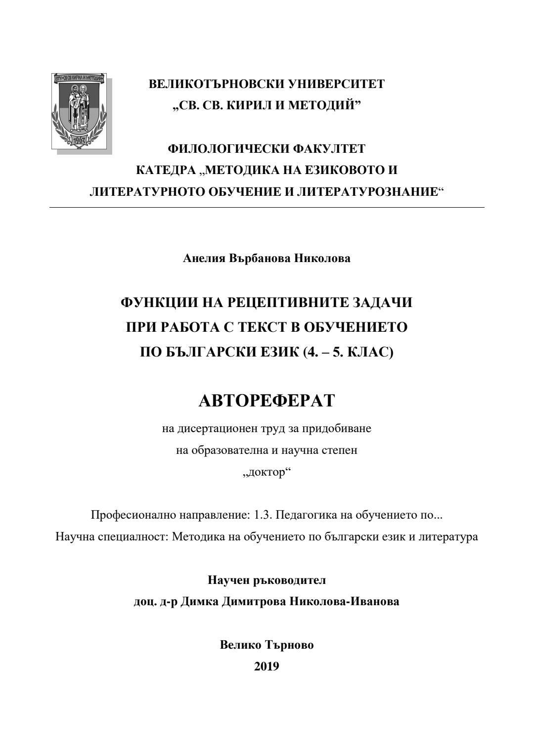 Функции на рецептивните задачи при работа с текст в обучението по български език (4. – 5. клас) : Автореферат / Анелия Върбанова Николова ; Науч. ръководител Димка Димитрова Николова-Иванова