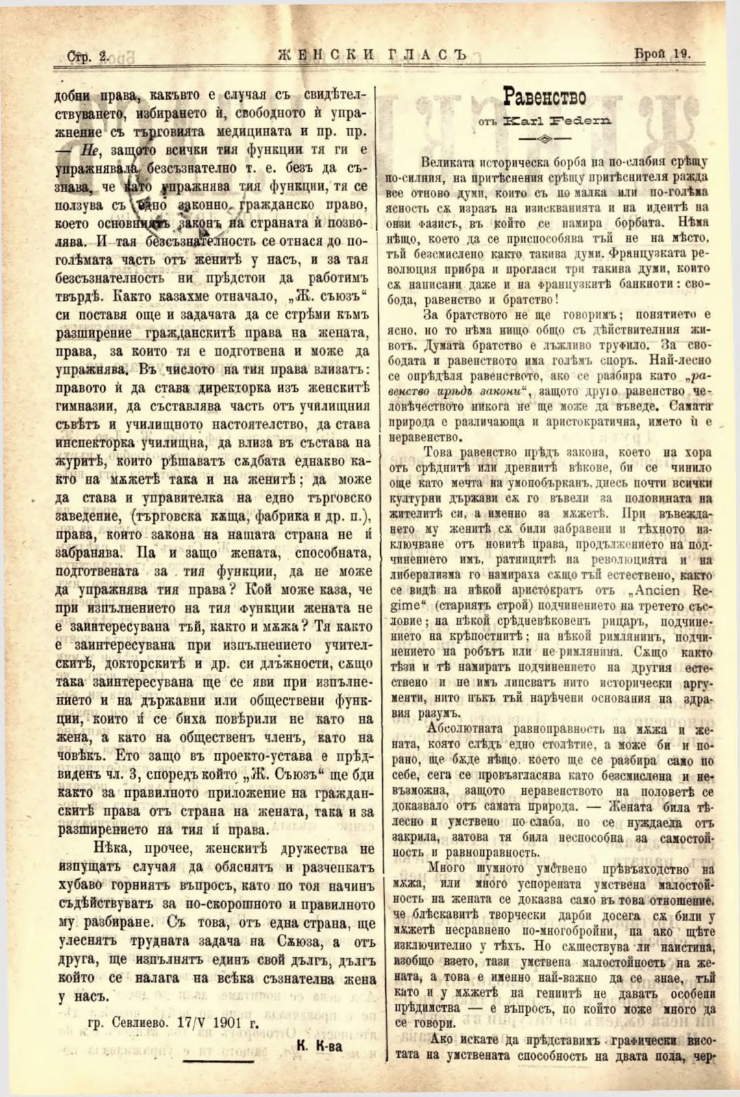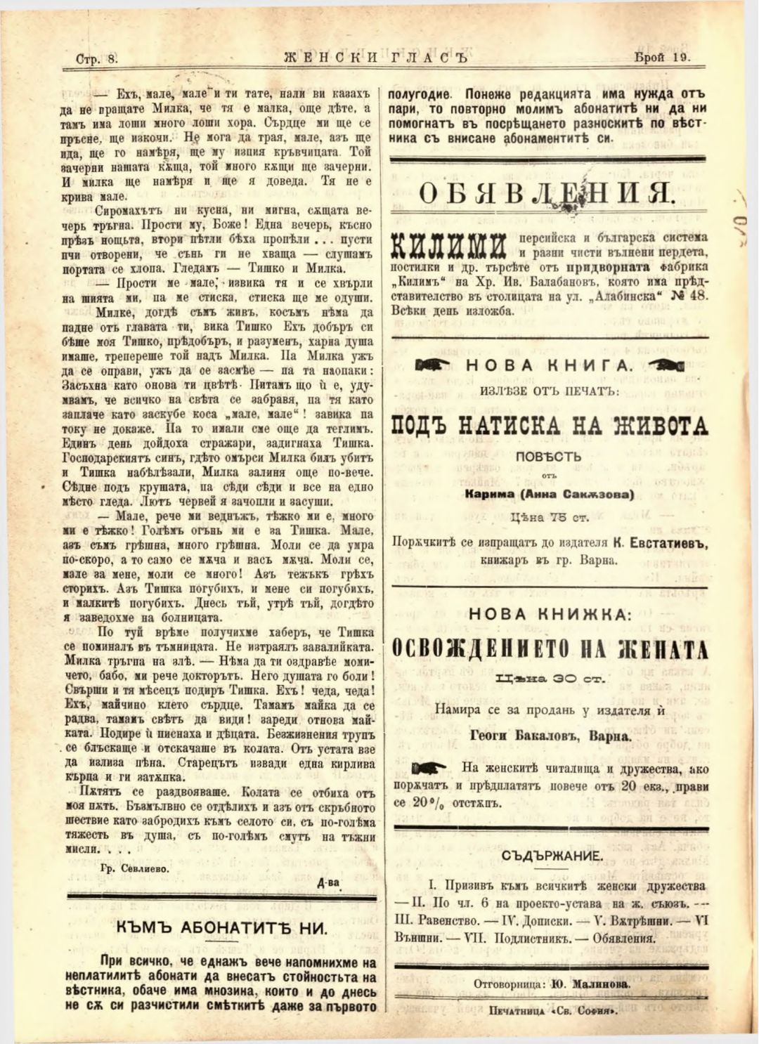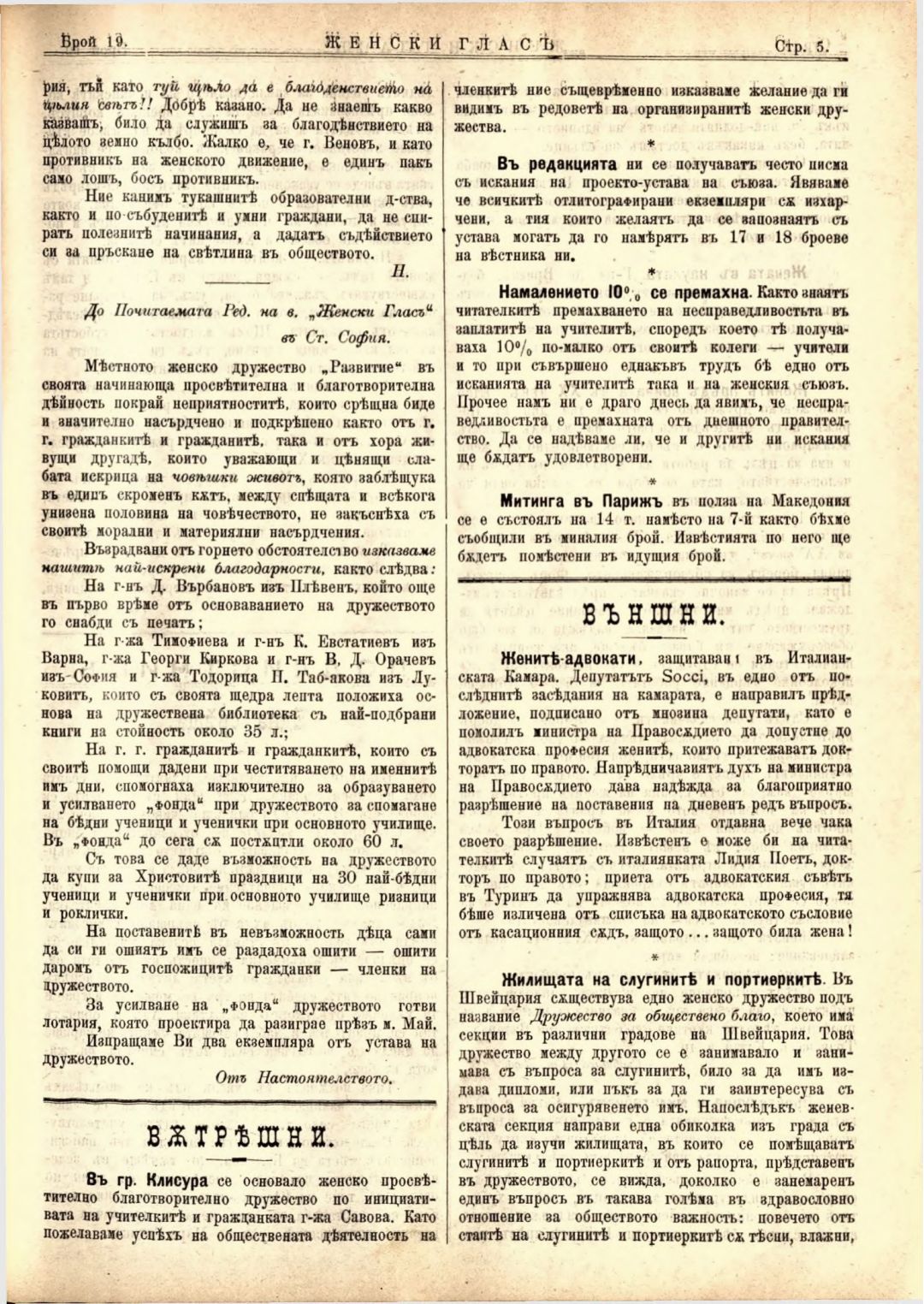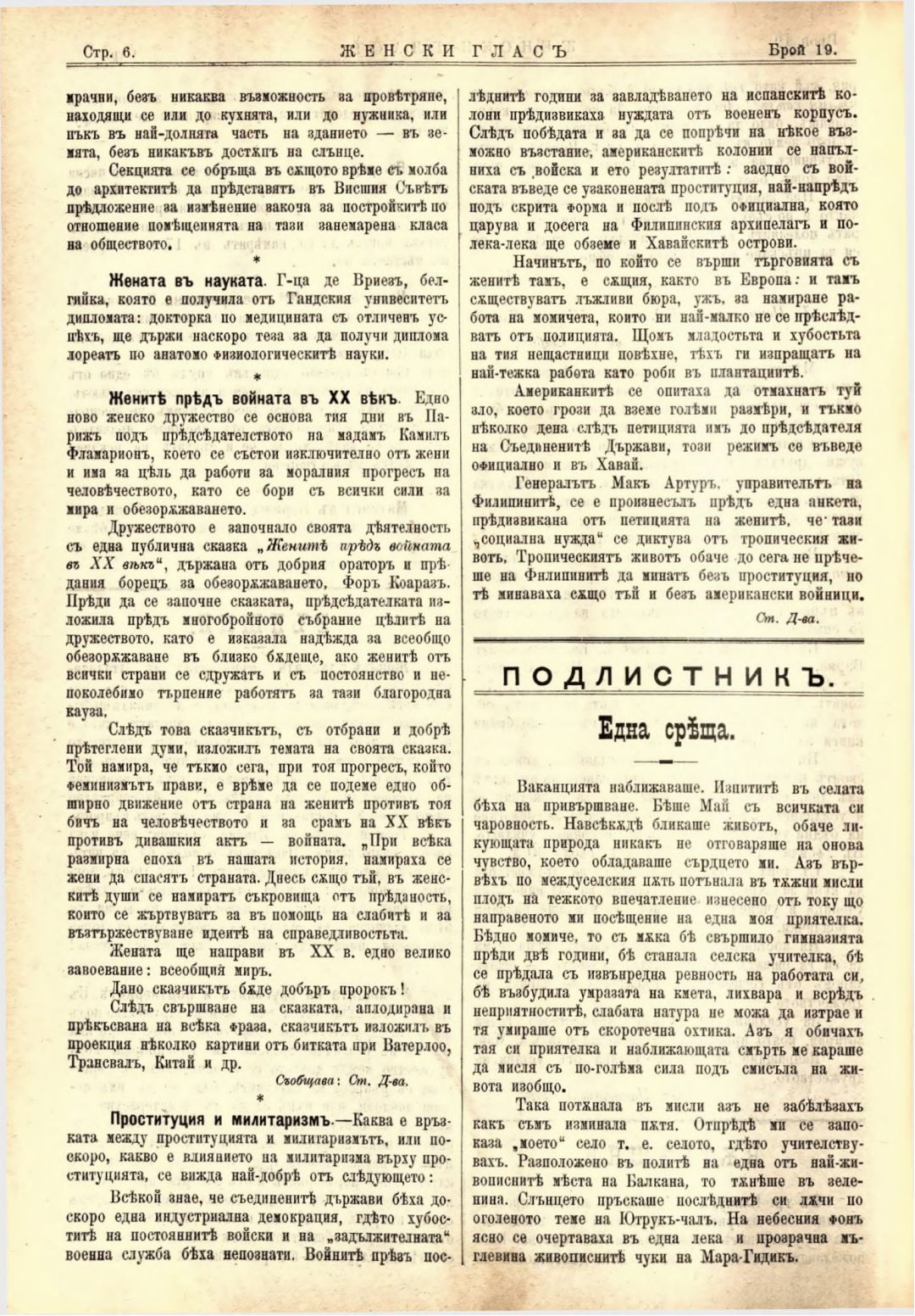 Год. 2,№ 19. Женски глас : Орган на софийското женско образователно дружество