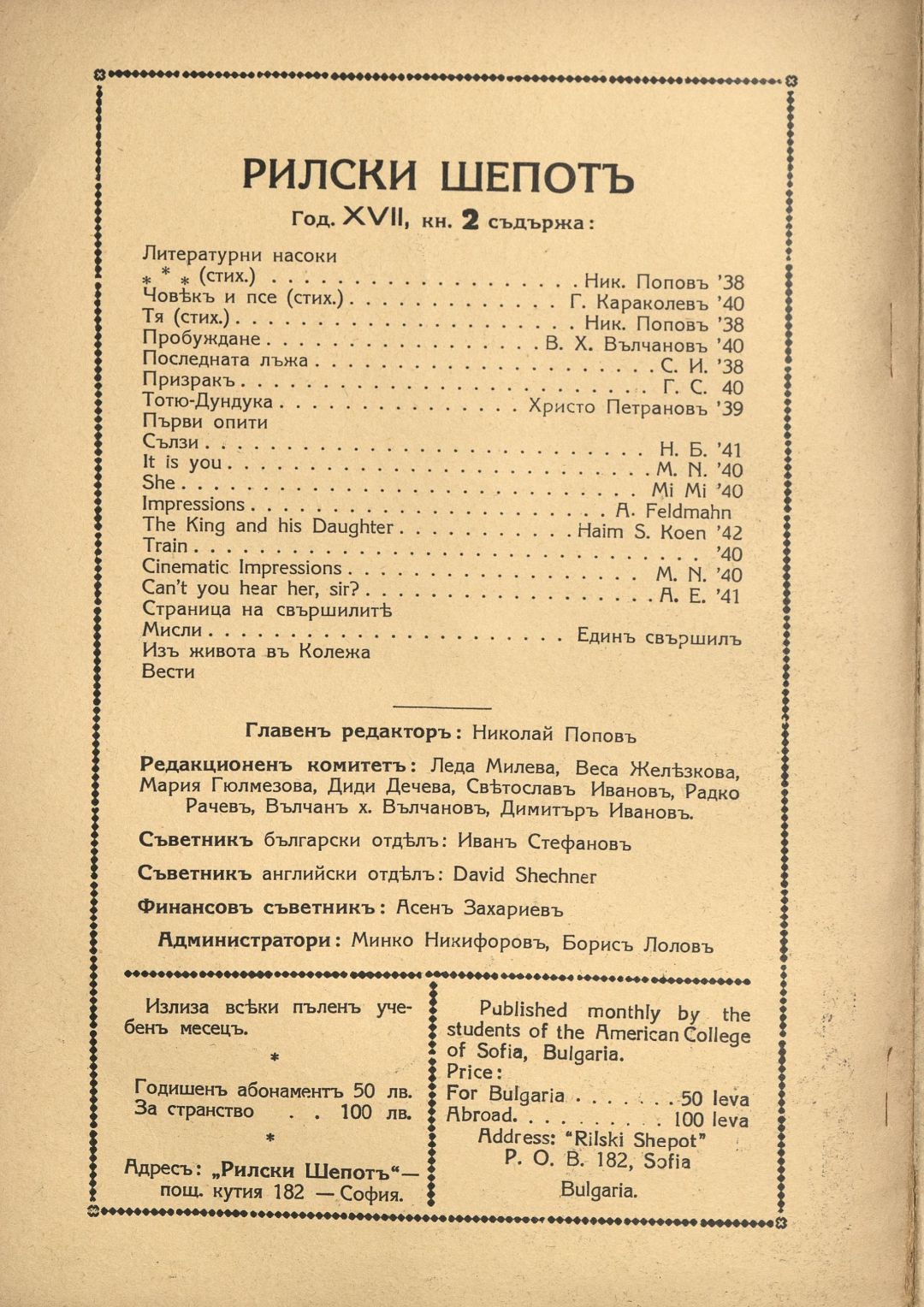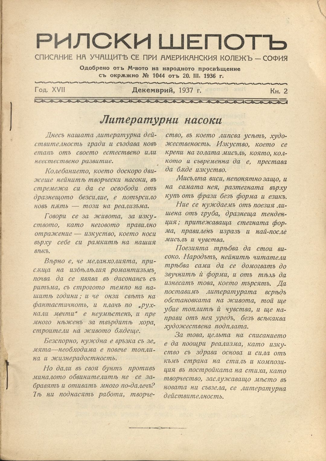 Год. 17, Кн. 2. Рилски шепот : Орган на учащите се при Американския колеж - София / Американски колеж - София