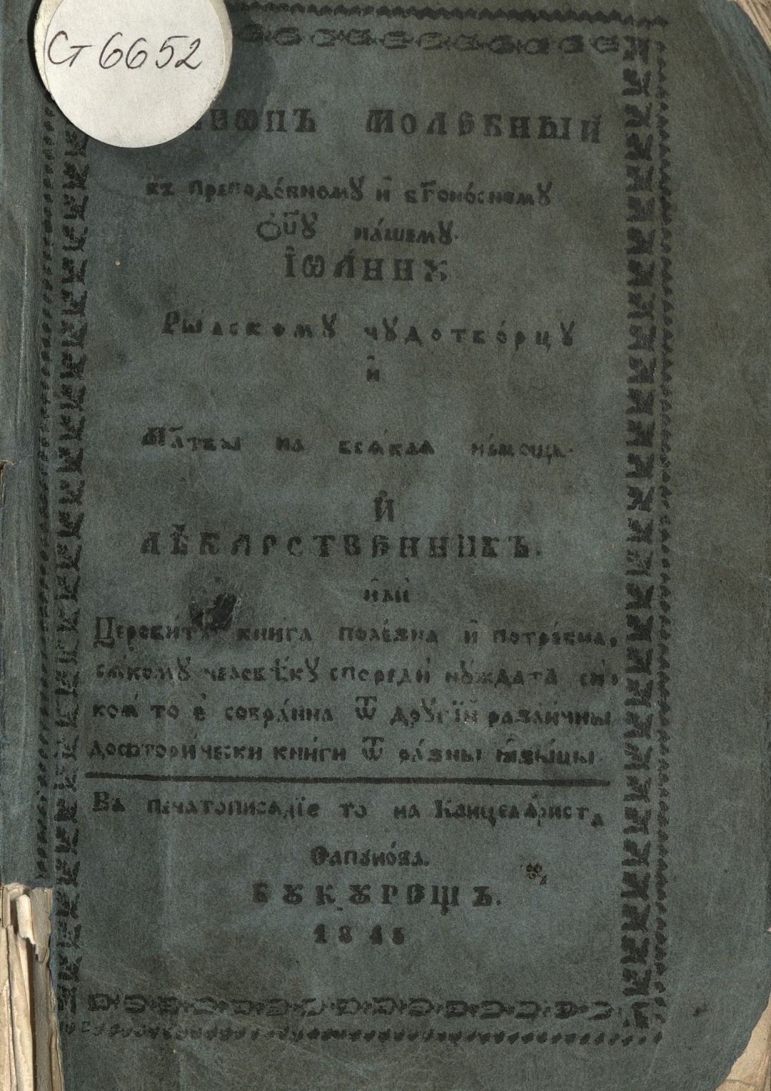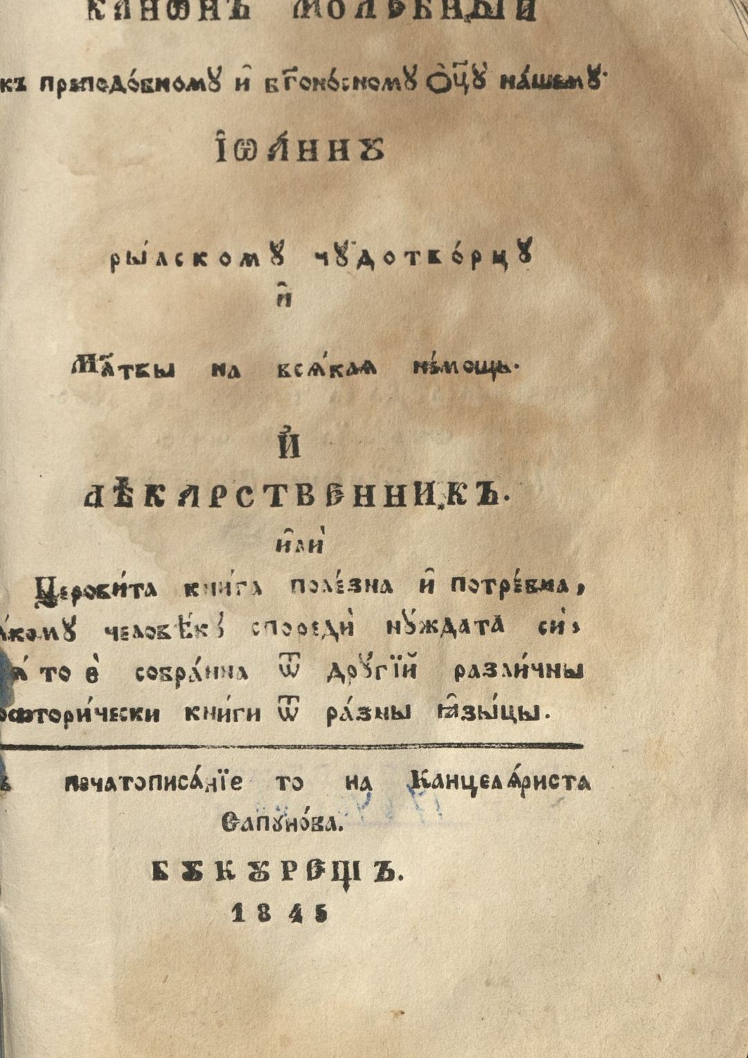 Канон молебний к преподобному и богоносному отцу нашему Йоанну Рилскому чудотворцу и молитви на всякая немощ и лекарственик : или церовита книга полезна и потребна сякому человеку спореди нуждата си, която е собрана от другий различни дофторически книги от разни язици