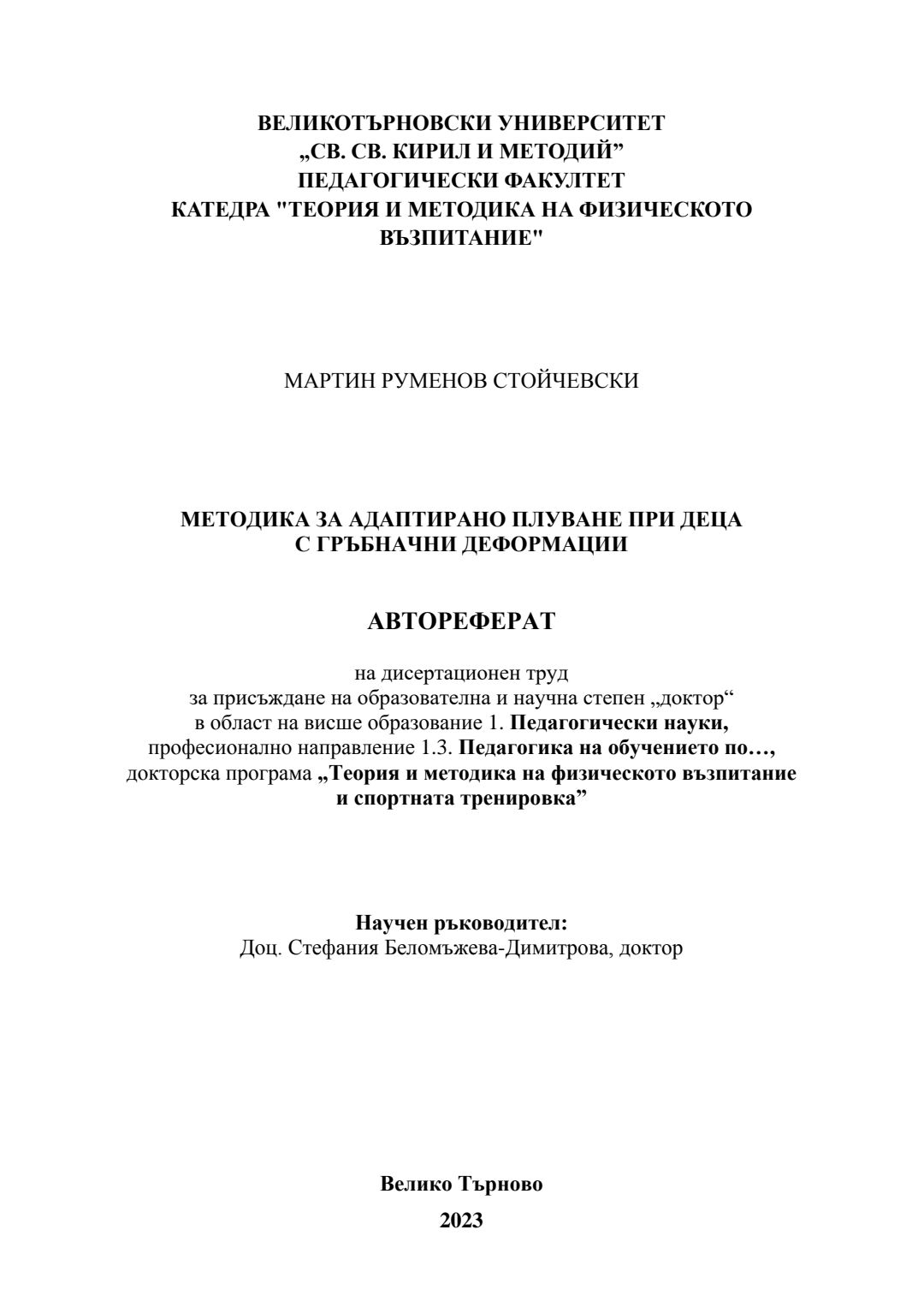 Методика за адаптирано плуване при деца с гръбначни деформации : Автореферат / Мартин Руменов Стойчевски ; Науч. ръководител Стефания Беломъжева-Димитрова