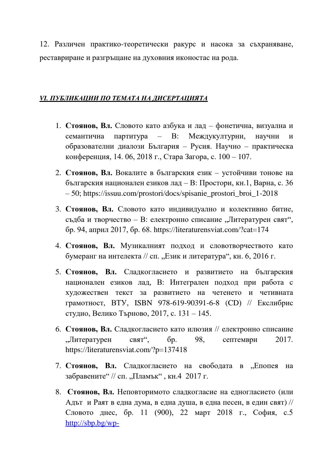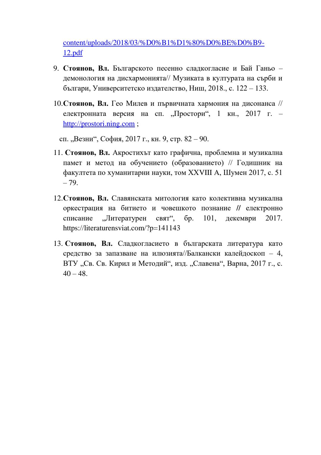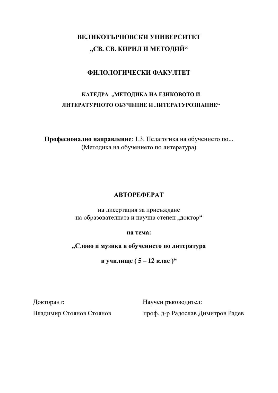 Слово и музика в обучението по литература в училище (5 – 12 клас) : Автореферат / Владимир Стоянов Стоянов ; Науч. ръководител Радослав Димитров Радев