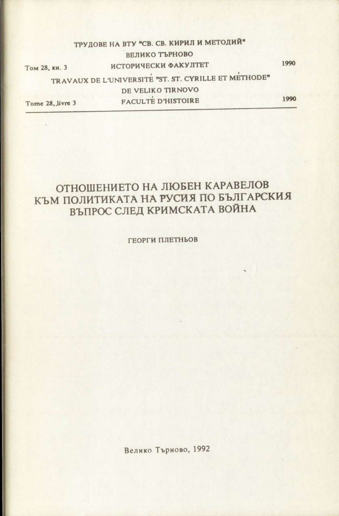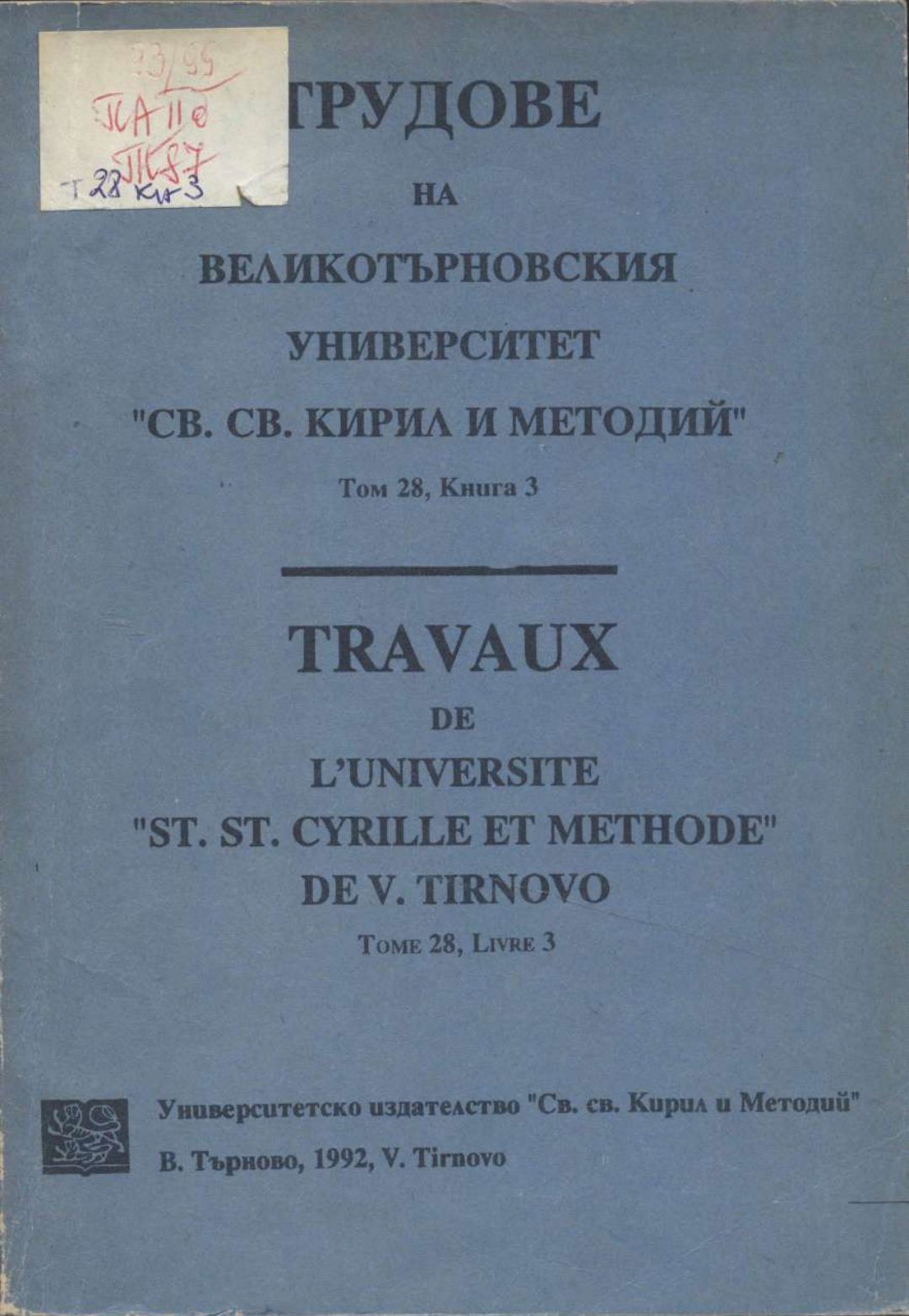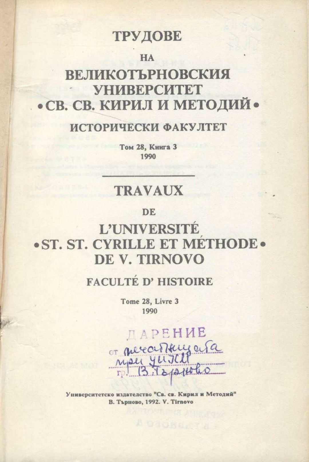 Том 28. Кн. 3. Трудове на Великотърновския университет "Св. св. Кирил и Методий". Исторически факултет = Travaux de L'universite St. St. Cyrille et Methode de V. Tirnovo. Faculte histoire