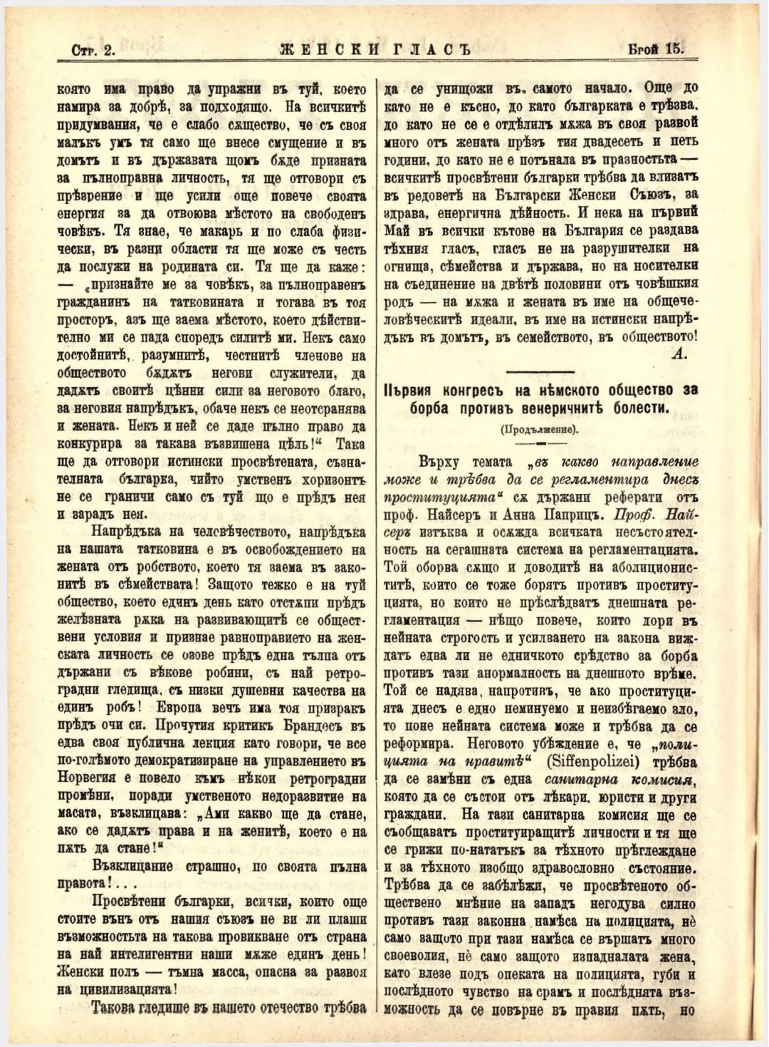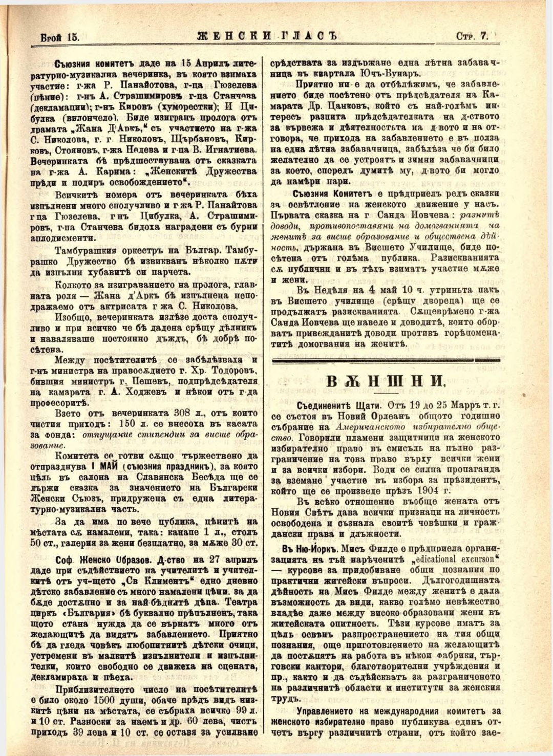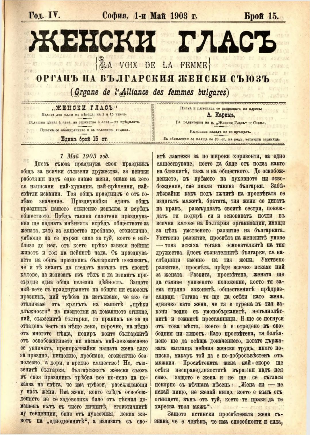 Год. 4,№ 15 Женски глас : Орган на българския женски съюз