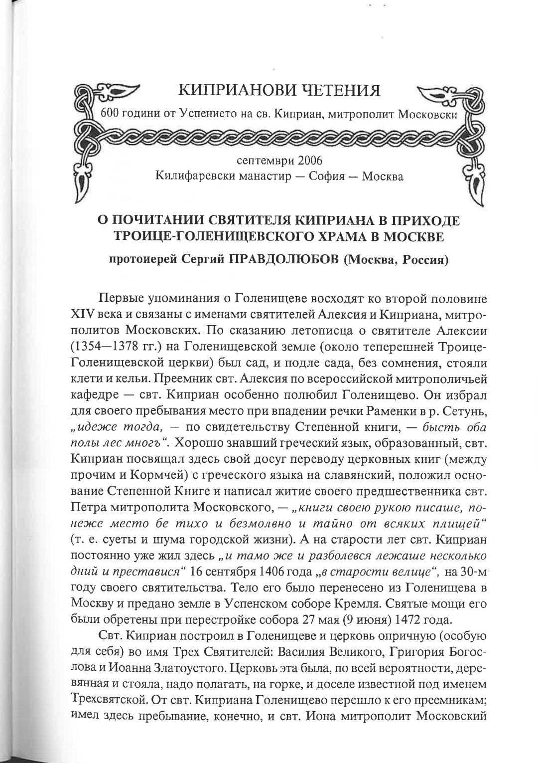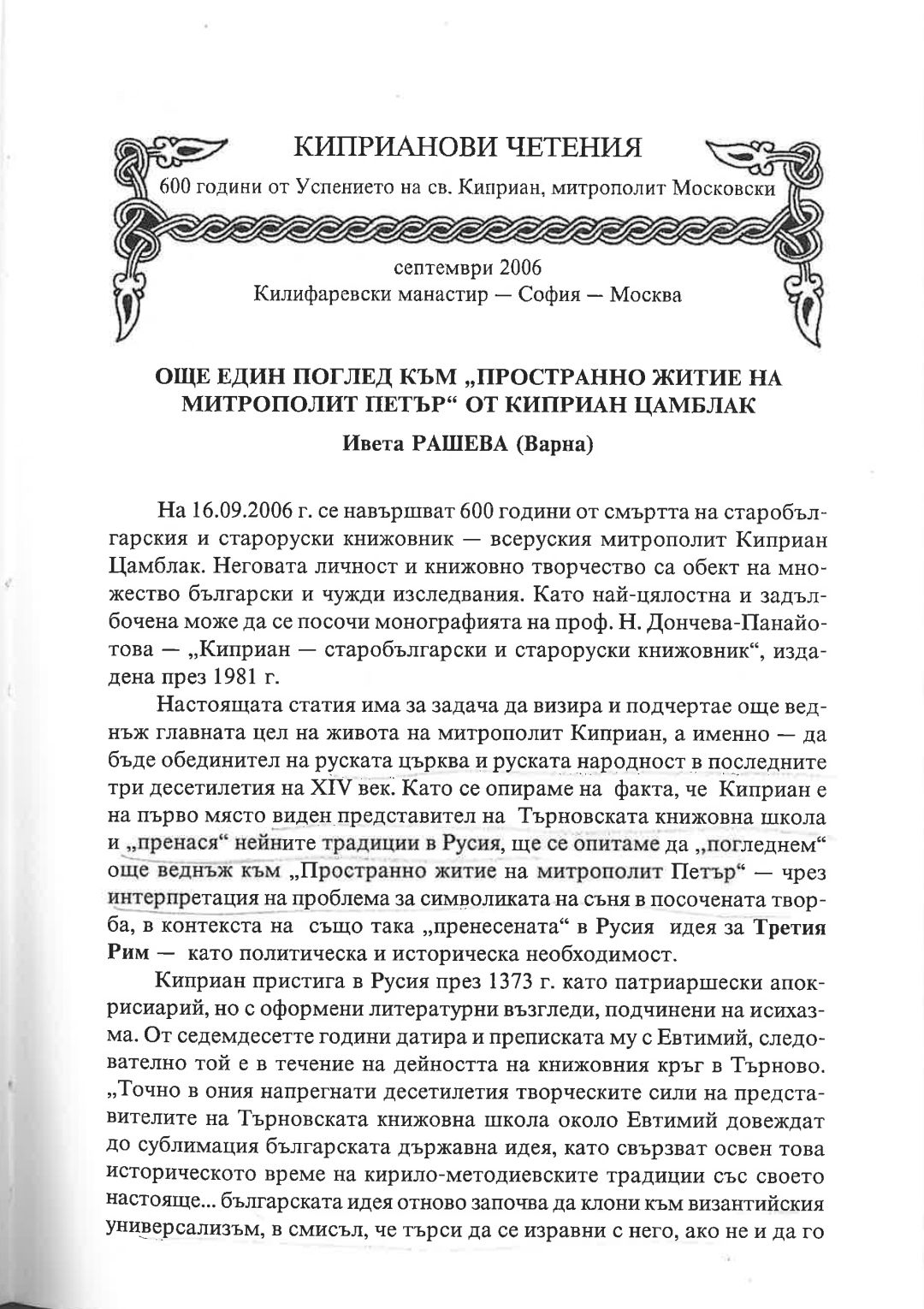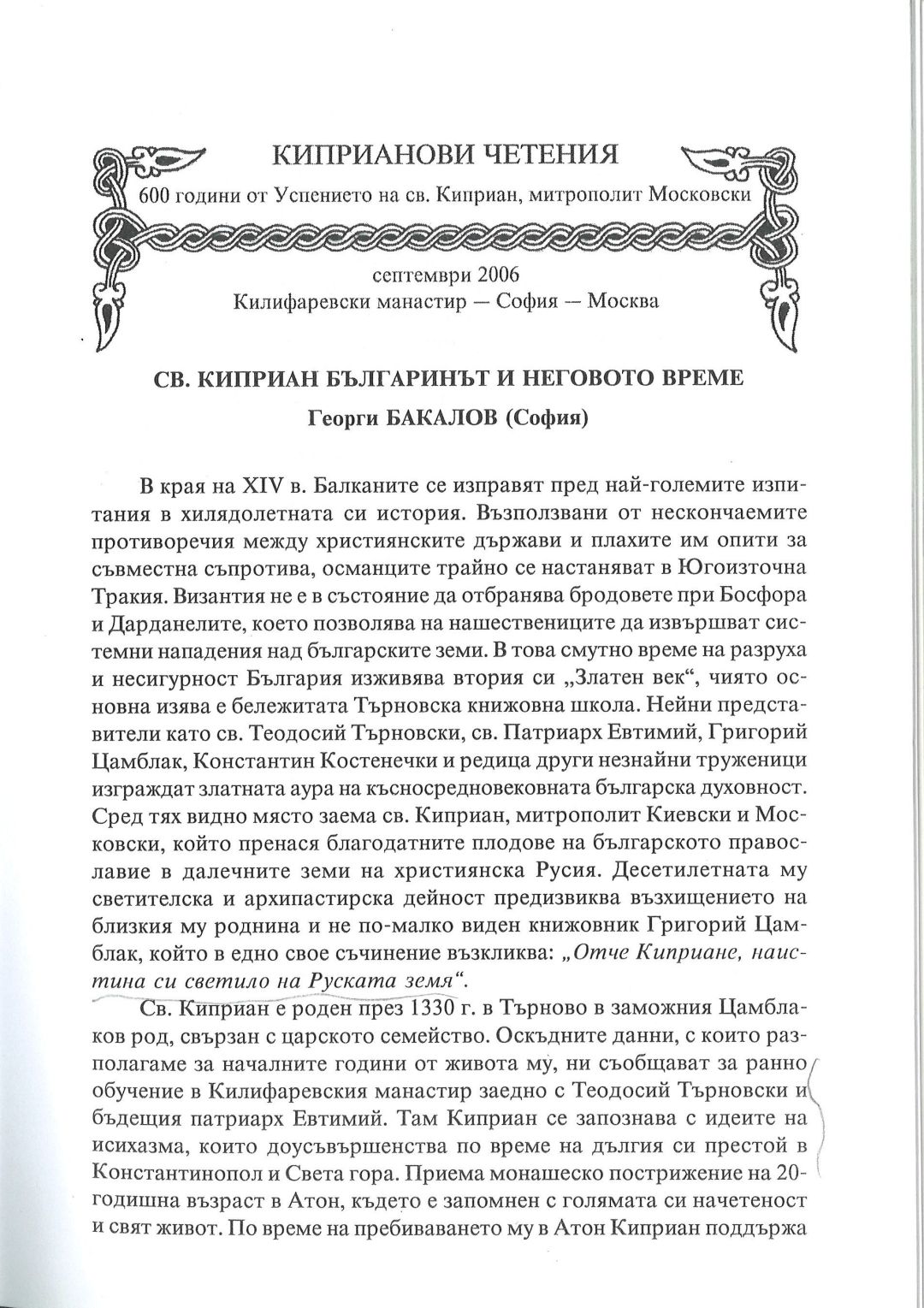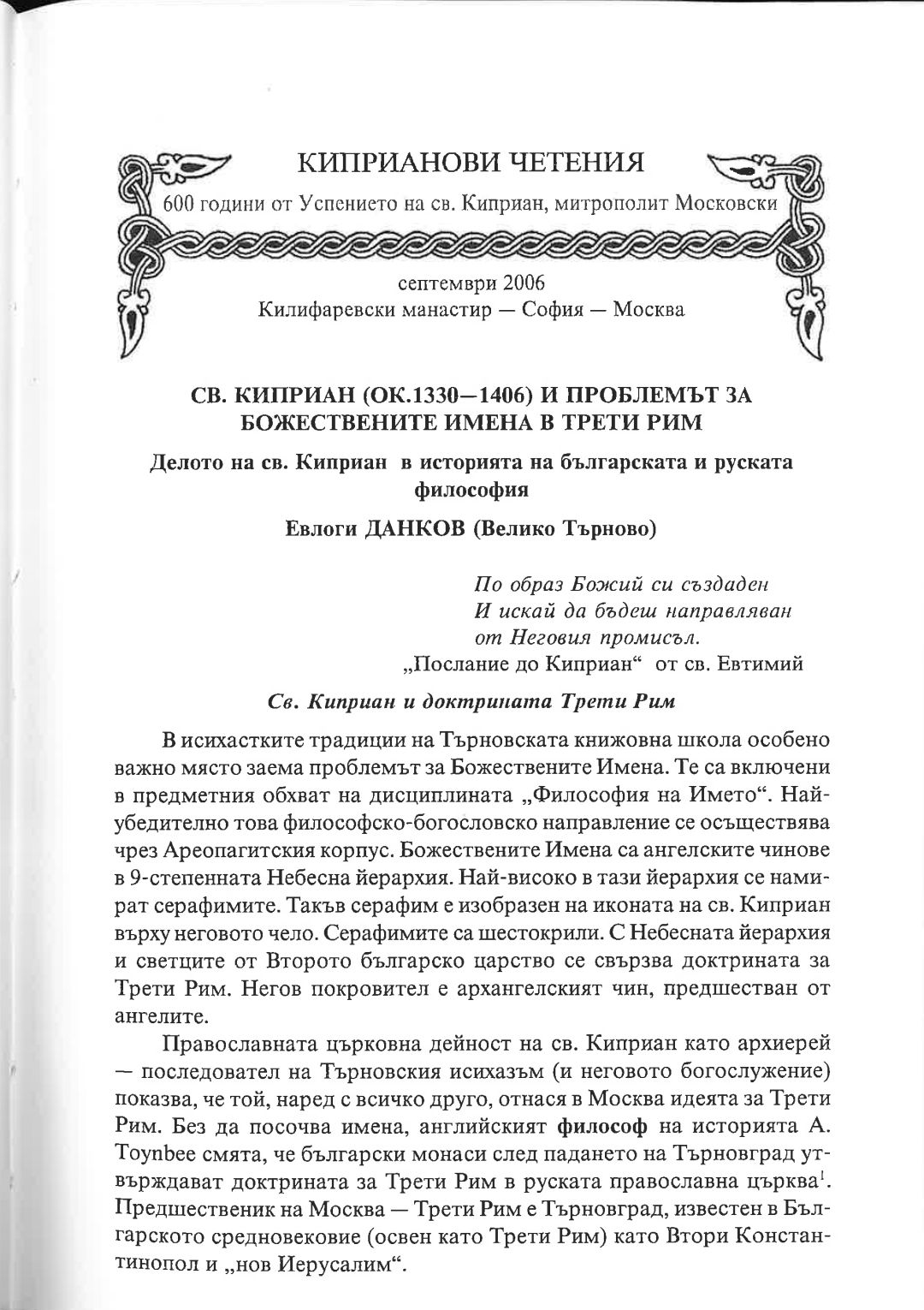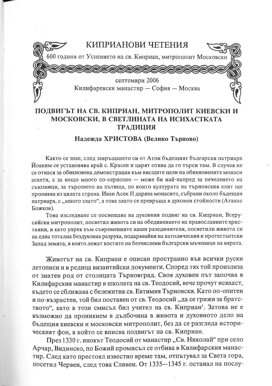 Киприанови четения : 600 години от успението на Св. Киприан, митрополит Московски, септември 2006 г. Калифаревски манастир "Рождество Богородично" - София - Москва : Научен сборник