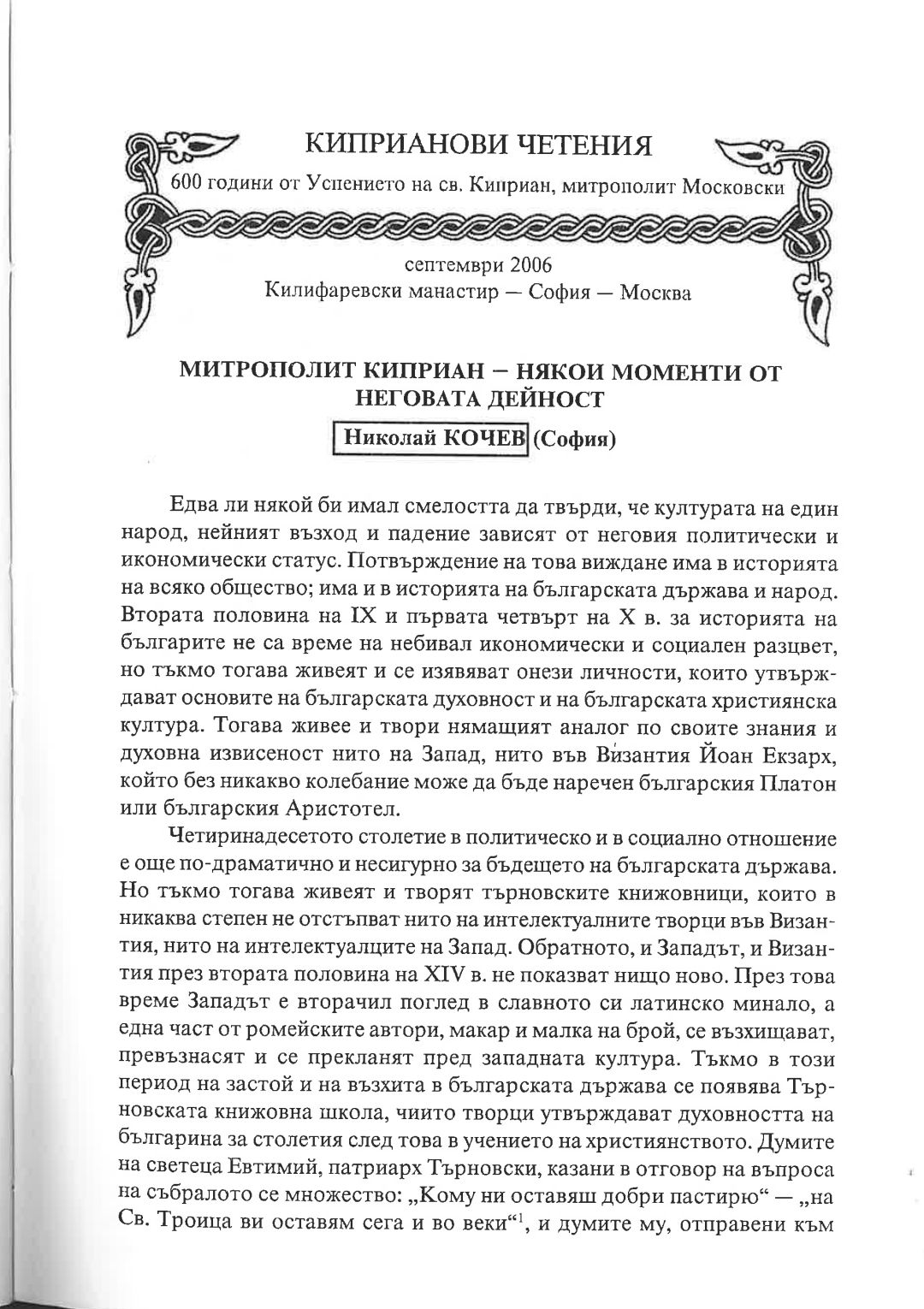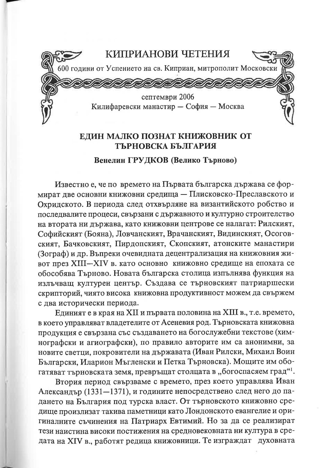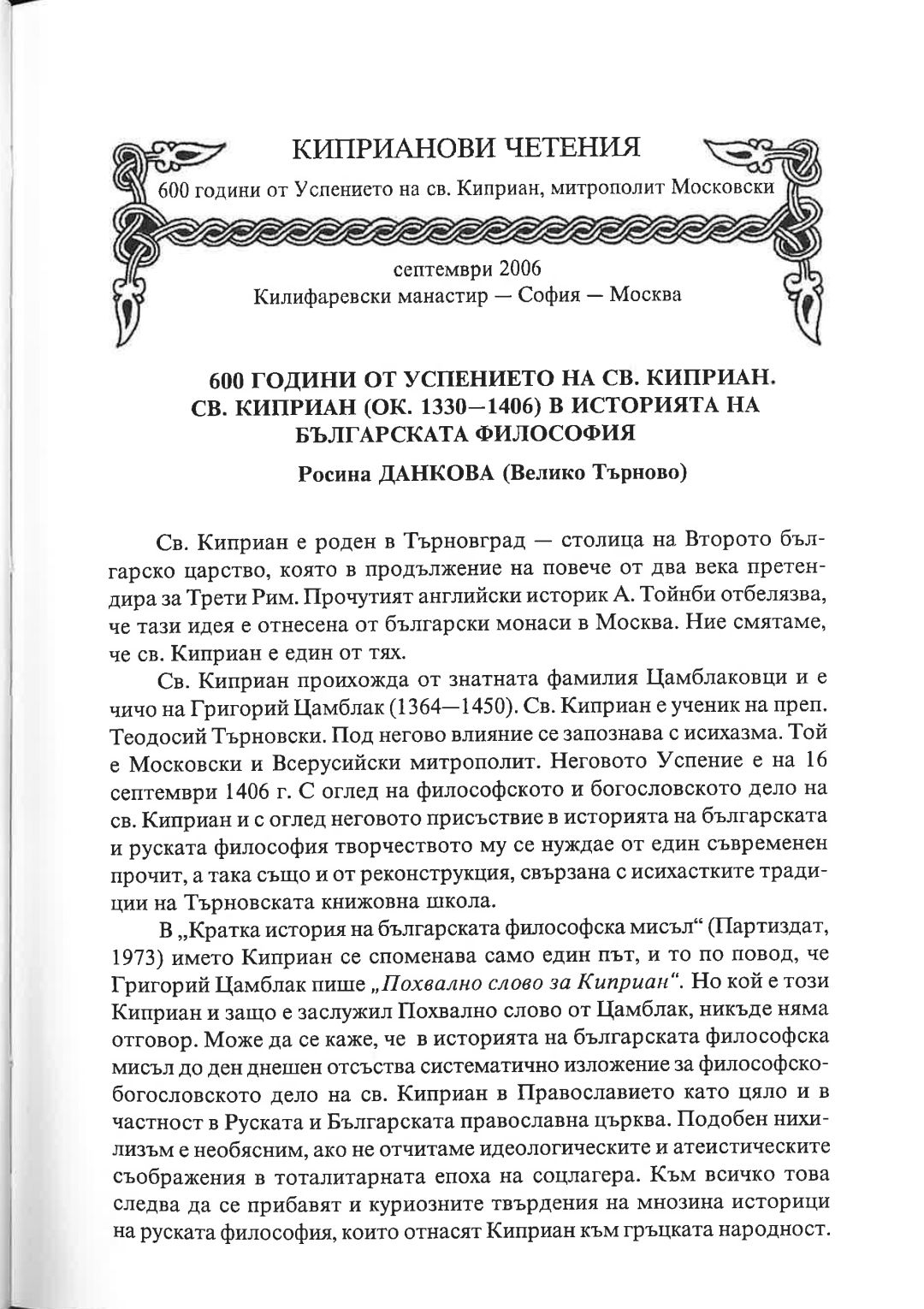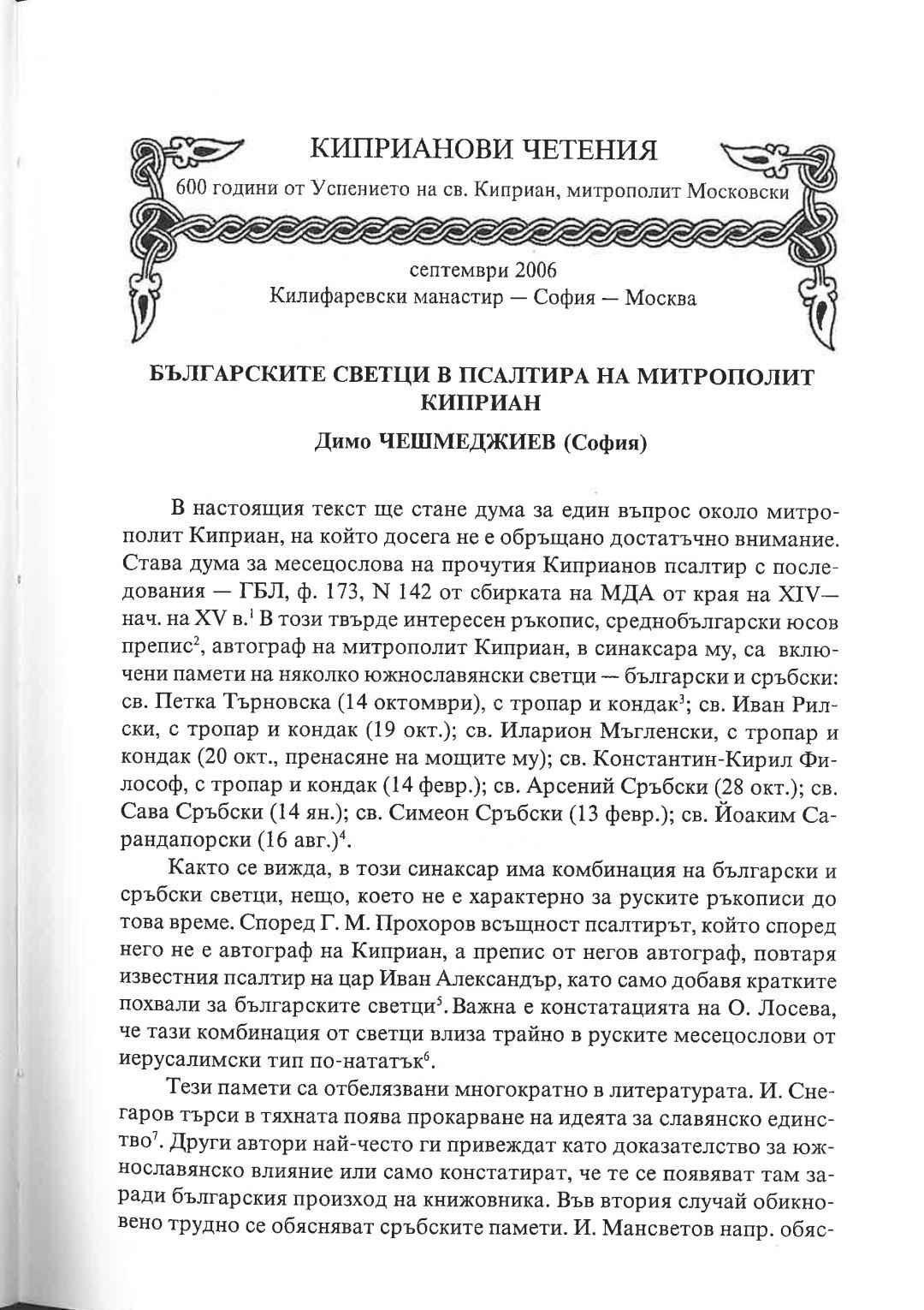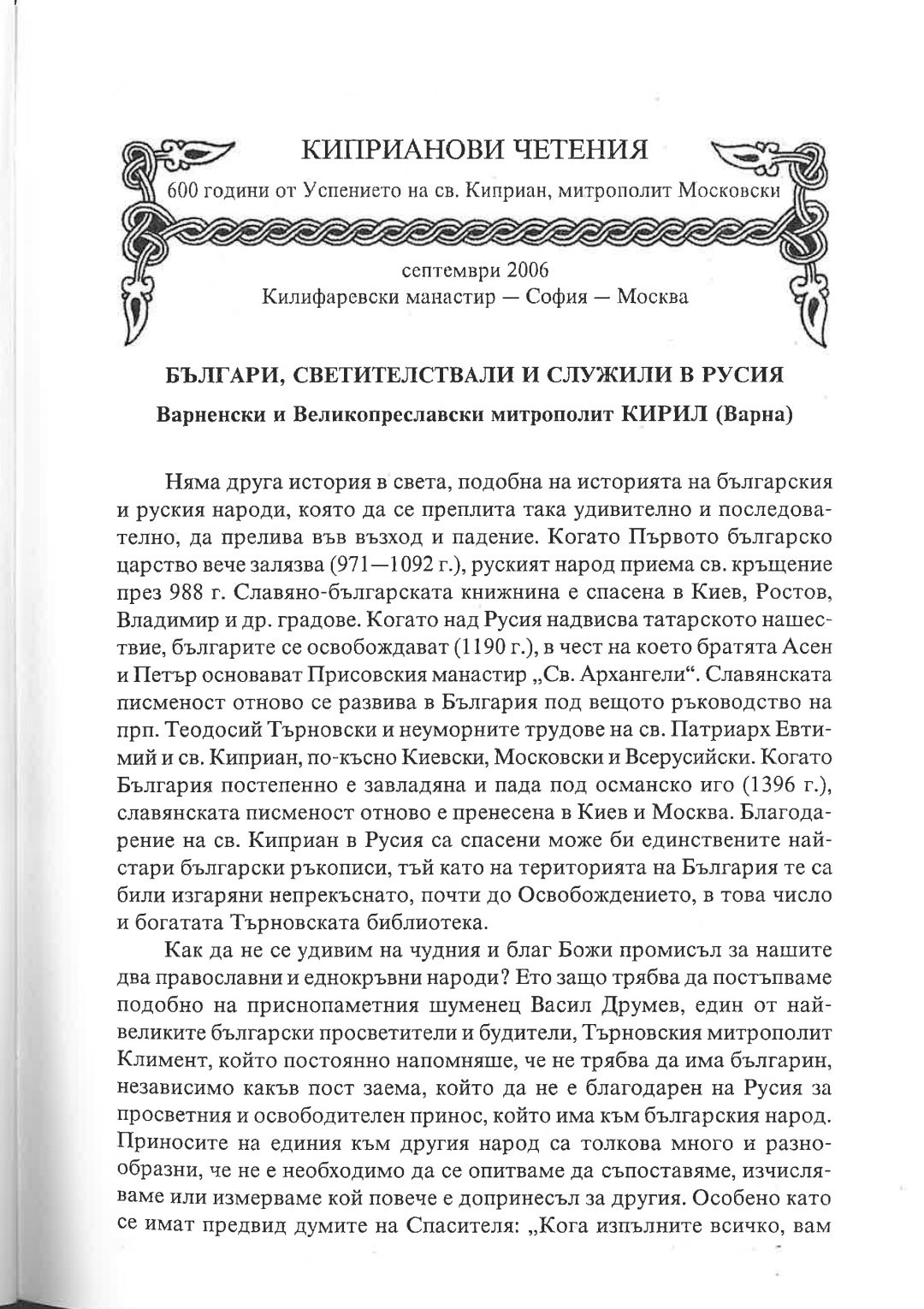 Киприанови четения : 600 години от успението на Св. Киприан, митрополит Московски, септември 2006 г. Калифаревски манастир "Рождество Богородично" - София - Москва : Научен сборник
