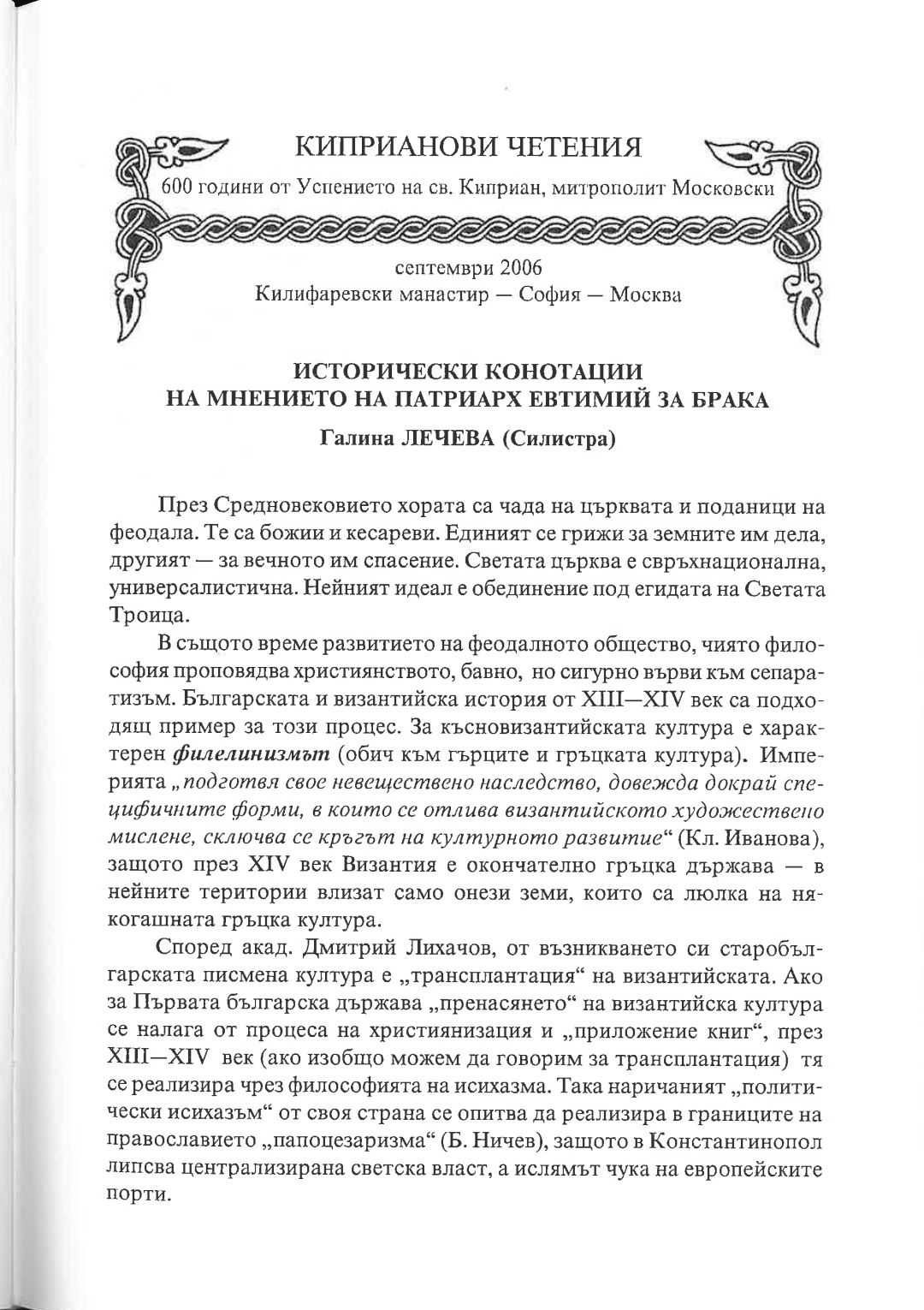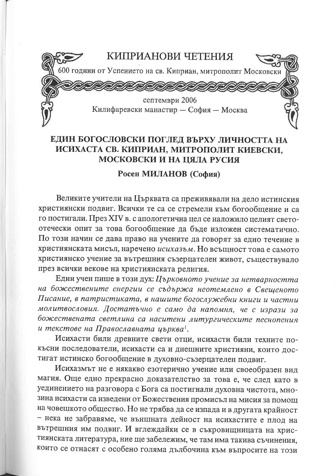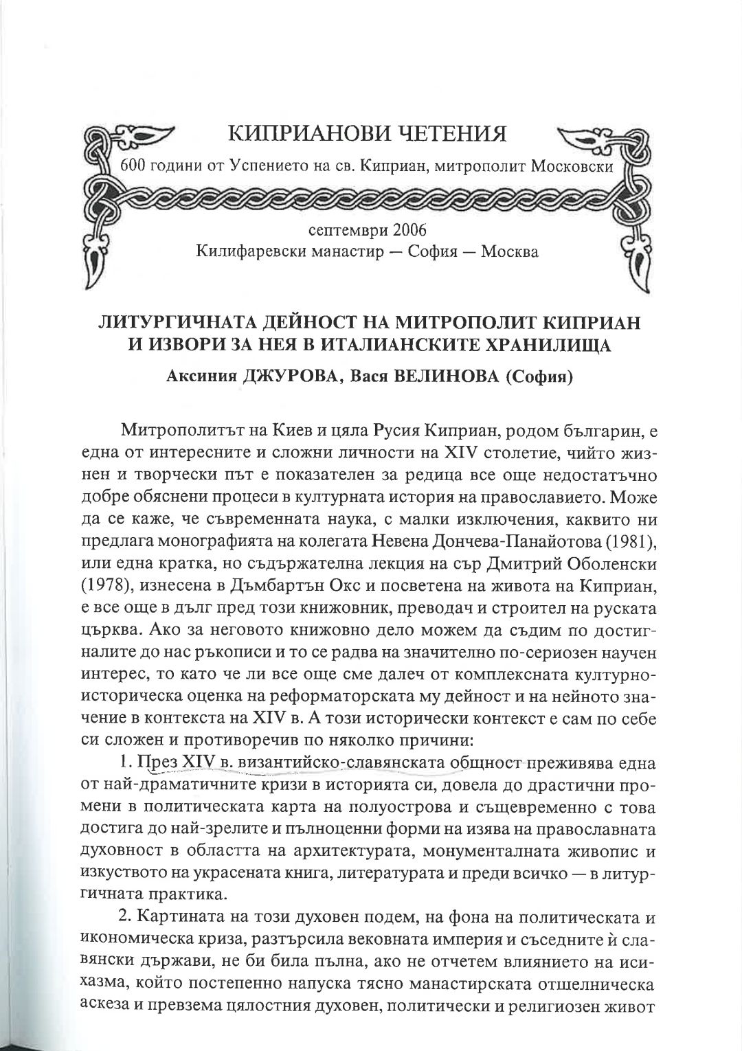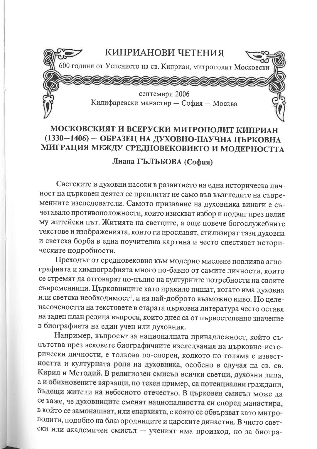 Киприанови четения : 600 години от успението на Св. Киприан, митрополит Московски, септември 2006 г. Калифаревски манастир "Рождество Богородично" - София - Москва : Научен сборник