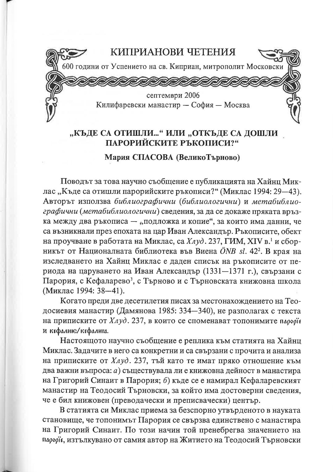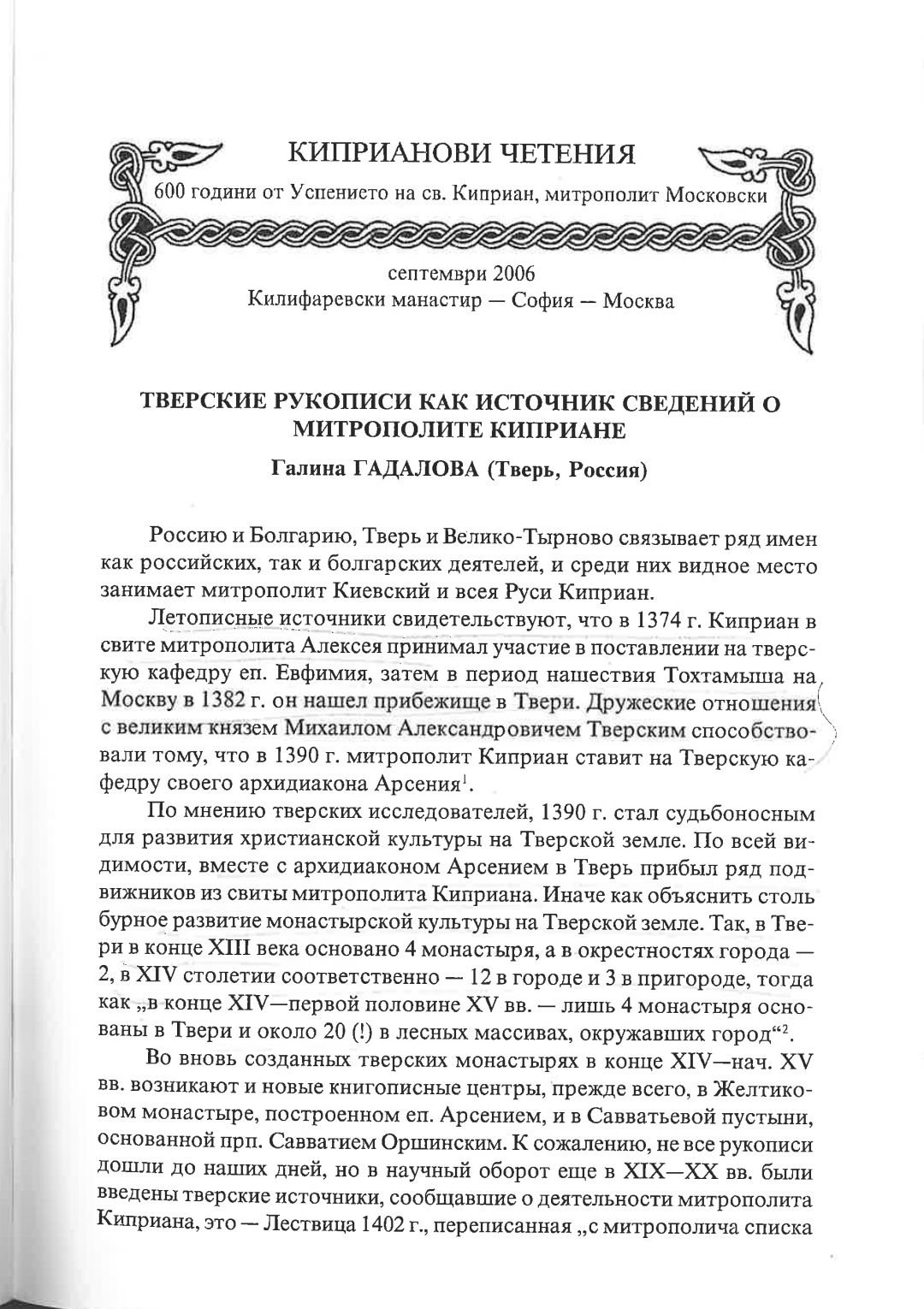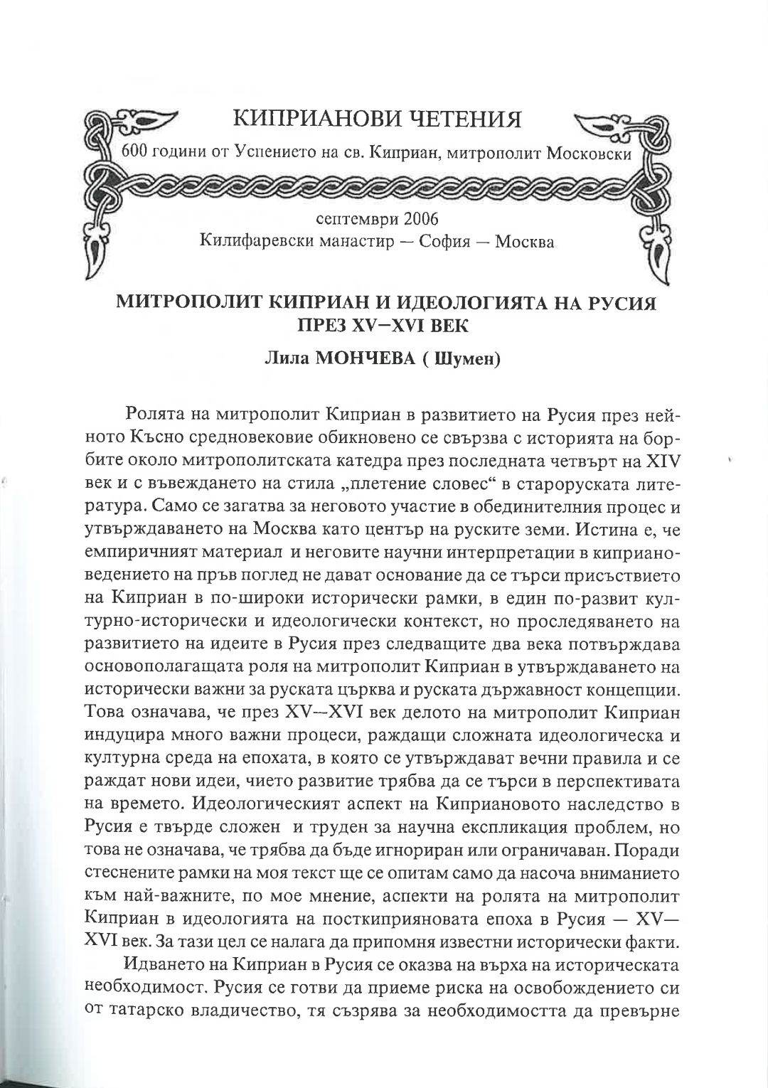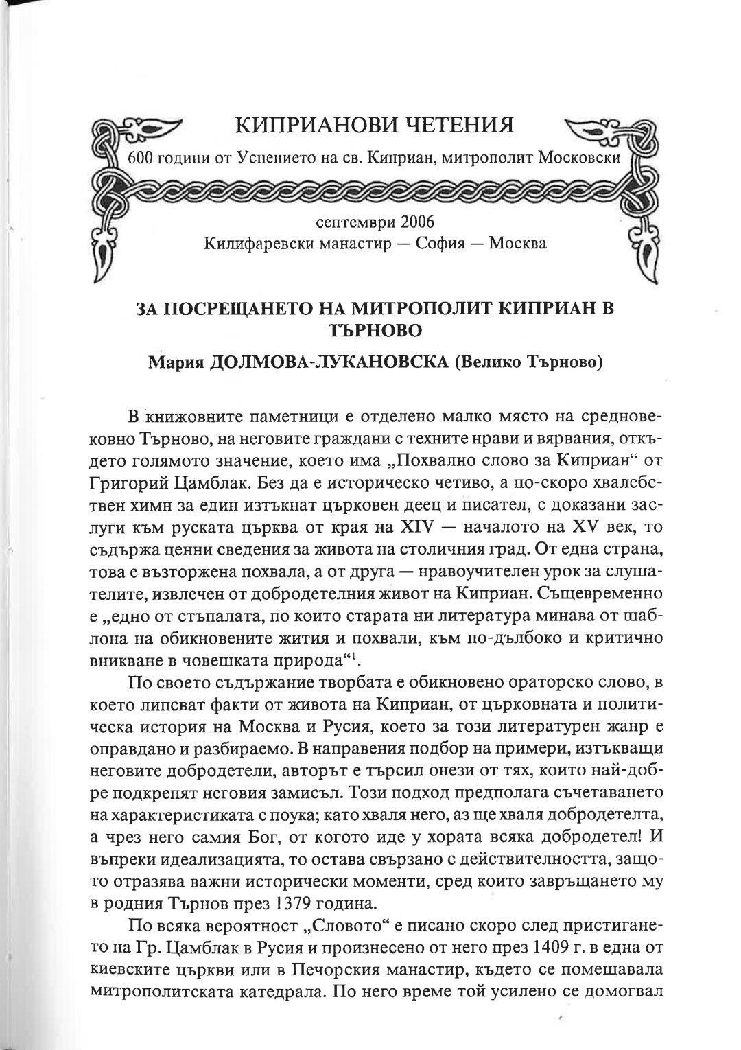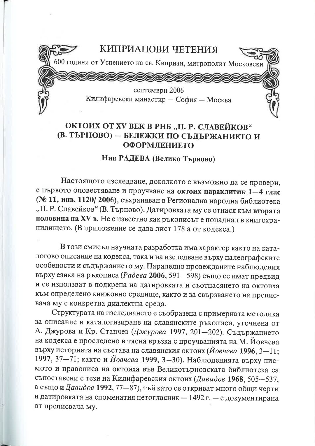 Киприанови четения : 600 години от успението на Св. Киприан, митрополит Московски, септември 2006 г. Калифаревски манастир "Рождество Богородично" - София - Москва : Научен сборник