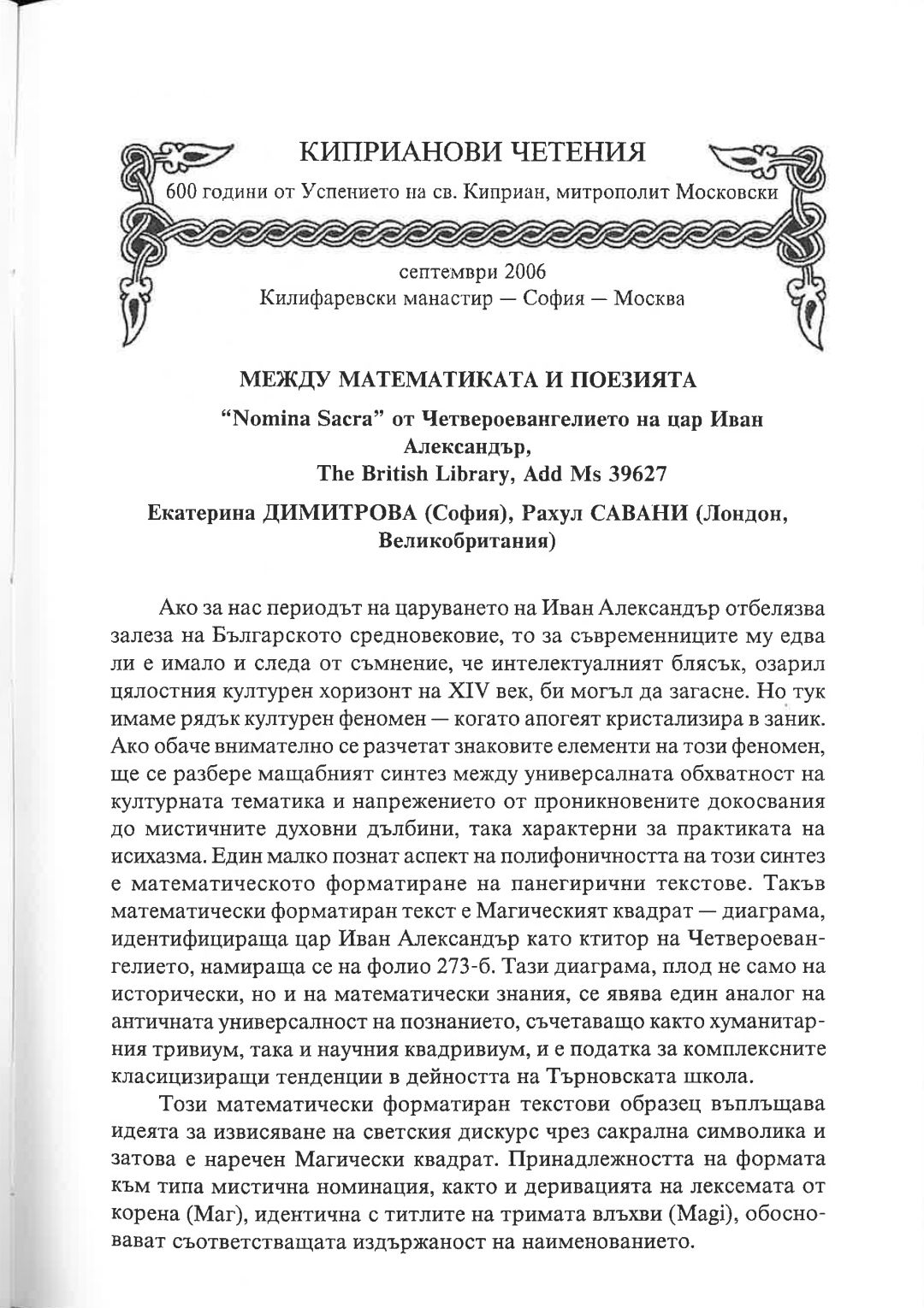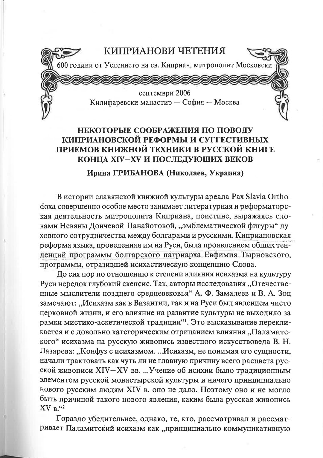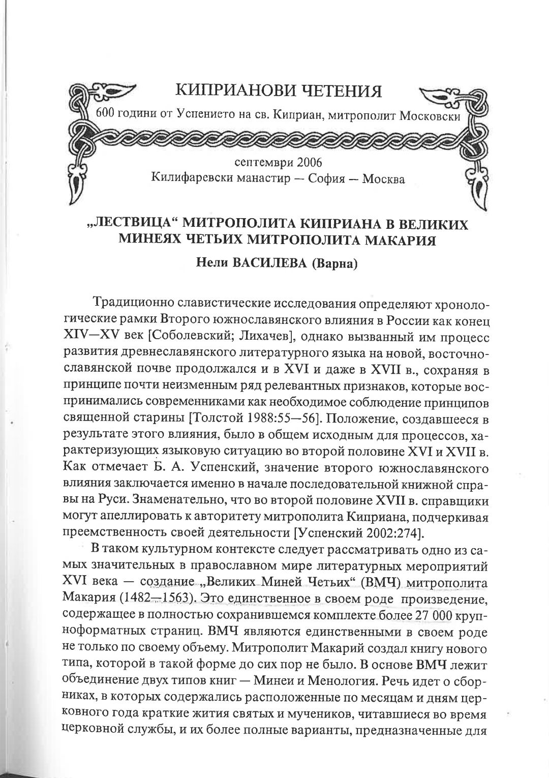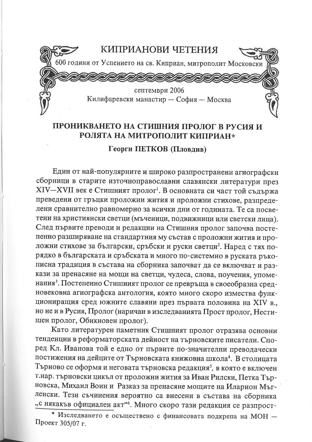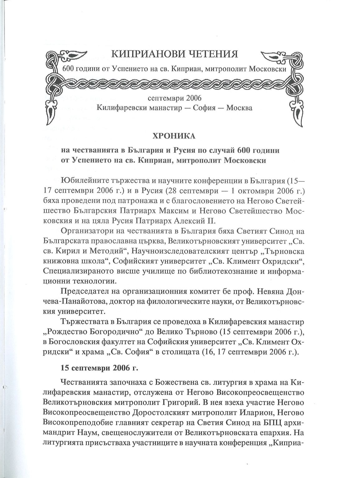 Киприанови четения : 600 години от успението на Св. Киприан, митрополит Московски, септември 2006 г. Калифаревски манастир "Рождество Богородично" - София - Москва : Научен сборник