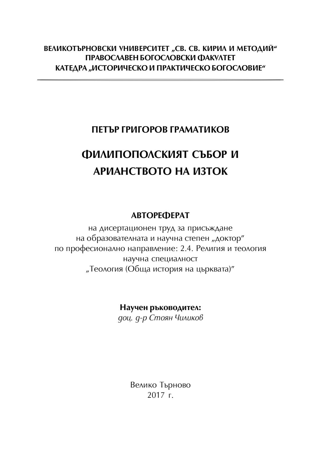 Филипополският събор и арианството на Изток : Автореферат / йеродякон Петър Григоров Граматиков ; Науч. ръководител Стоян Чиликов