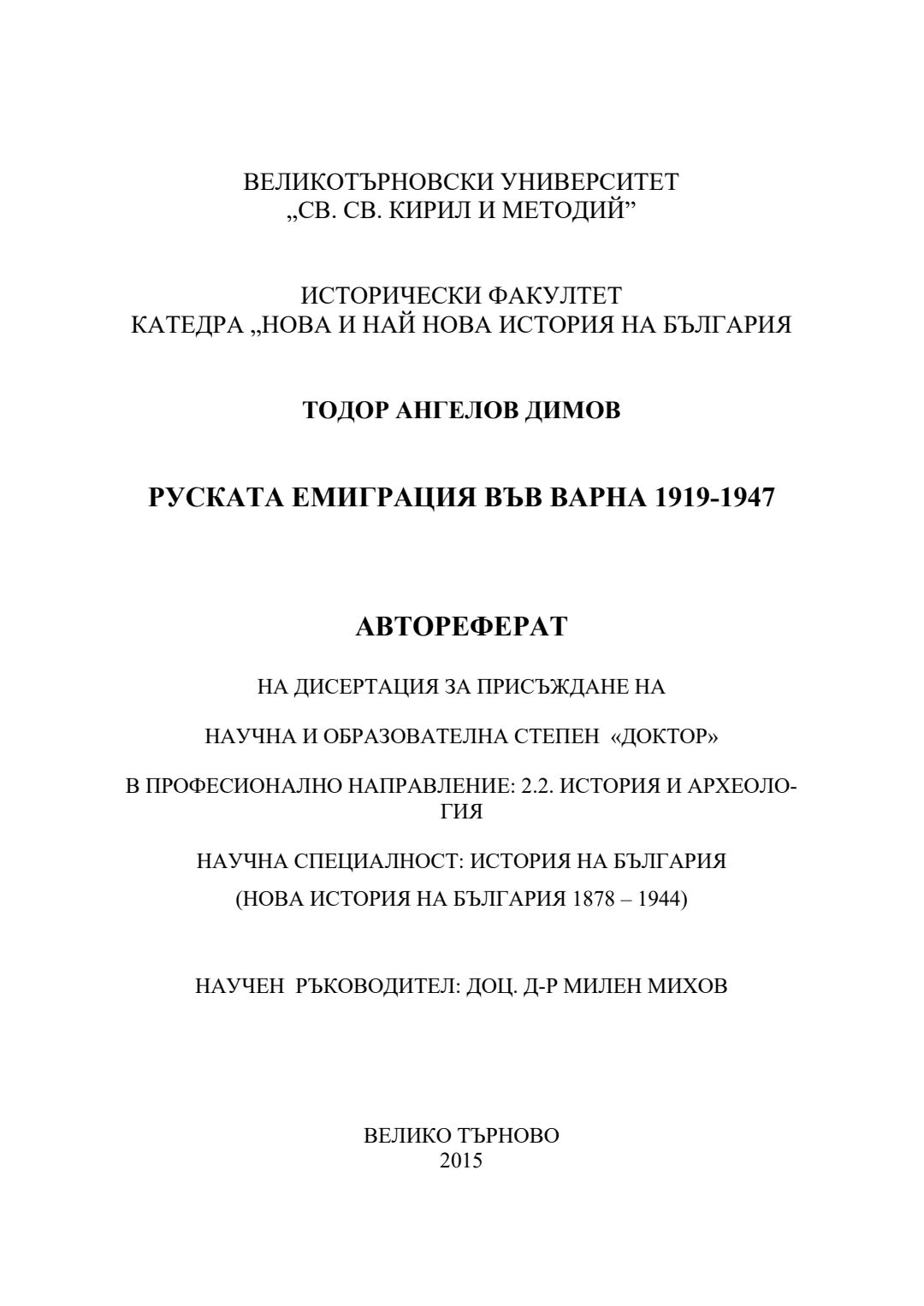 Руската емиграция във Варна 1919-1947 : Автореферат / Тодор Ангелов Димов ; Науч. ръководител Милен Михов