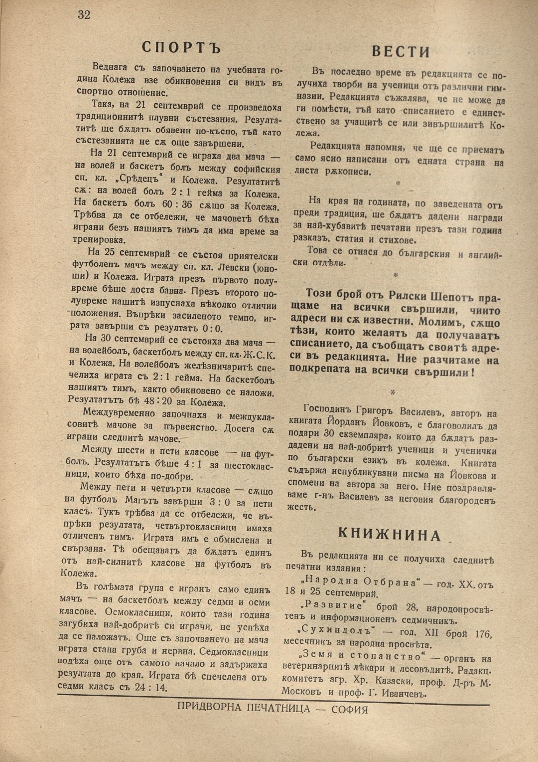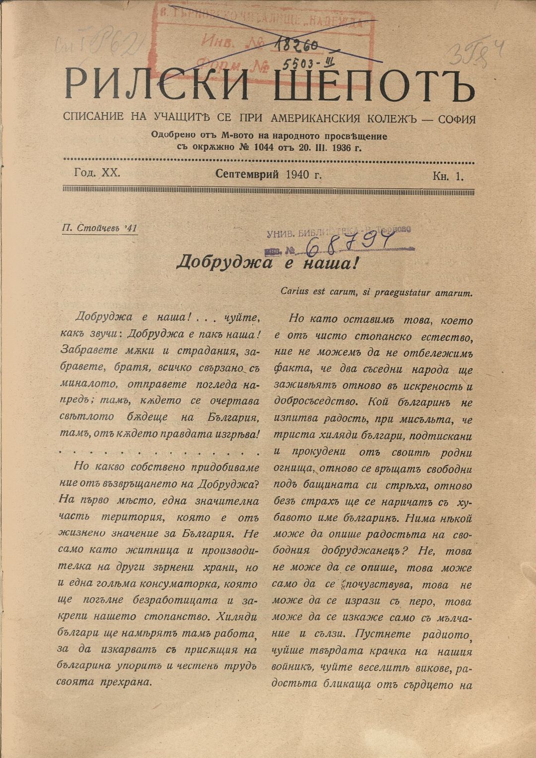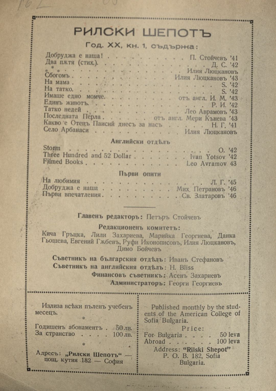 Год. 20, Кн.1. Рилски шепот : Орган на учащите се при Американския колеж - София / Американски колеж - София