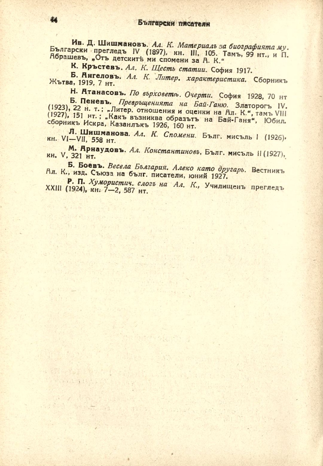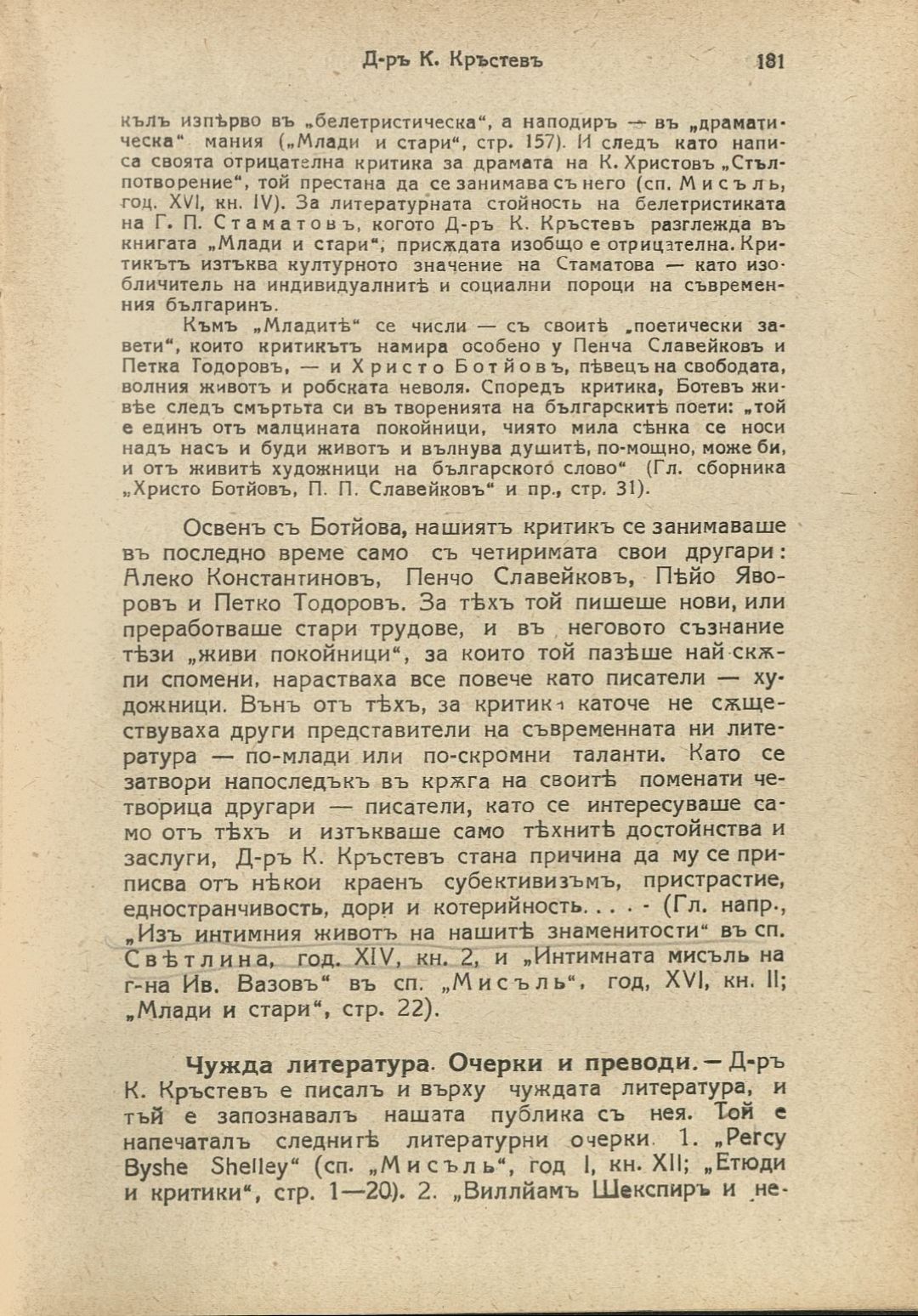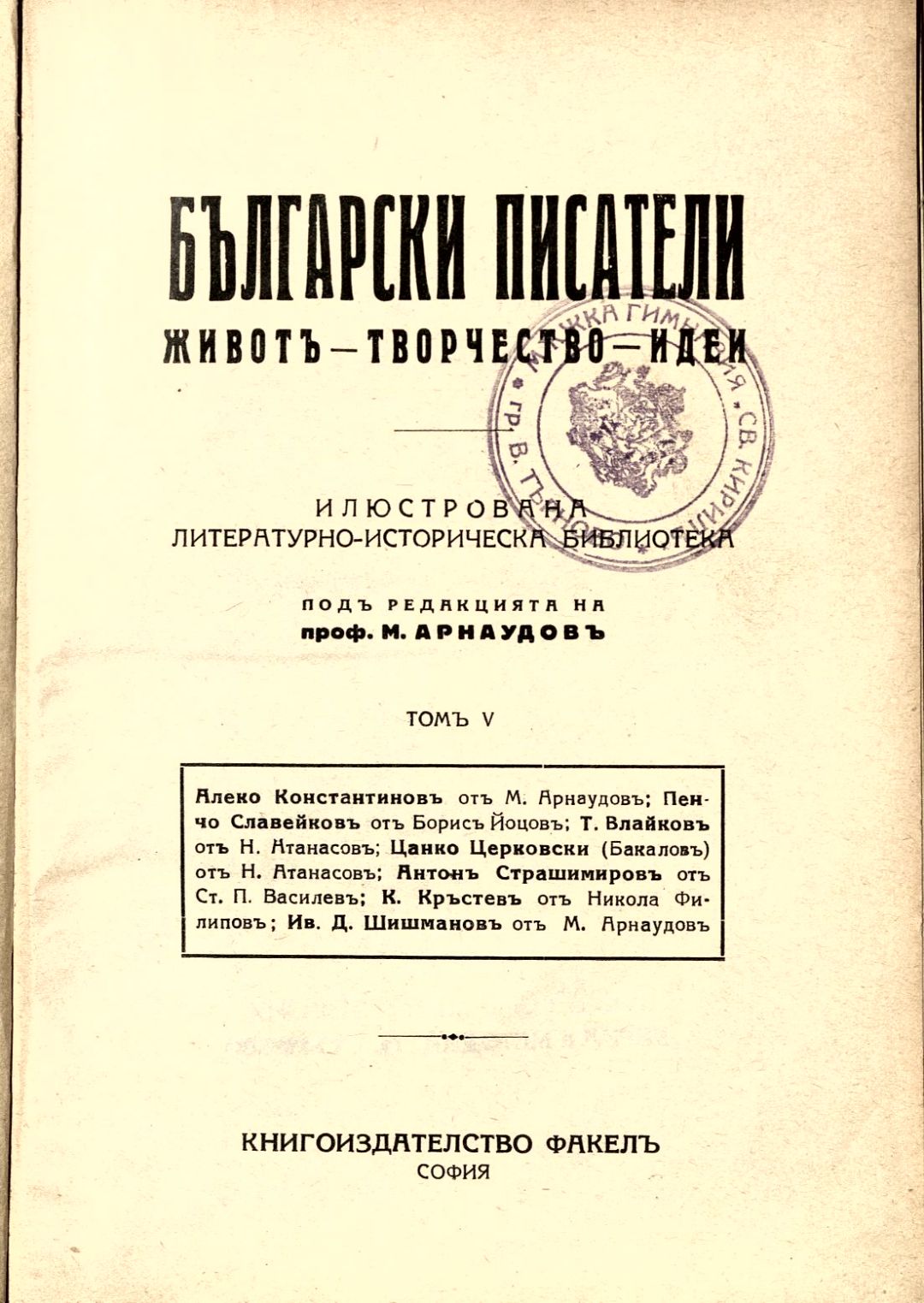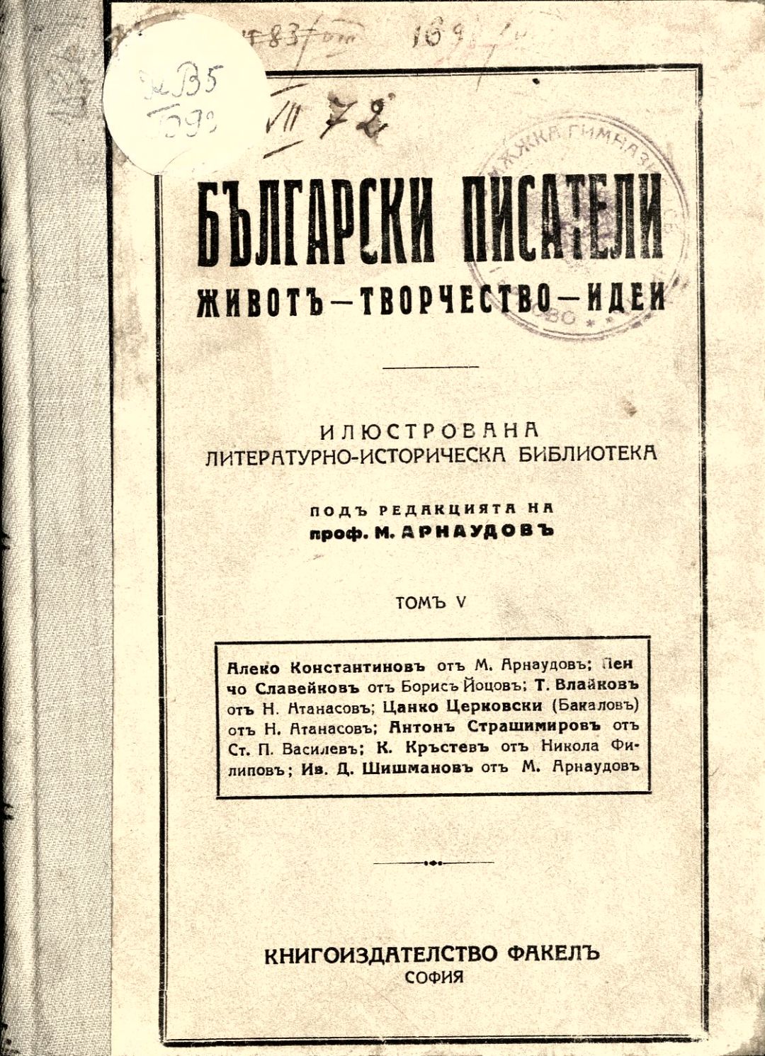 Български писатели : Животъ — творчество — идеи : Илюстрована литературно-историческа библиотека / под ред. на проф. М. Арнаудовъ. – София : Книгоиздателство Факелъ, [1929–1930].
