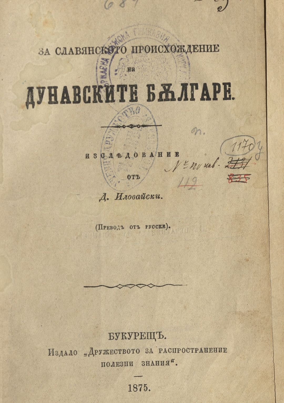 За славянското произхождение на дунавските българе : изследование от Д. Иловайски