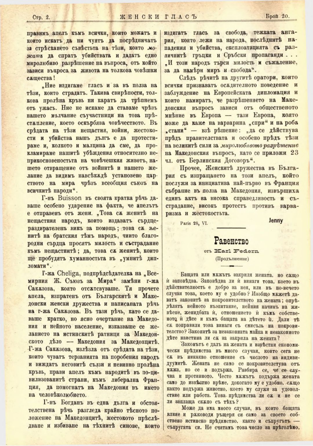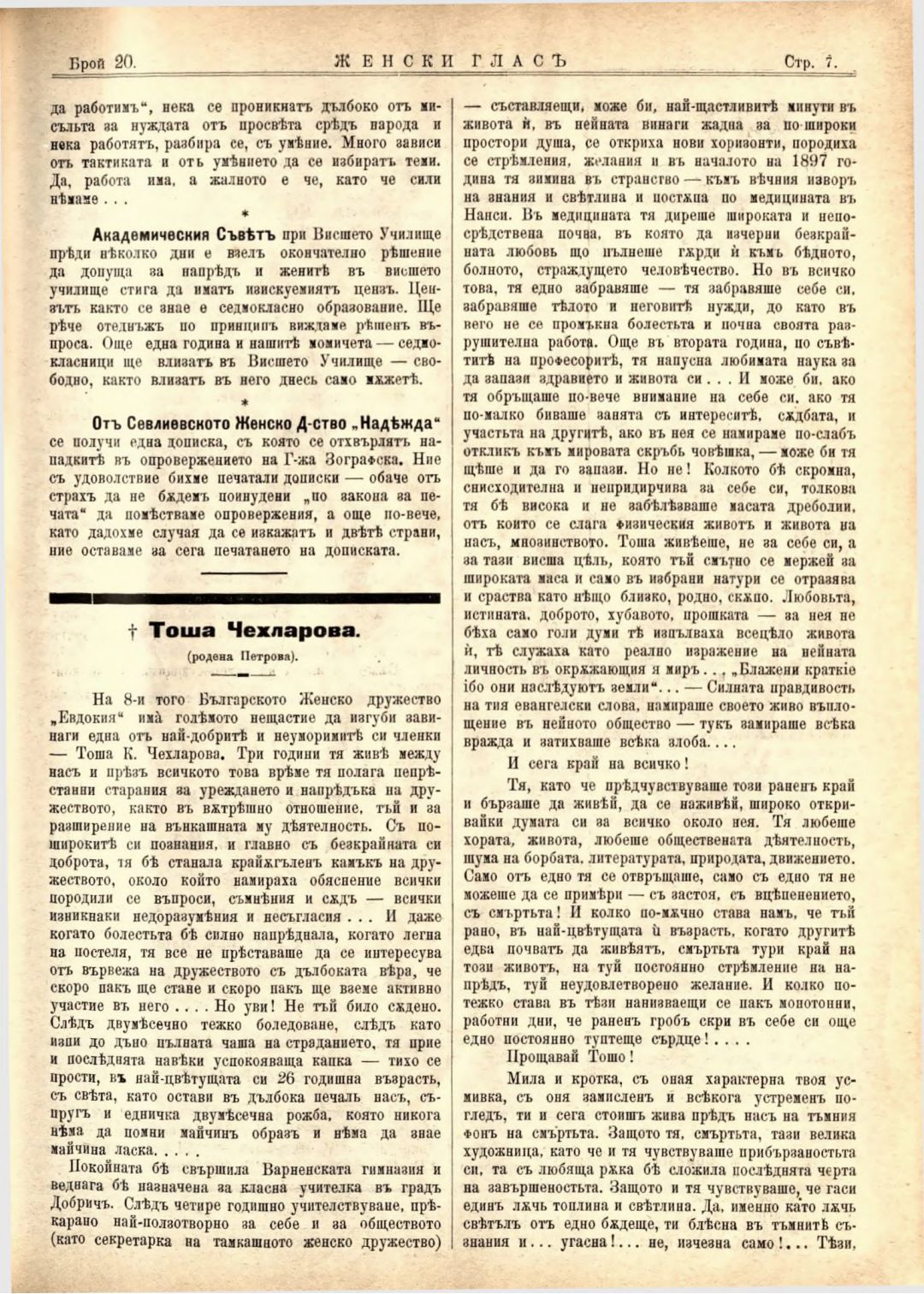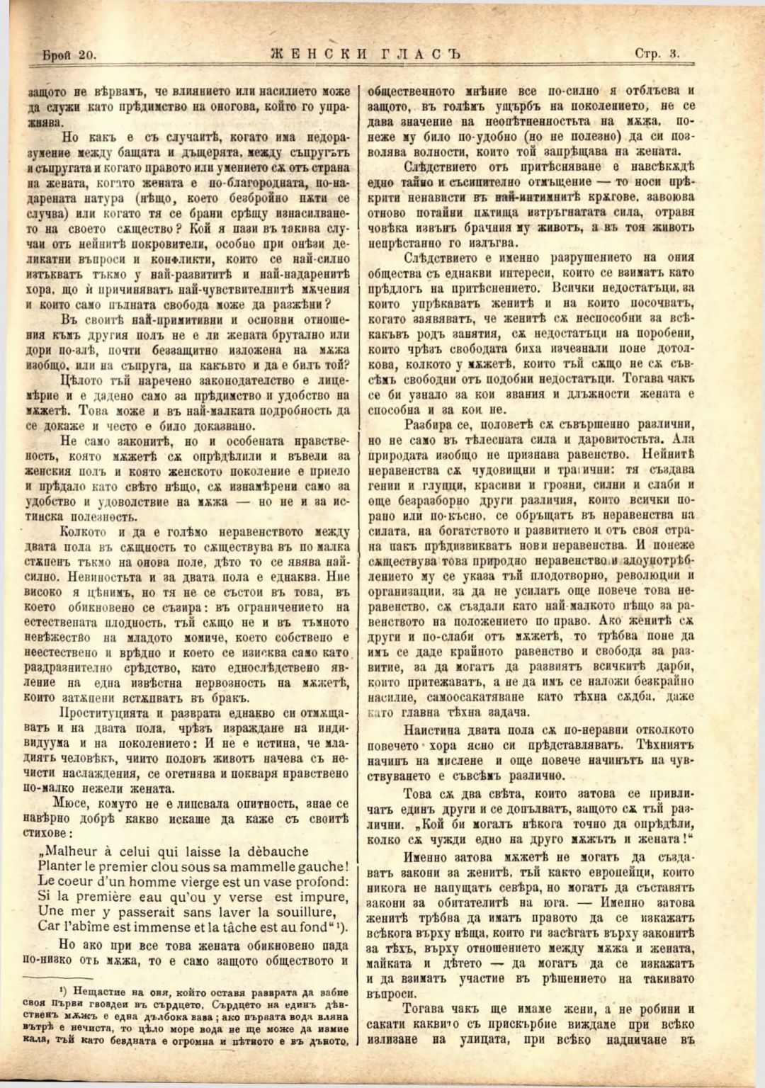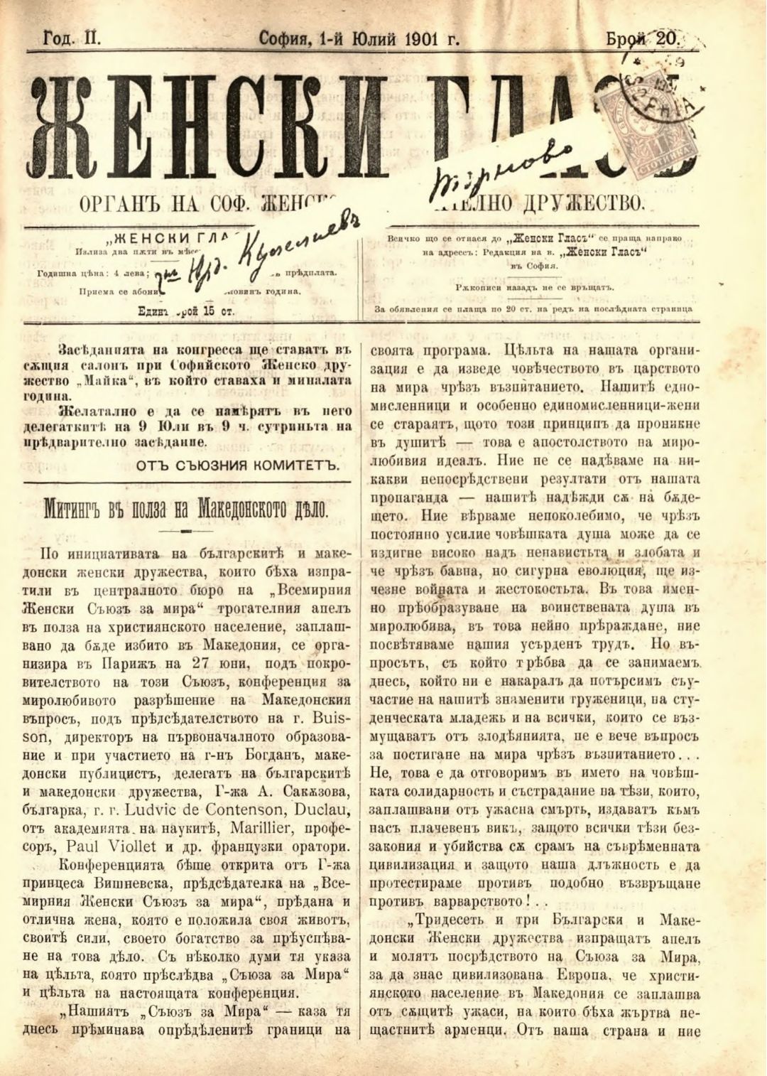 Год. 2,№ 20. Женски глас : Орган на софийското женско образователно дружество