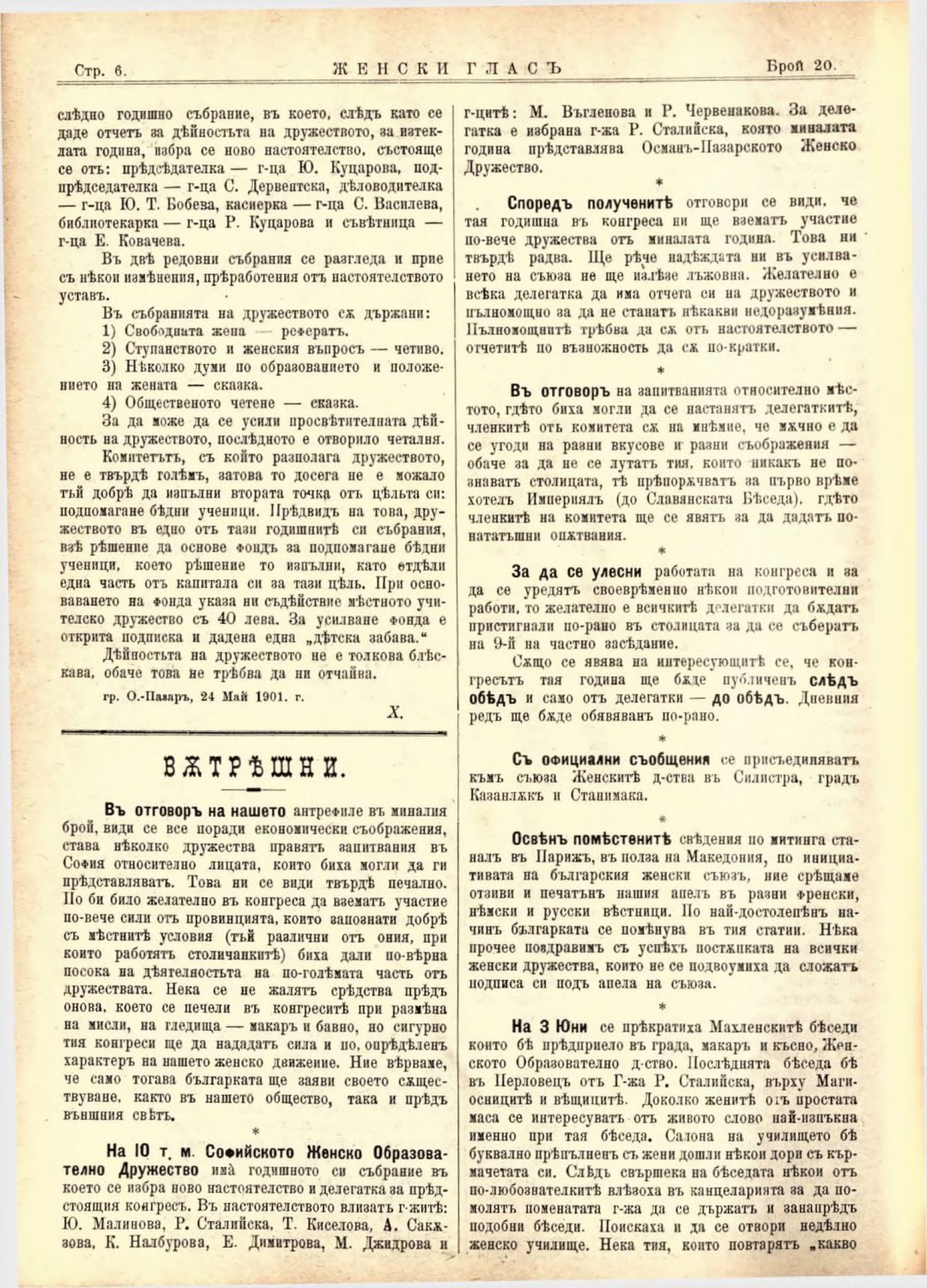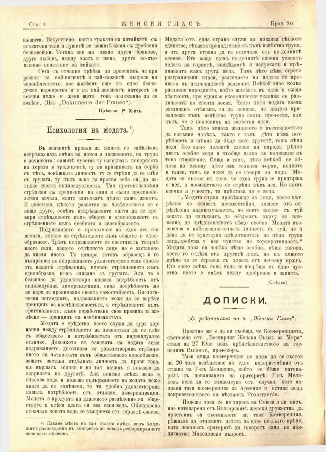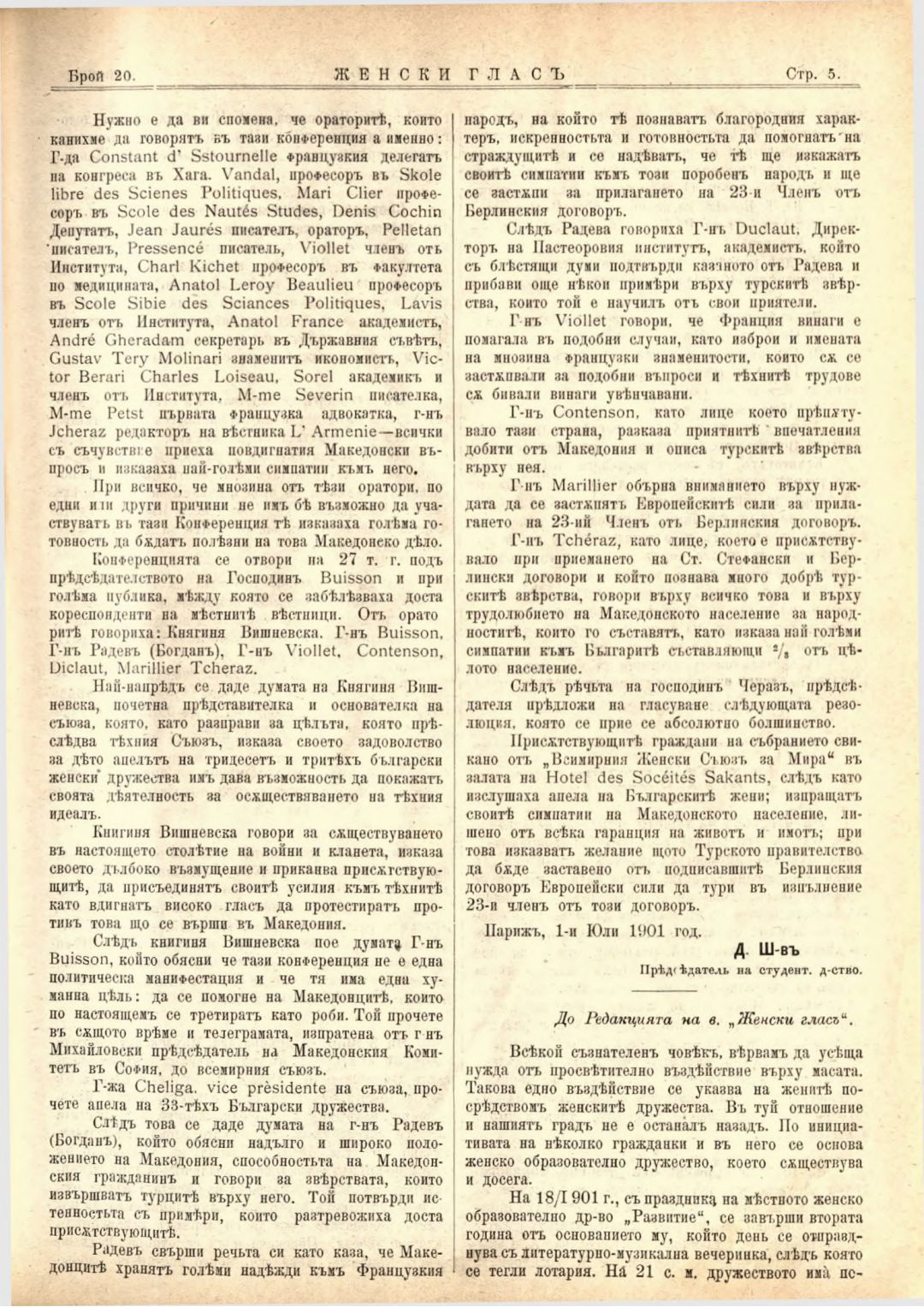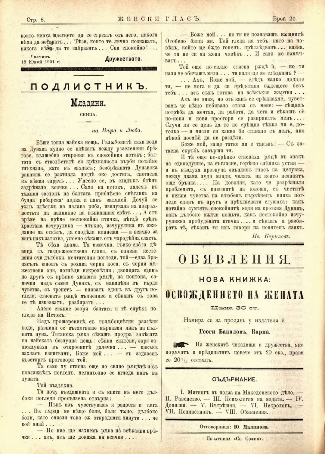 Год. 2,№ 20. Женски глас : Орган на софийското женско образователно дружество
