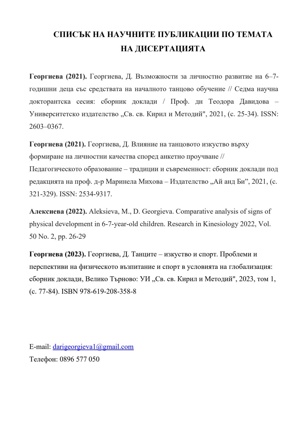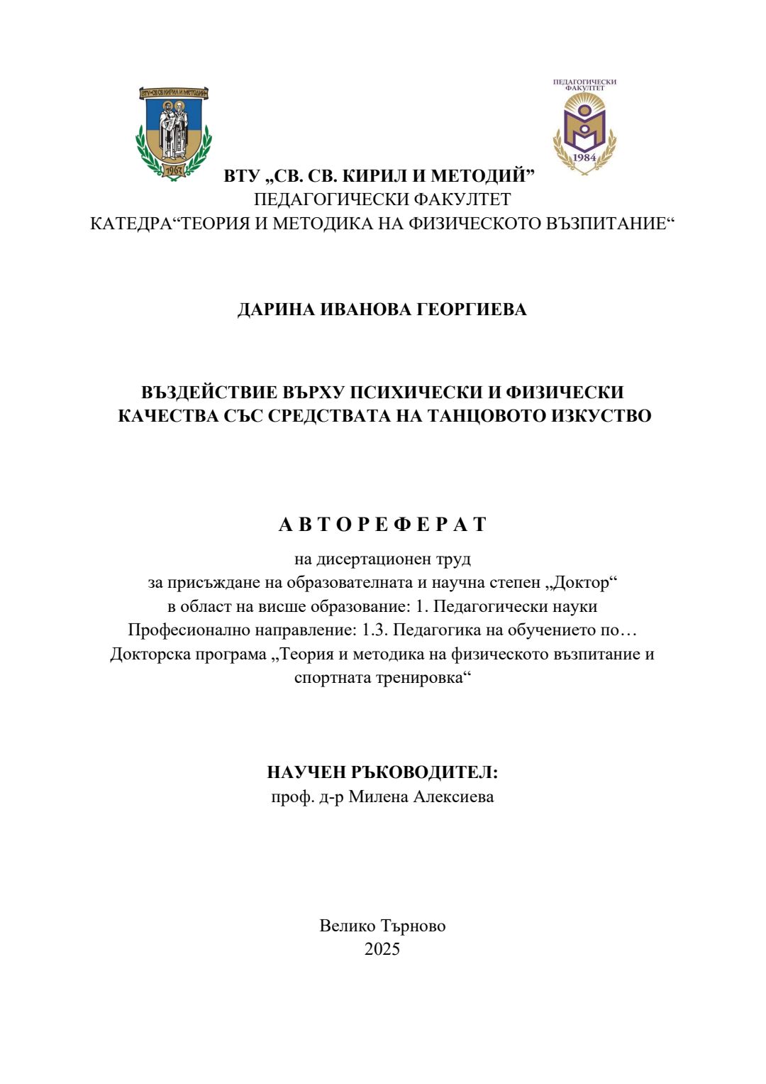 Въздействие върху психически и физически качества със средствата на танцовото изкуство : Автореферат / Дарина Иванова Георгиева ; Науч. ръководител Милена Алексиева