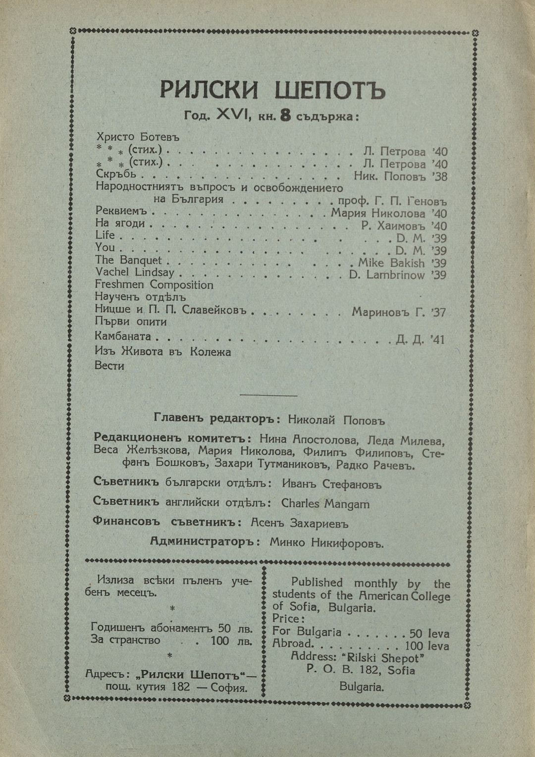 Год. 16, Кн.8. Рилски шепот : Орган на учащите се при Американския колеж - София / Американски колеж - София