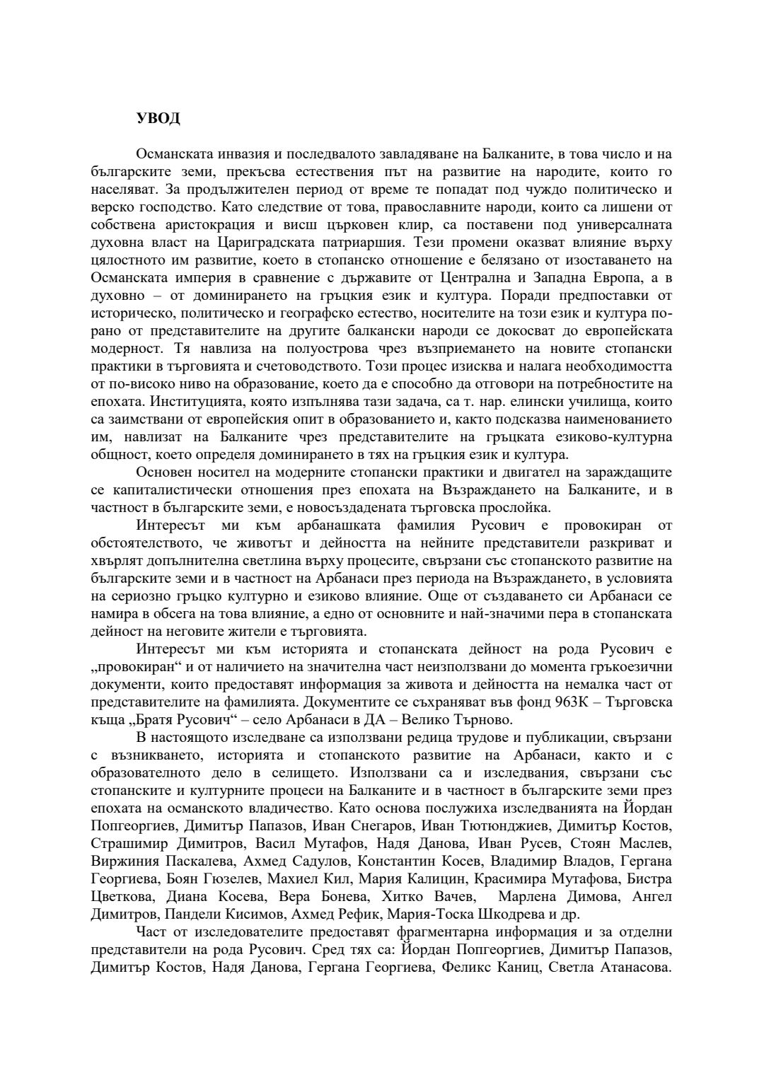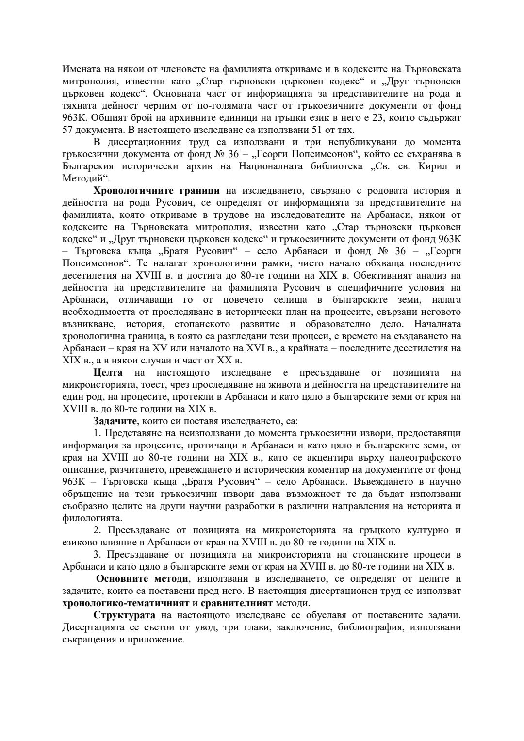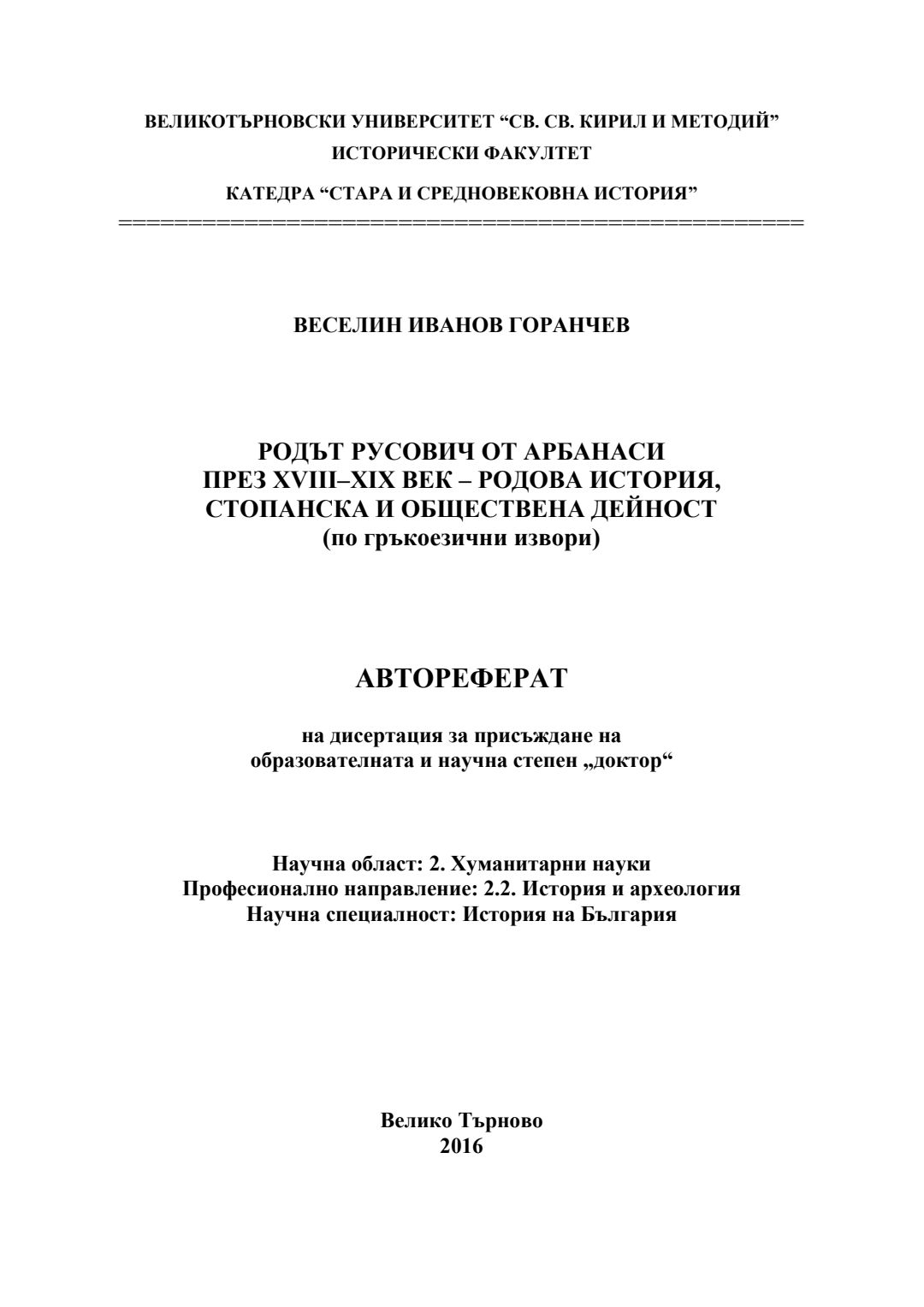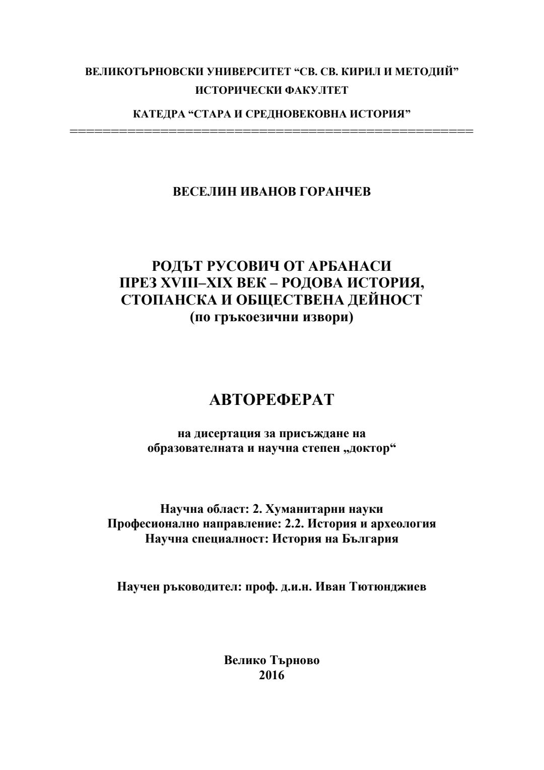Родът Русович от Арбанаси през XVIII-XIX век - родова история, стопанска и обществена дейност (по гръкоезични извори) : Автореферат / Веселин Иванов Горанчев ; Науч. ръководител Иван Тютюнджиев