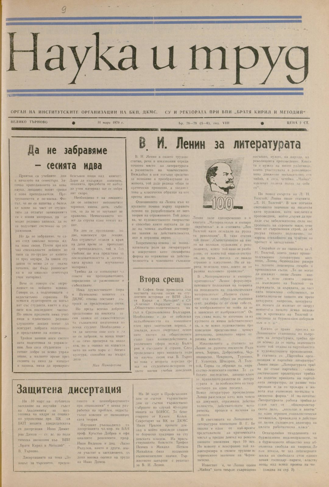 Год. 8, 5-6 (78-79). Наука и труд : Орган на институтските комитети на БКП, ДКМС, СУ и Ректората при ВПИ "Братя Кирил и Методий"