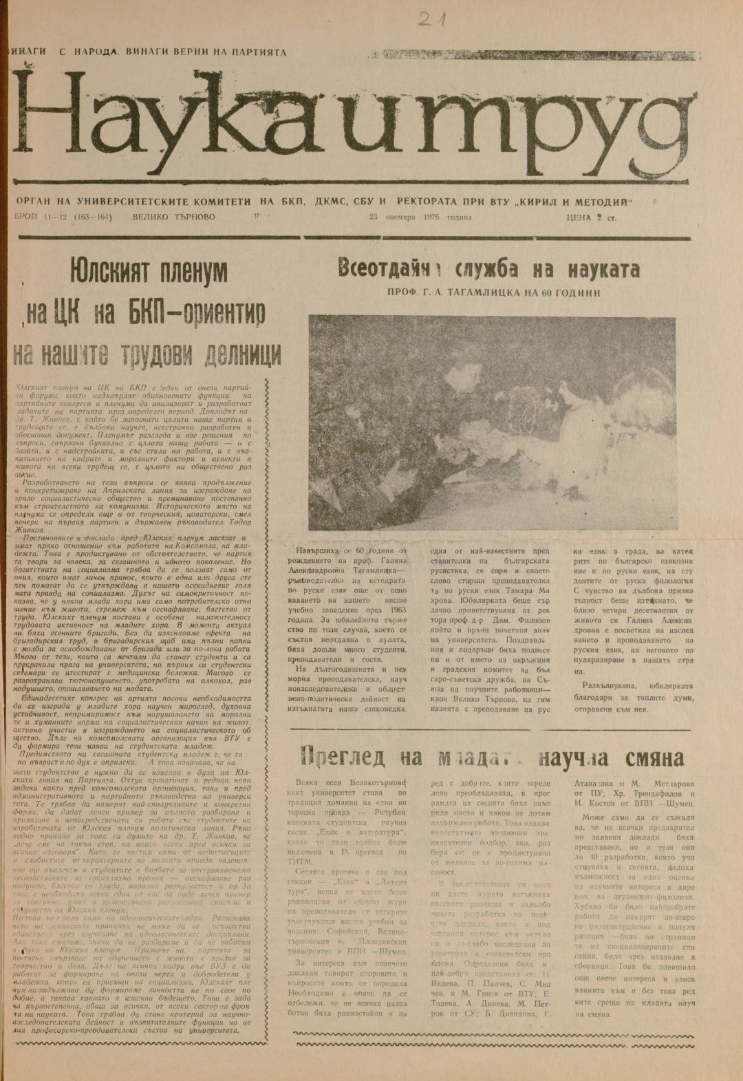 Год.15,11-12 (163-164). Наука и труд : Орган на университетските организации на БКП, ДКМС, СУ и Ректората при ВПИ "Братя Кирил и Методий"