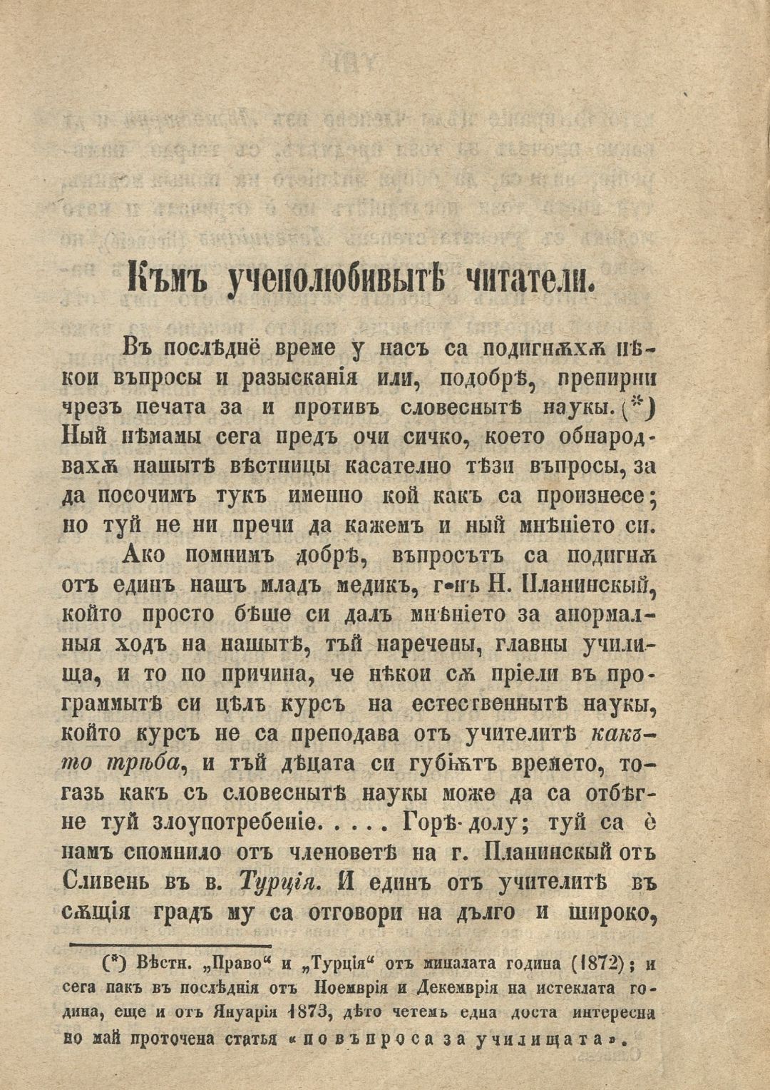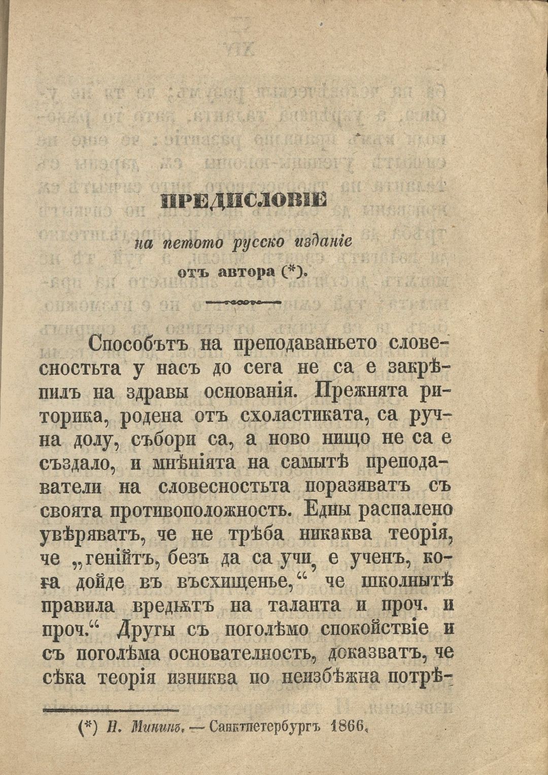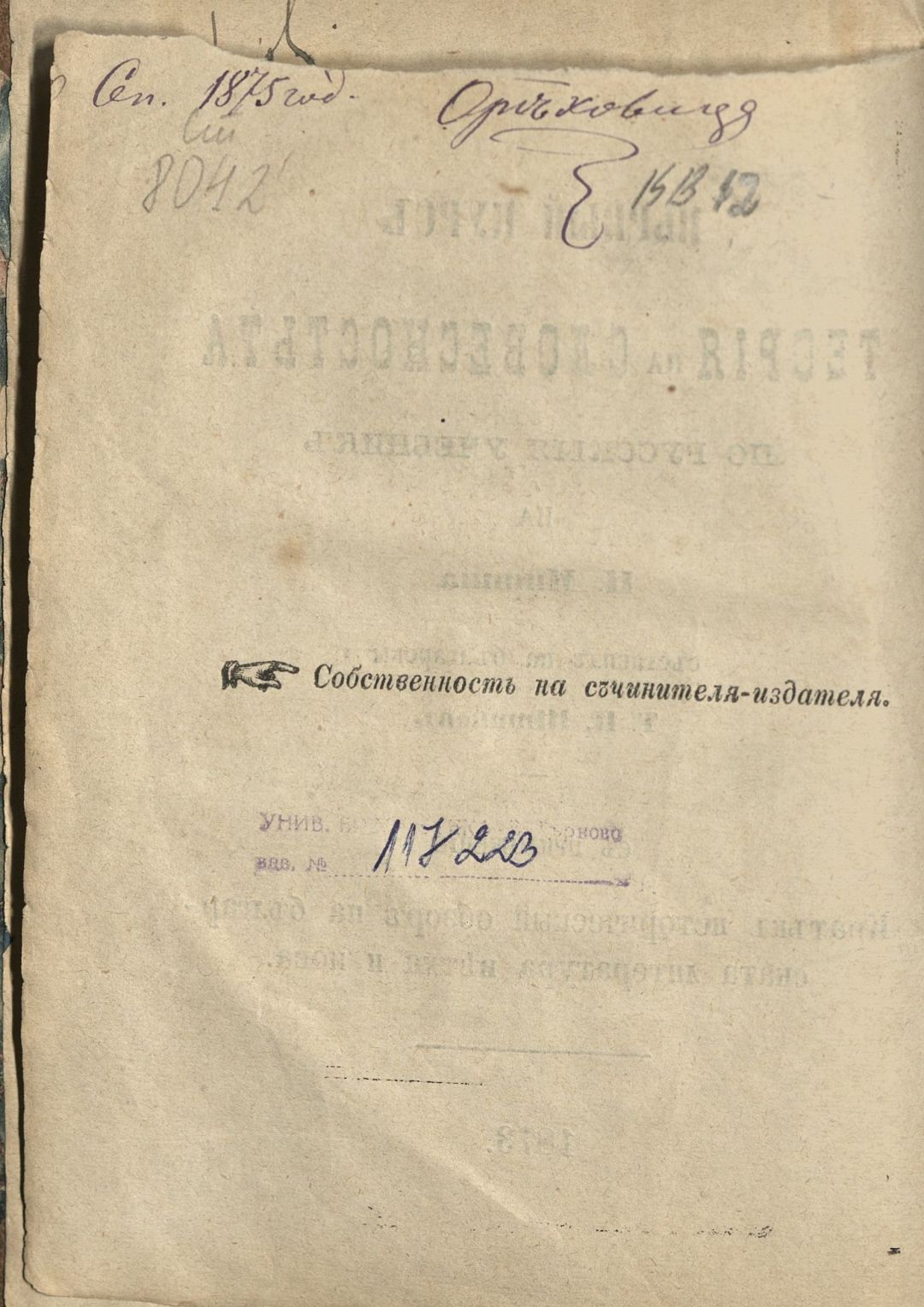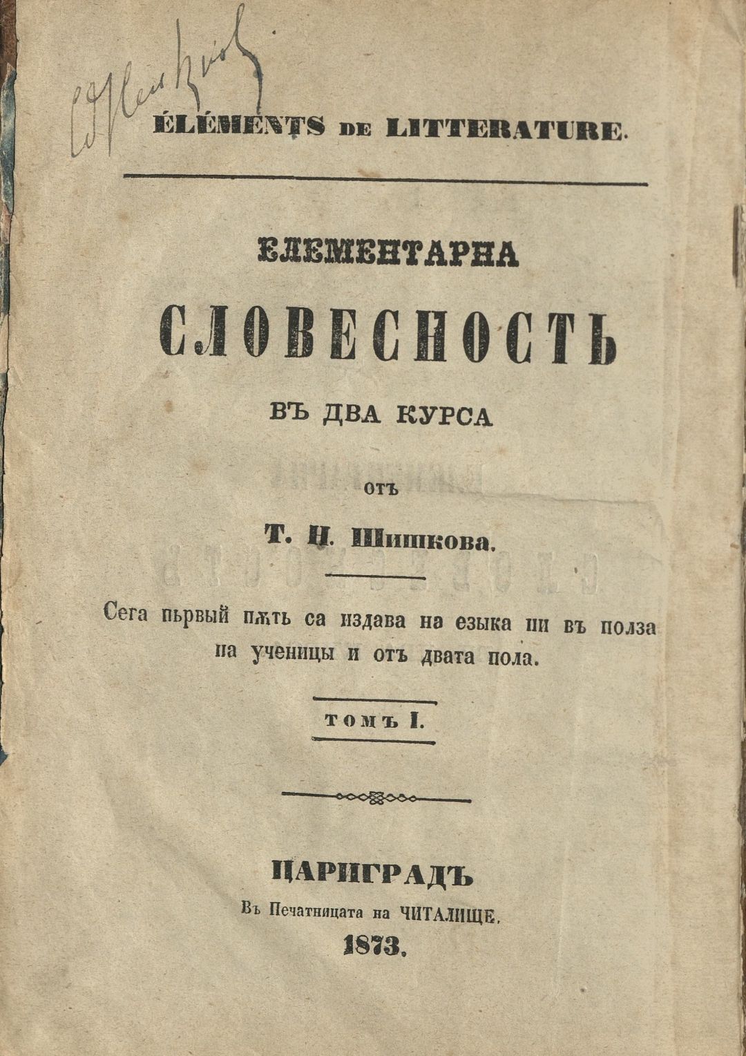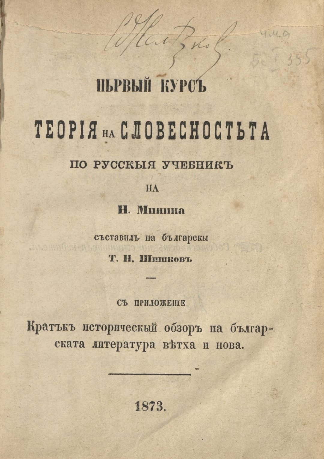 Ч. 1. Първий курс. Теория на словесността по руския учебник на Н. Минина : С приложение Кратък исторический обзор на българската литература ветха и нова . - 1873 . - ХV, 16-207, [1] с.
