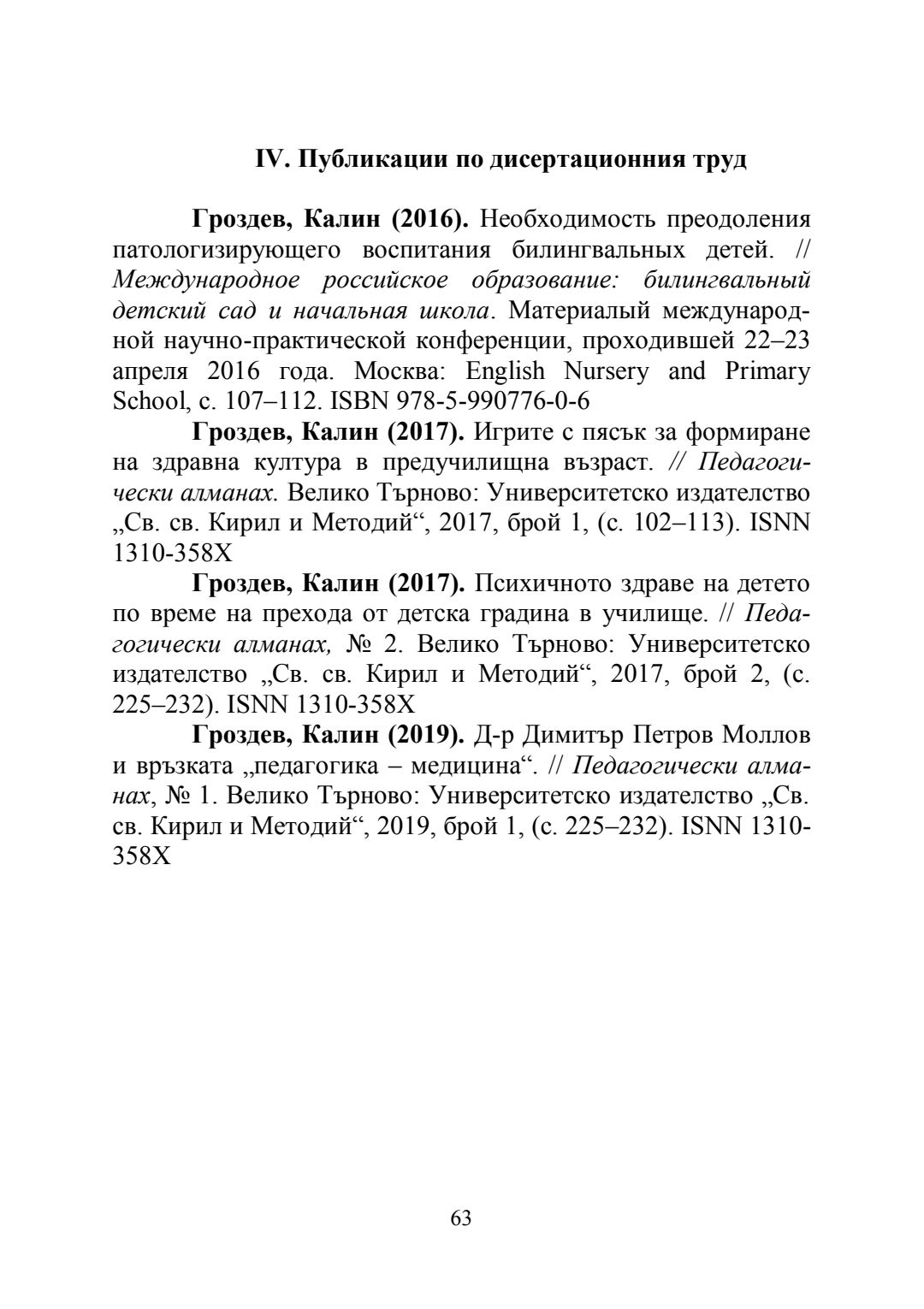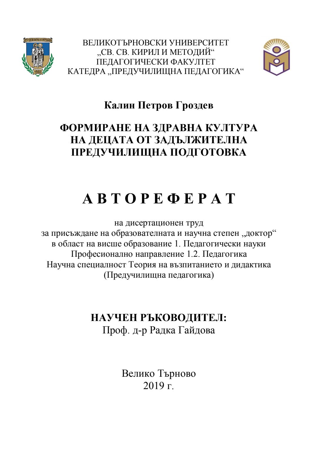 Формиране на здравна култура на децата от задължителна предучилищна подготовка : Автореферат / Калин Петров Гроздев ; Науч. ръководител Радка Гайдова