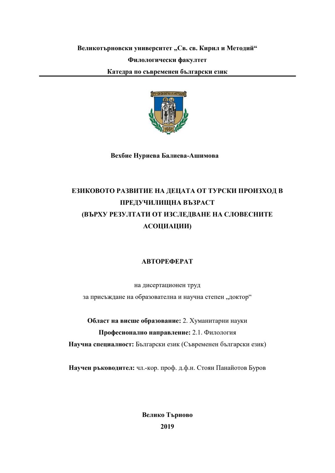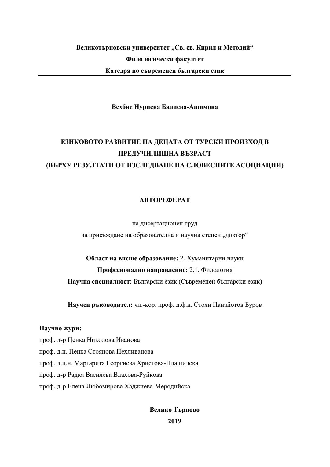 Езиковото развитие на децата от турски произход в предучилищна възраст (Върху резултати от изследване на словесните асоциации) : Автореферат / Вехбие Нуриева Балиева-Ашимова ; Науч. ръководител Стоян Буров