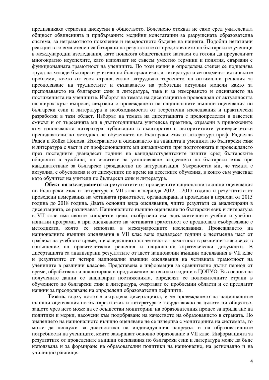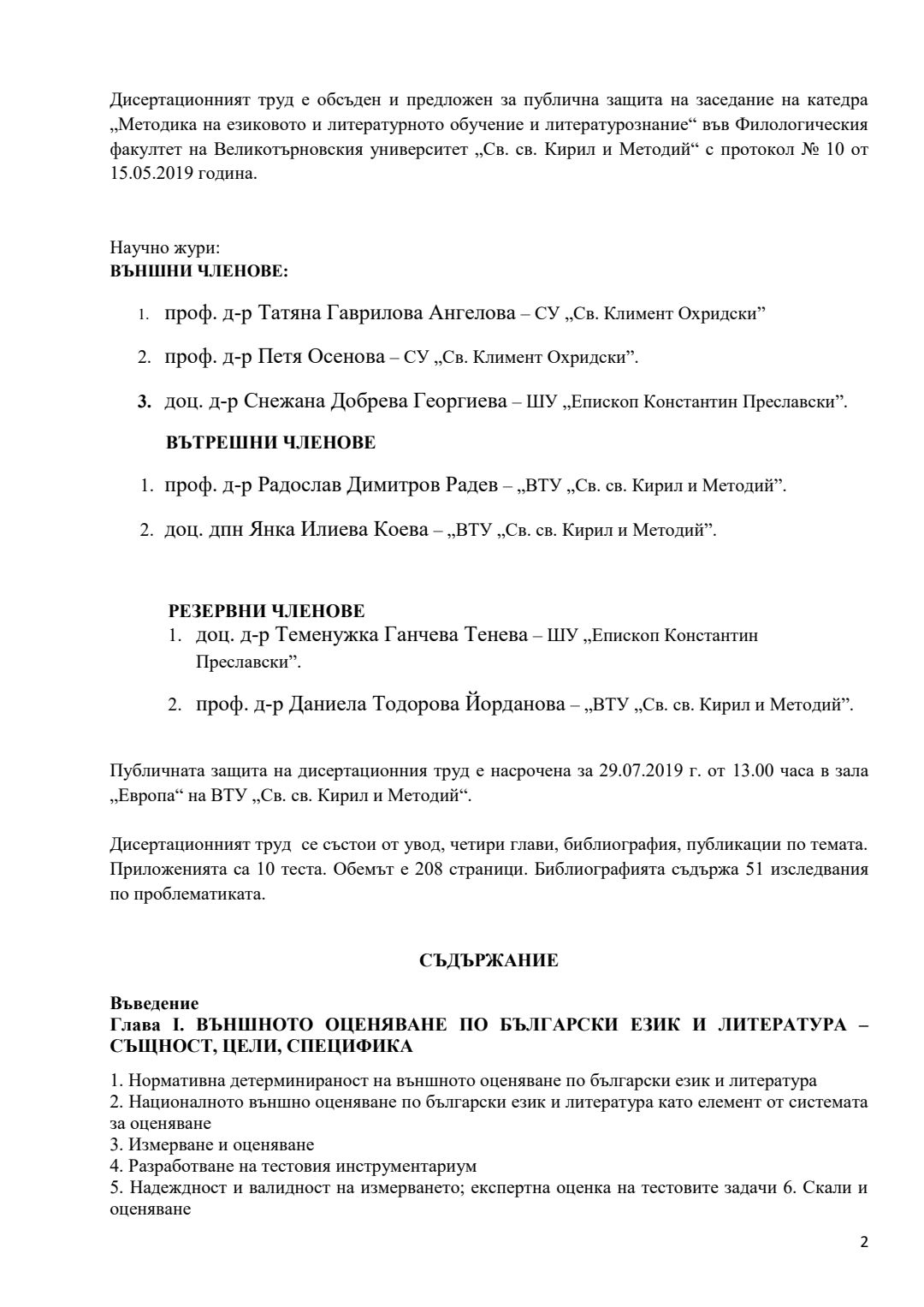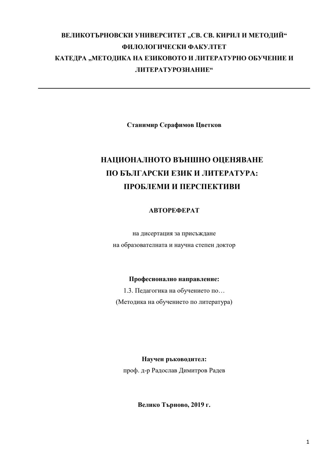 Националното външно оценяване по български език и литература: проблеми и перспективи : Автореферат / Станимир Серафимов Цветков ; Науч. ръководител Радослав Радев