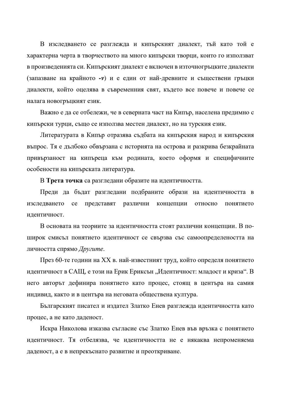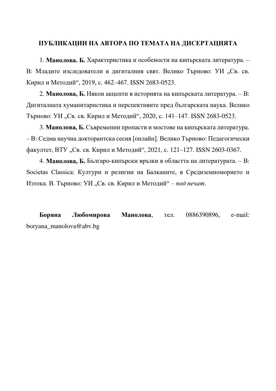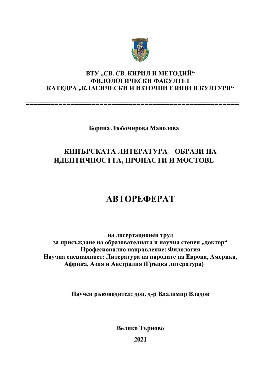 Кипърската литература – образи на идентичността, пропасти и мостове : Автореферат / Боряна Любомирова Манолова ; Науч. ръководител Владимир Владов