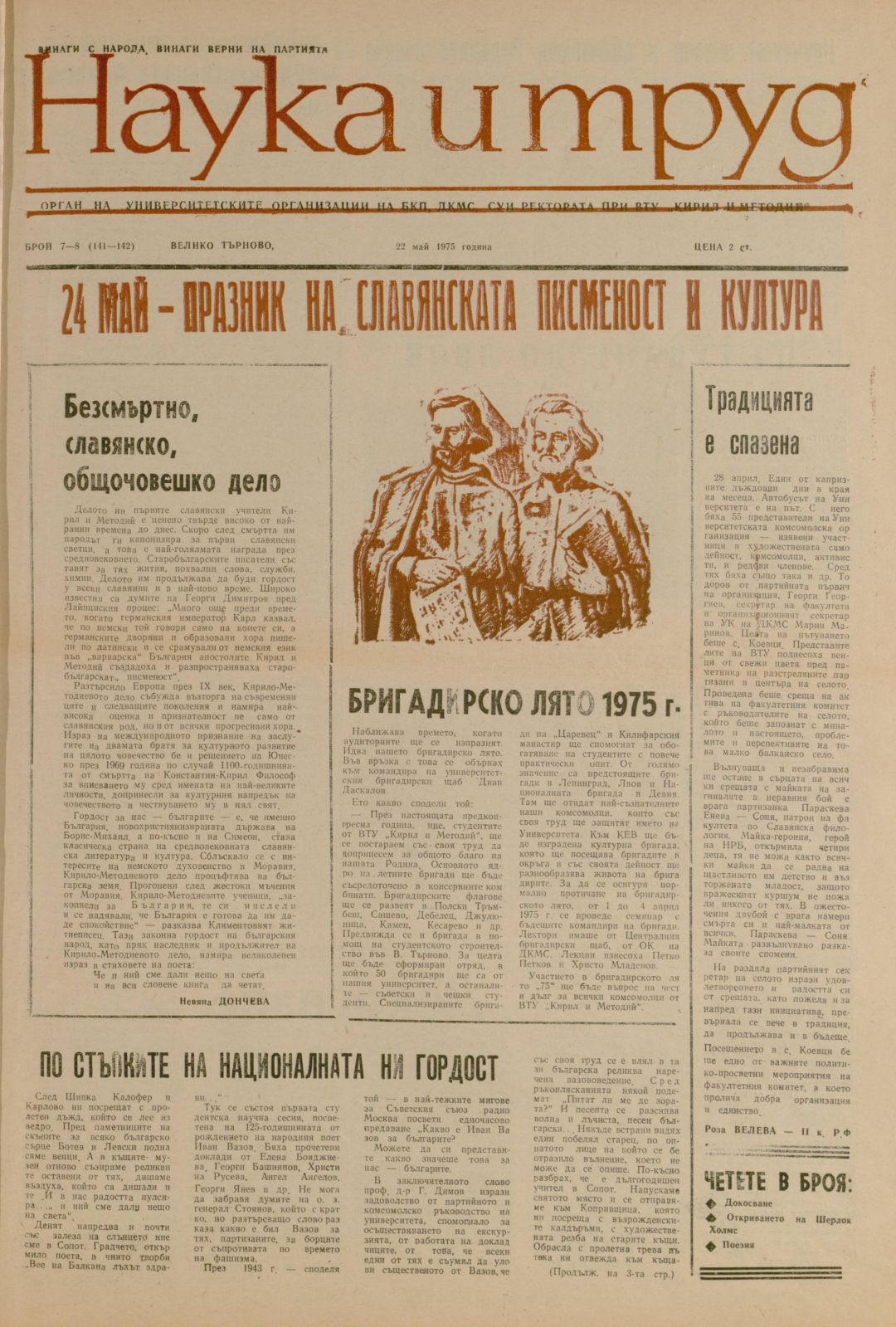 Год.14, 7-8 (141-142). Наука и труд : Орган на институтските комитети на БКП, ДКМС, СУ и Ректората при ВПИ "Братя Кирил и Методий"