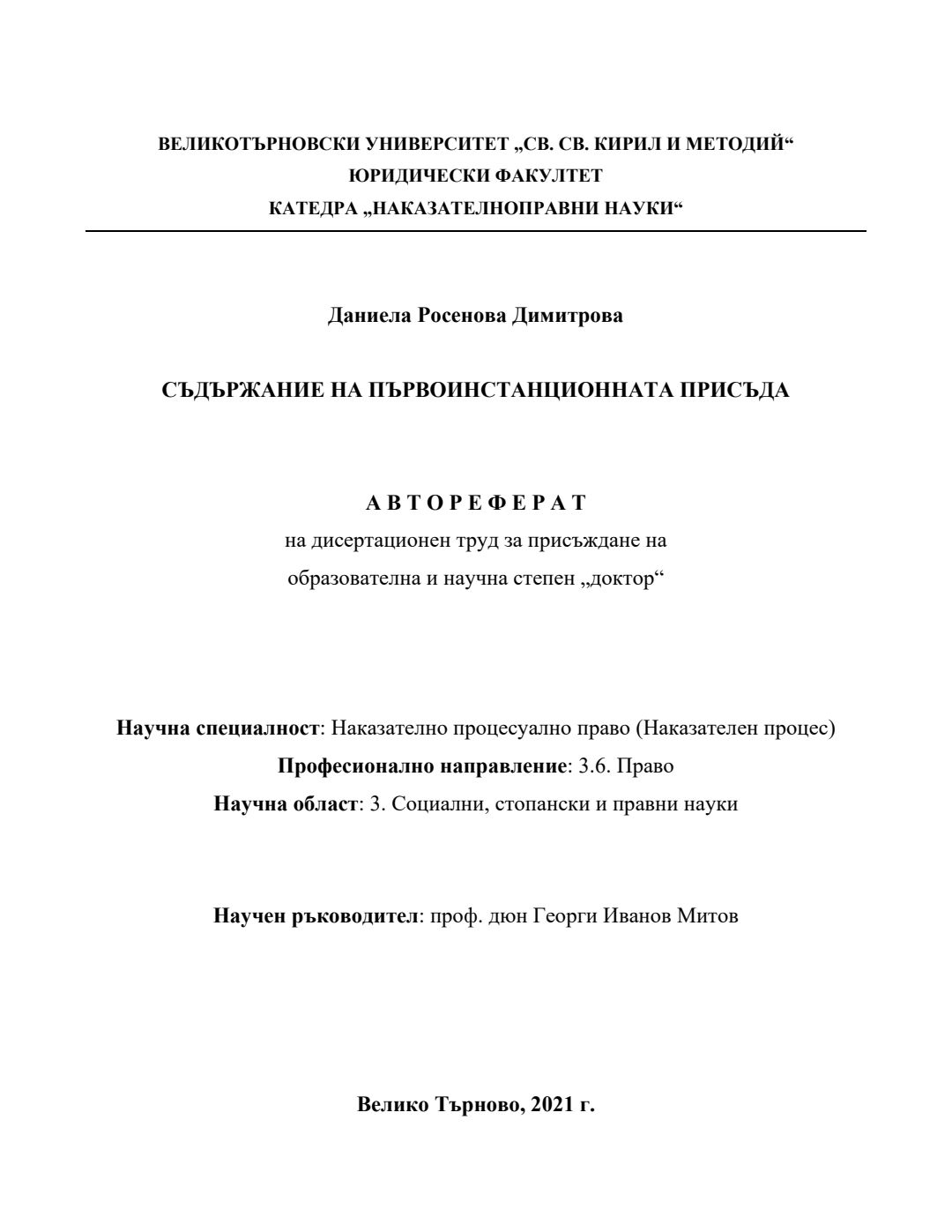 Съдържание на първоинстанционната присъда : Автореферат / Даниела Росенова Димитрова ; Науч. ръководител Георги Иванов Митов