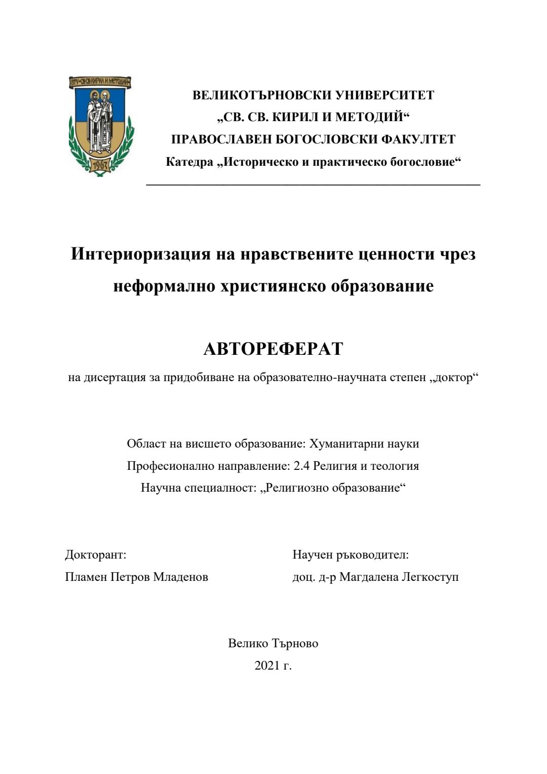 Интериоризация на нравствените ценности чрез неформално християнско образование : Автореферат / Пламен Петров Младенов ; Науч. ръководител Магдалена Легкоступ
