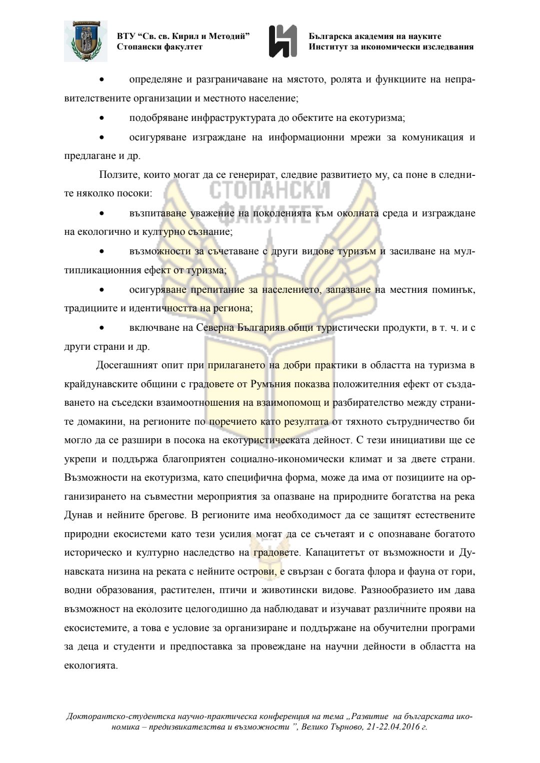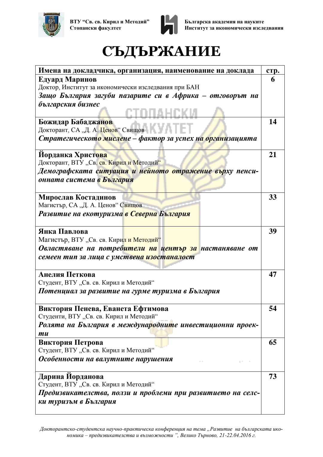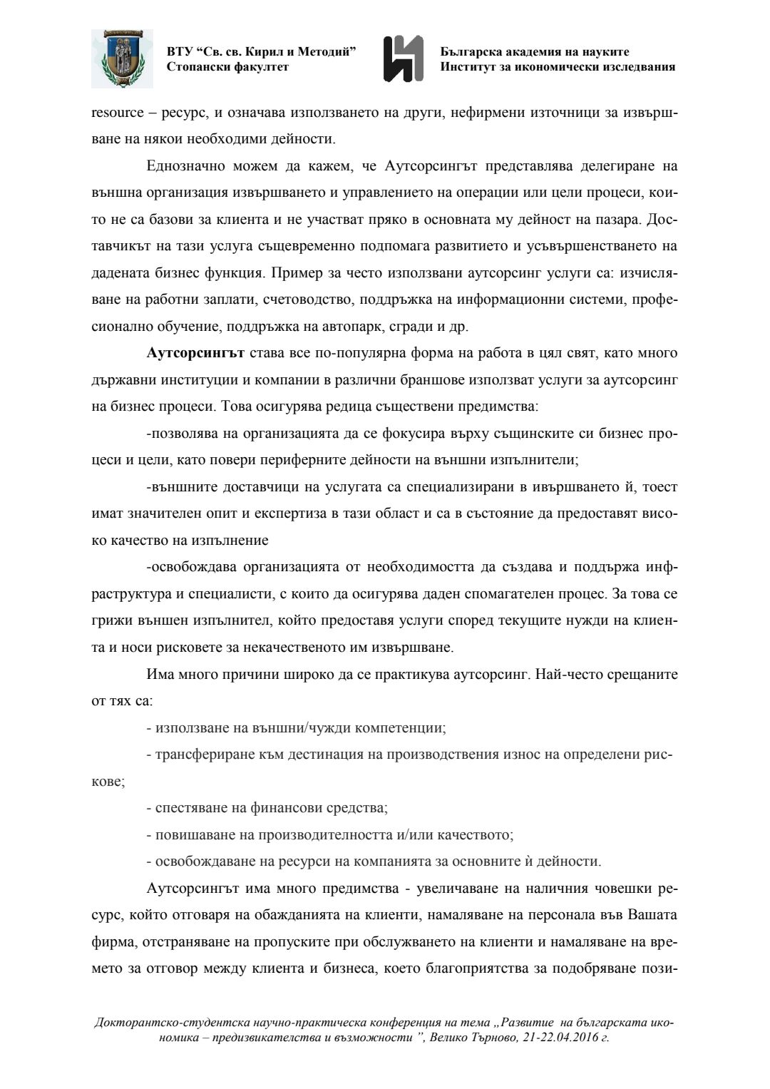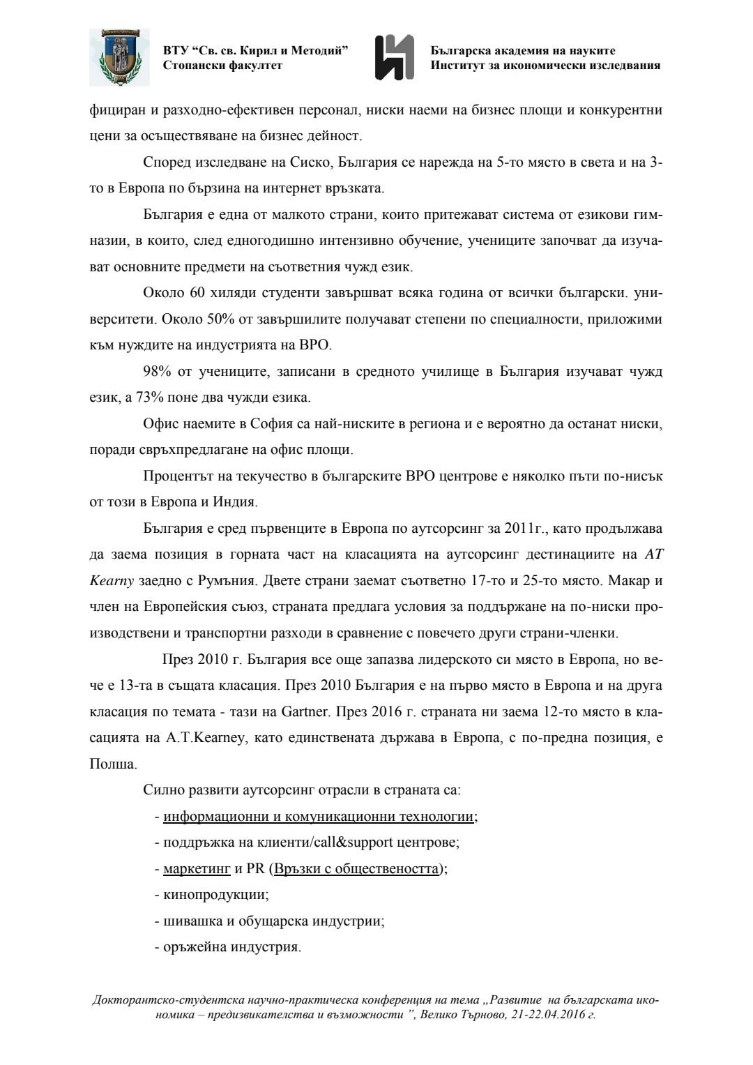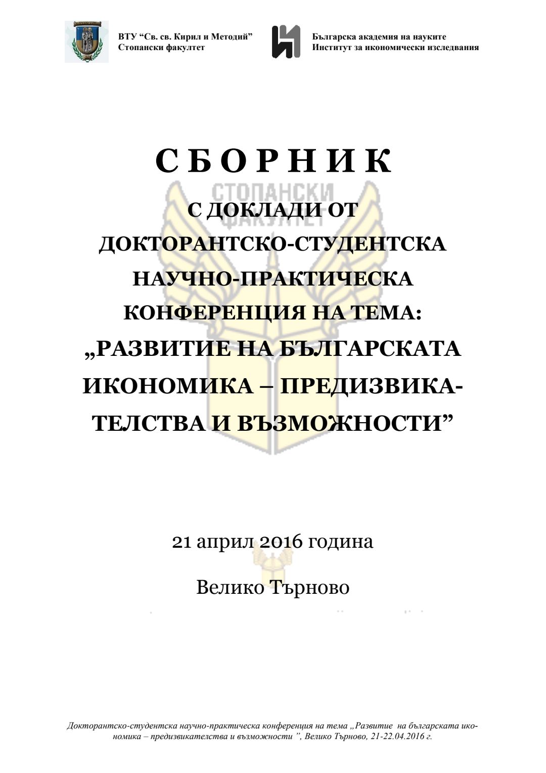 Докторантско-студентска научно-практическа конференция "Развитие на българската икономика - предизвикателства и възможности", 21 април 2016 г., Велико Търново : сборник с доклади