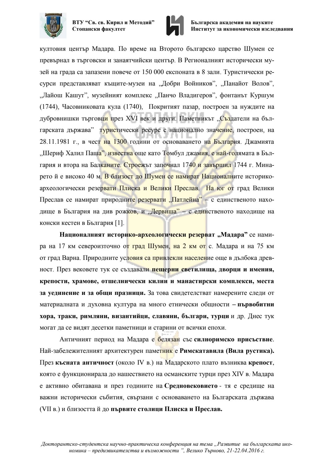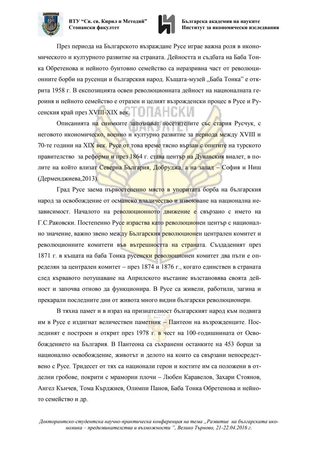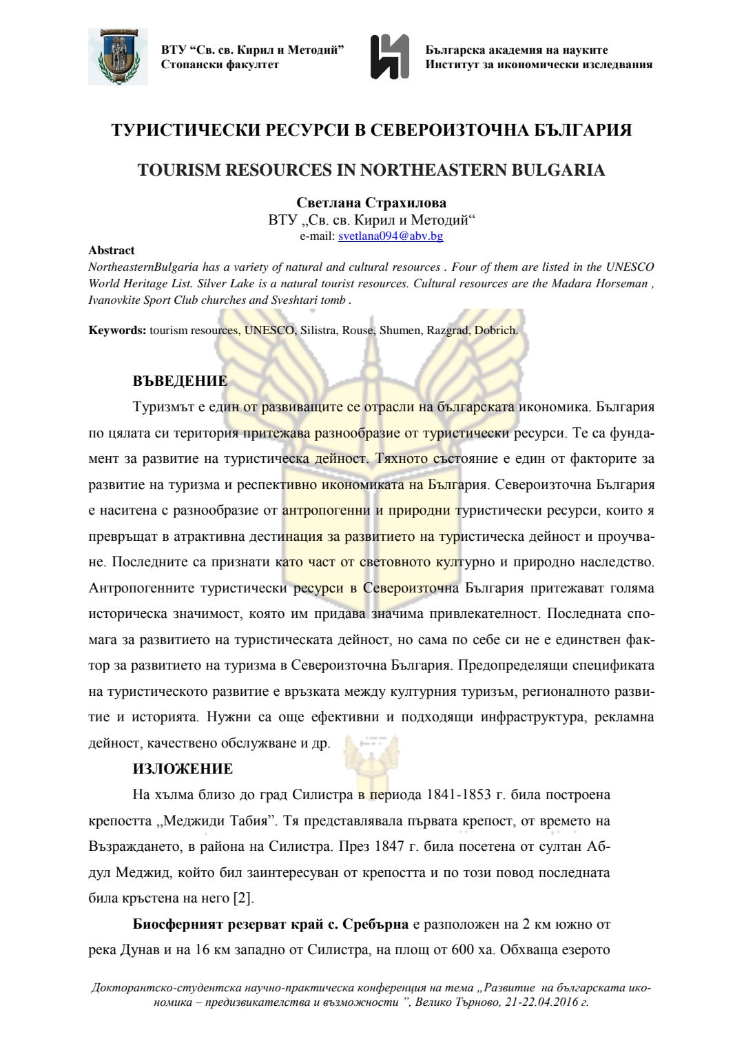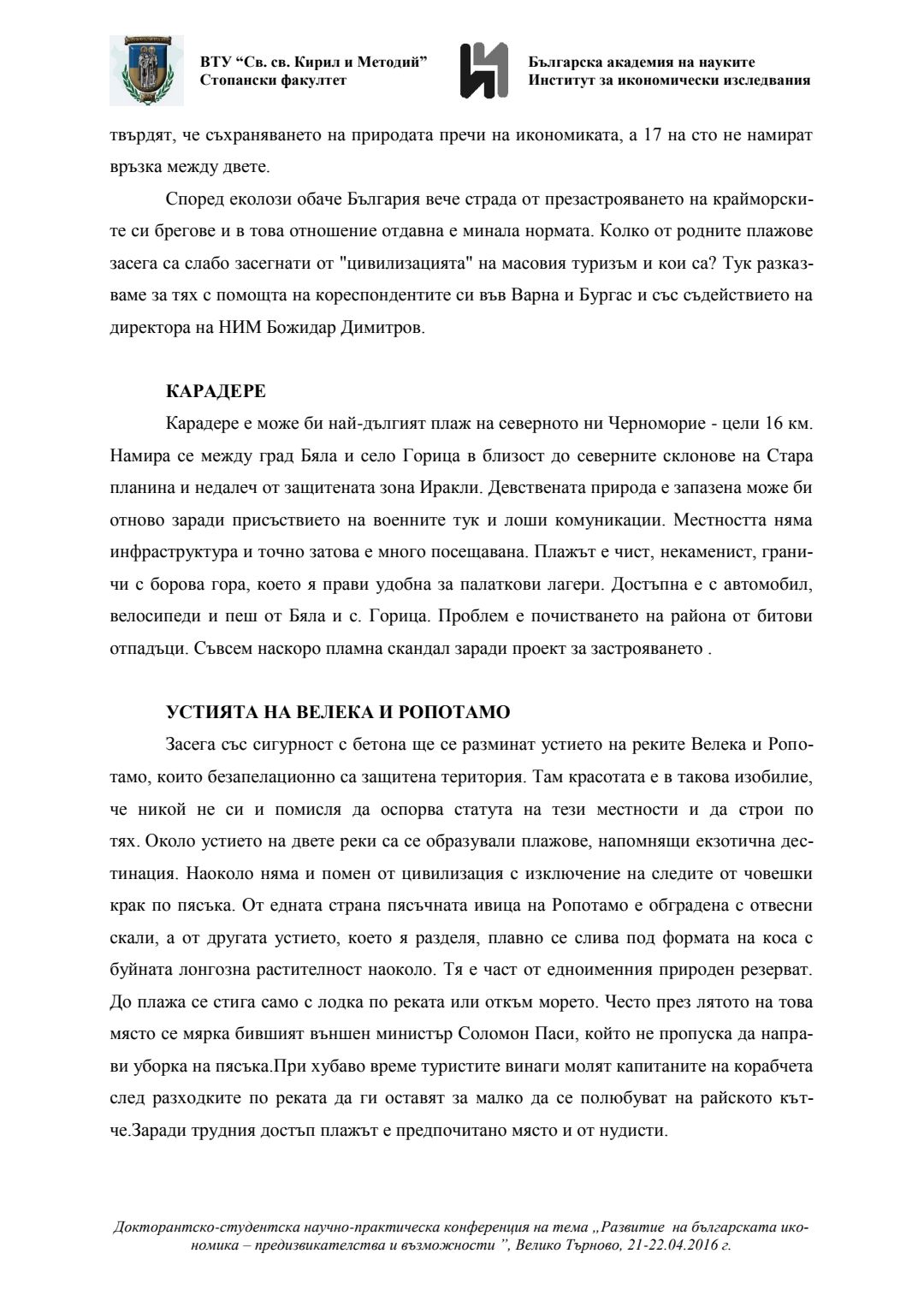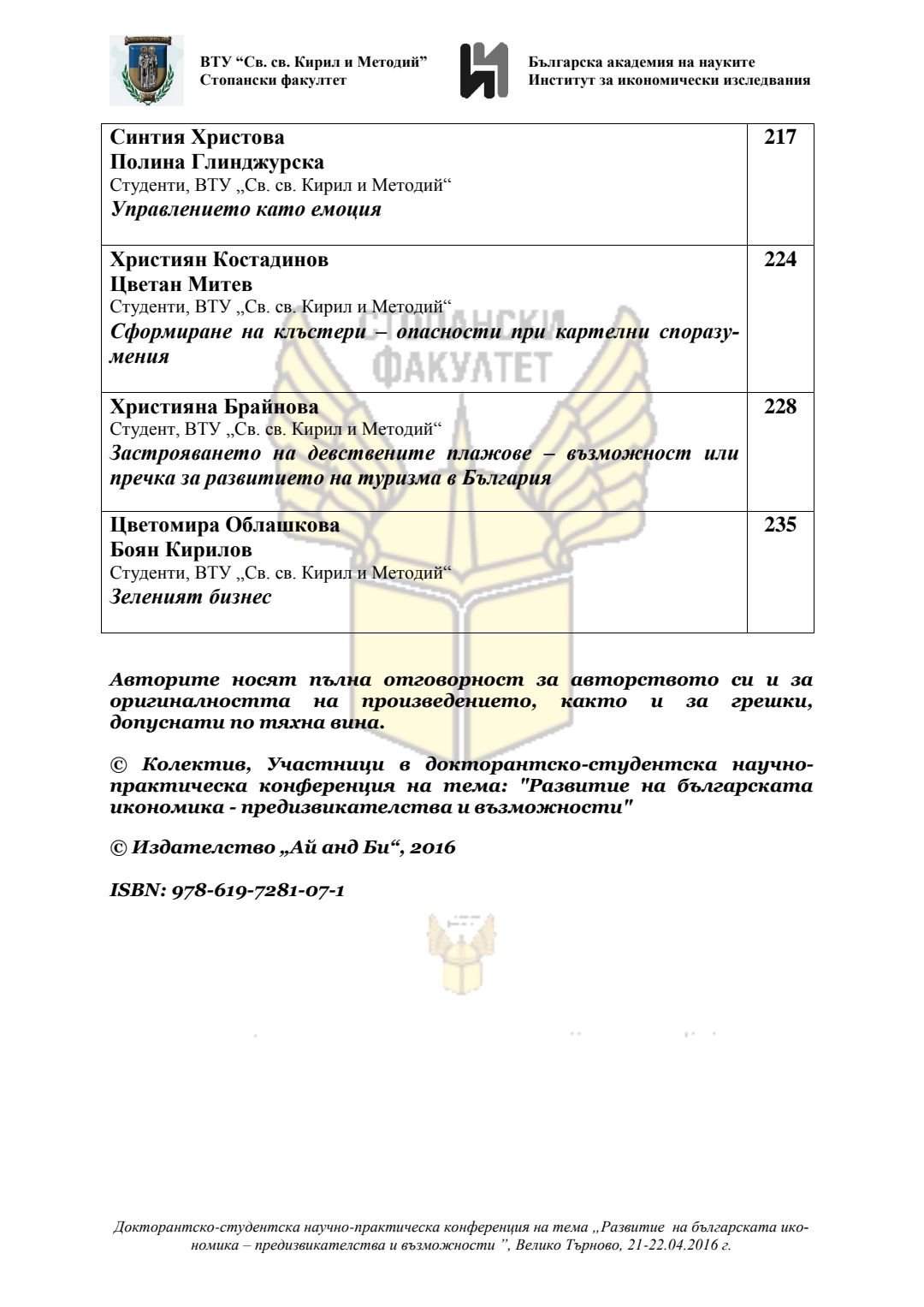 Докторантско-студентска научно-практическа конференция "Развитие на българската икономика - предизвикателства и възможности", 21 април 2016 г., Велико Търново : сборник с доклади