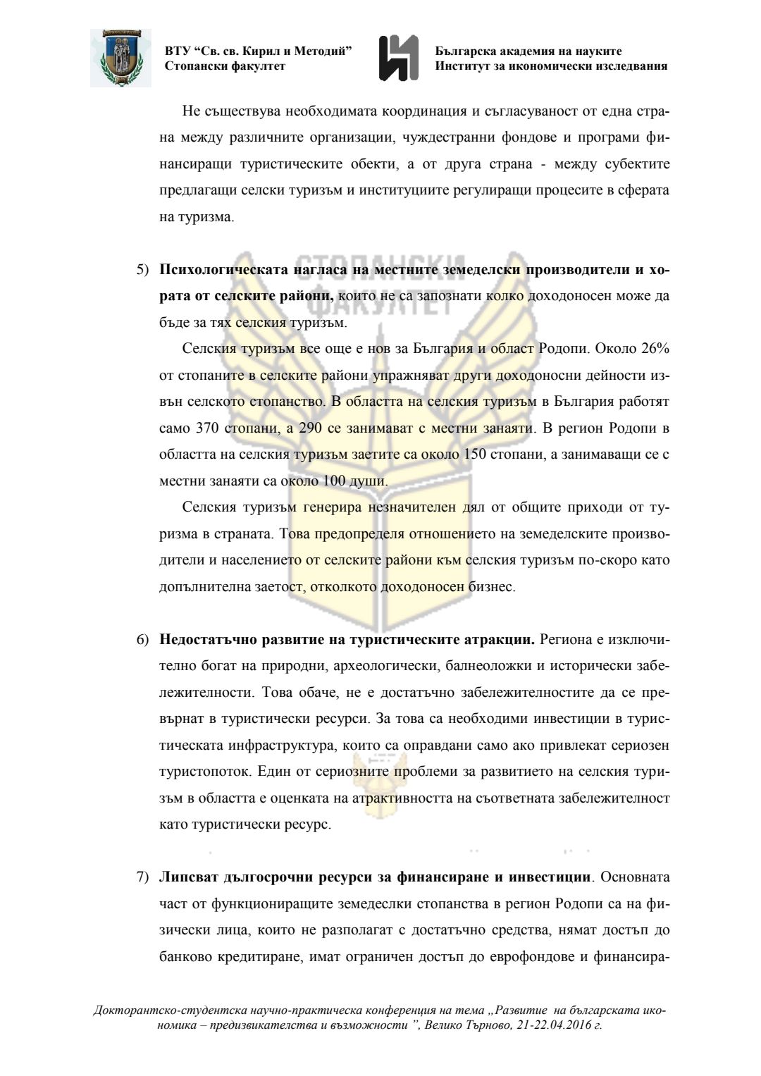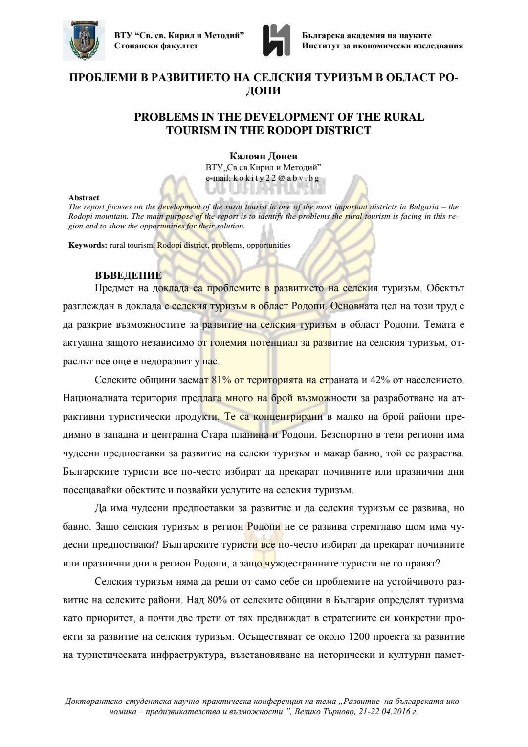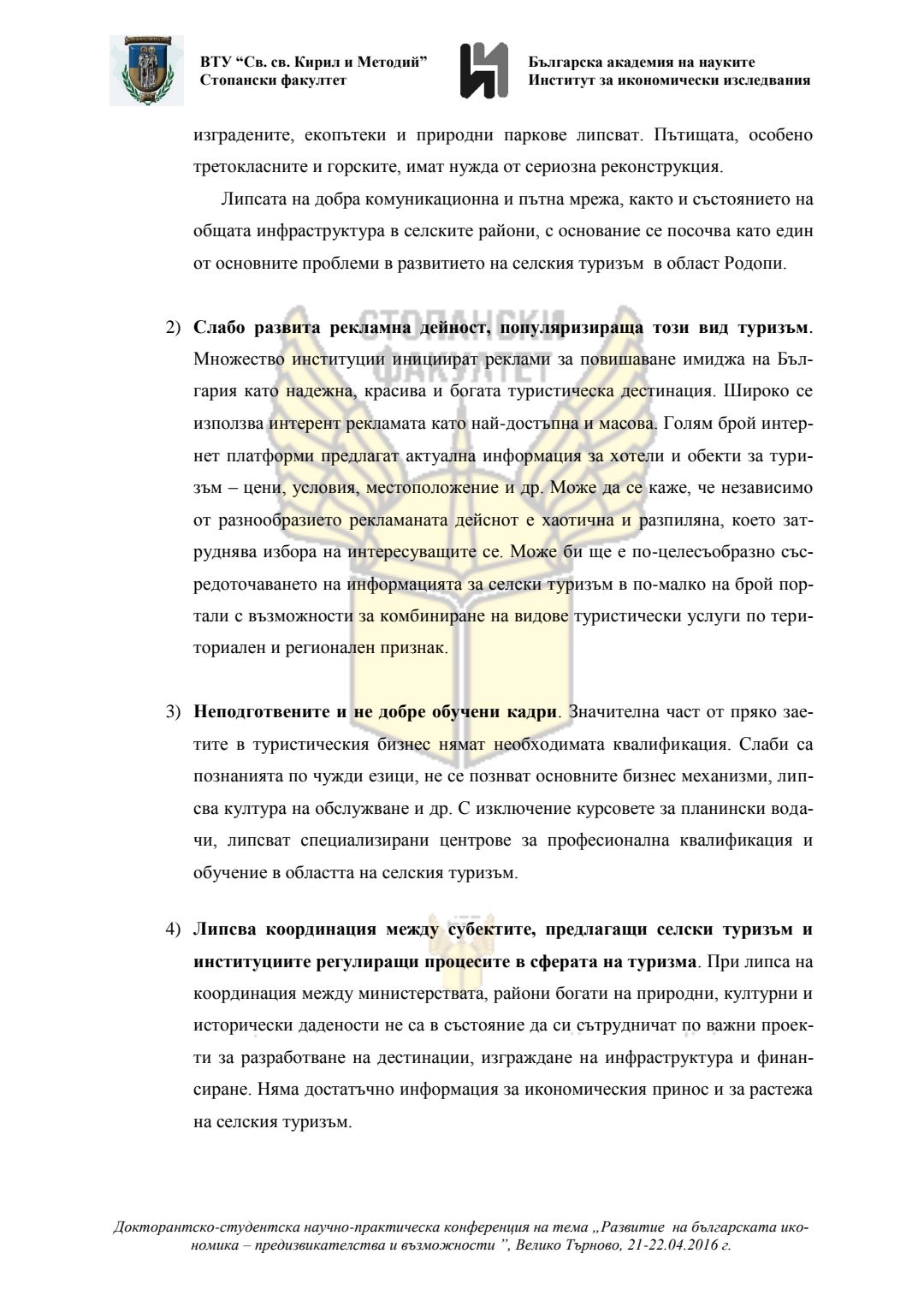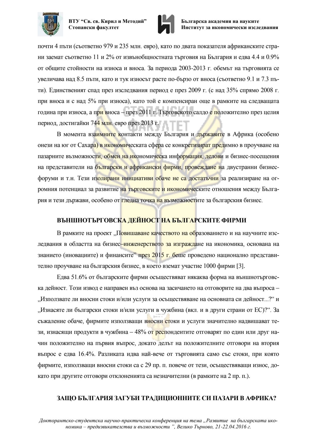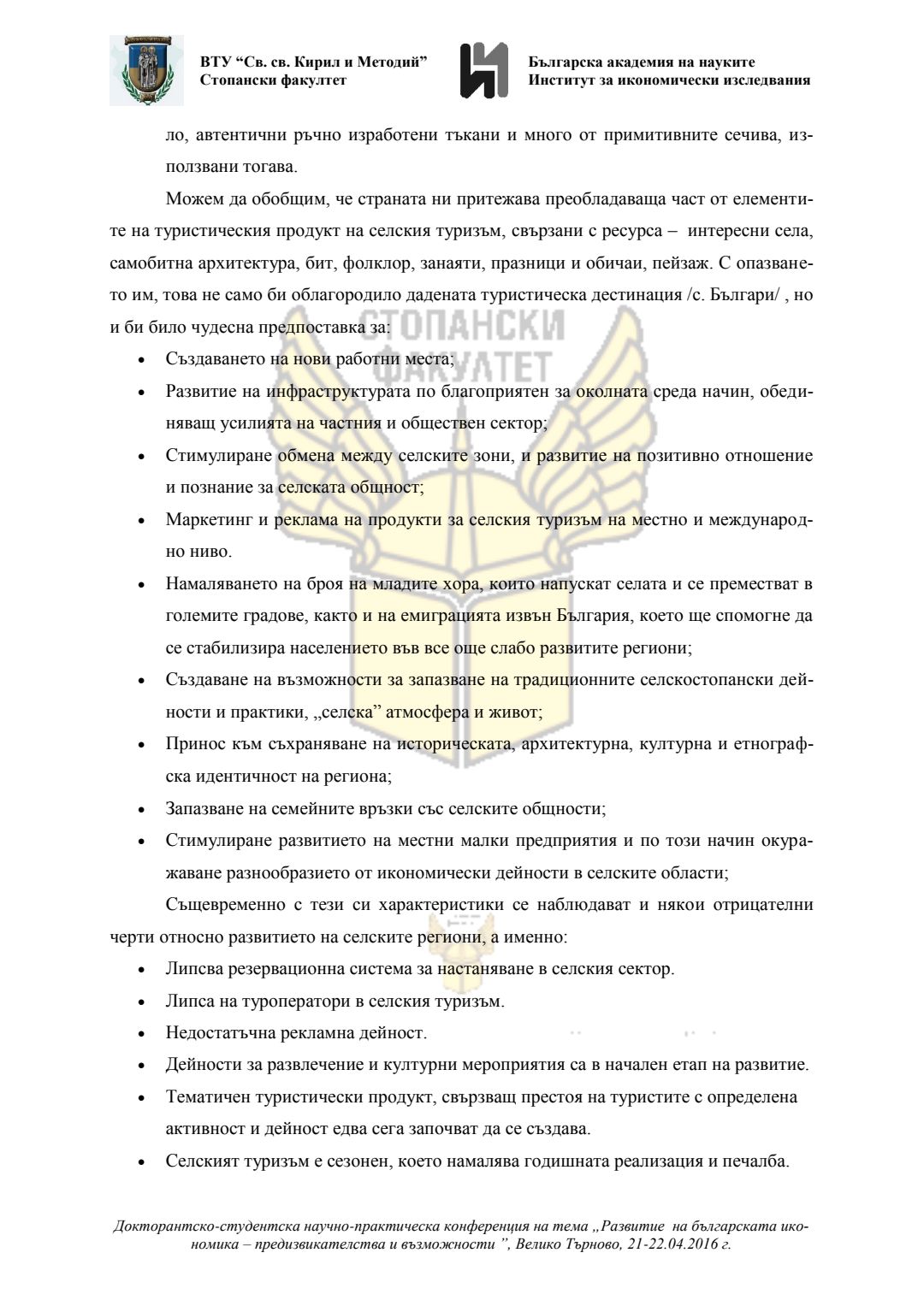 Докторантско-студентска научно-практическа конференция "Развитие на българската икономика - предизвикателства и възможности", 21 април 2016 г., Велико Търново : сборник с доклади