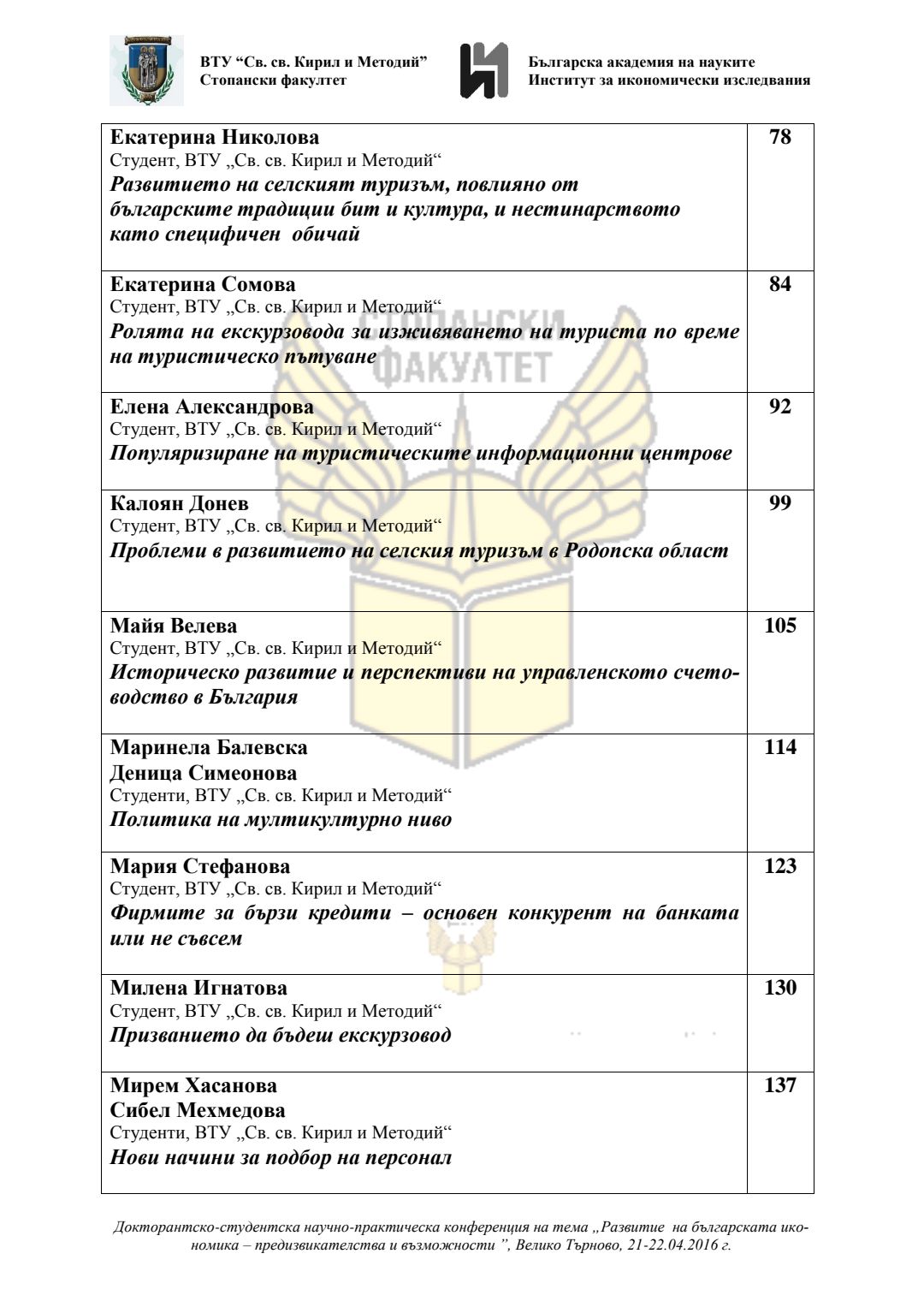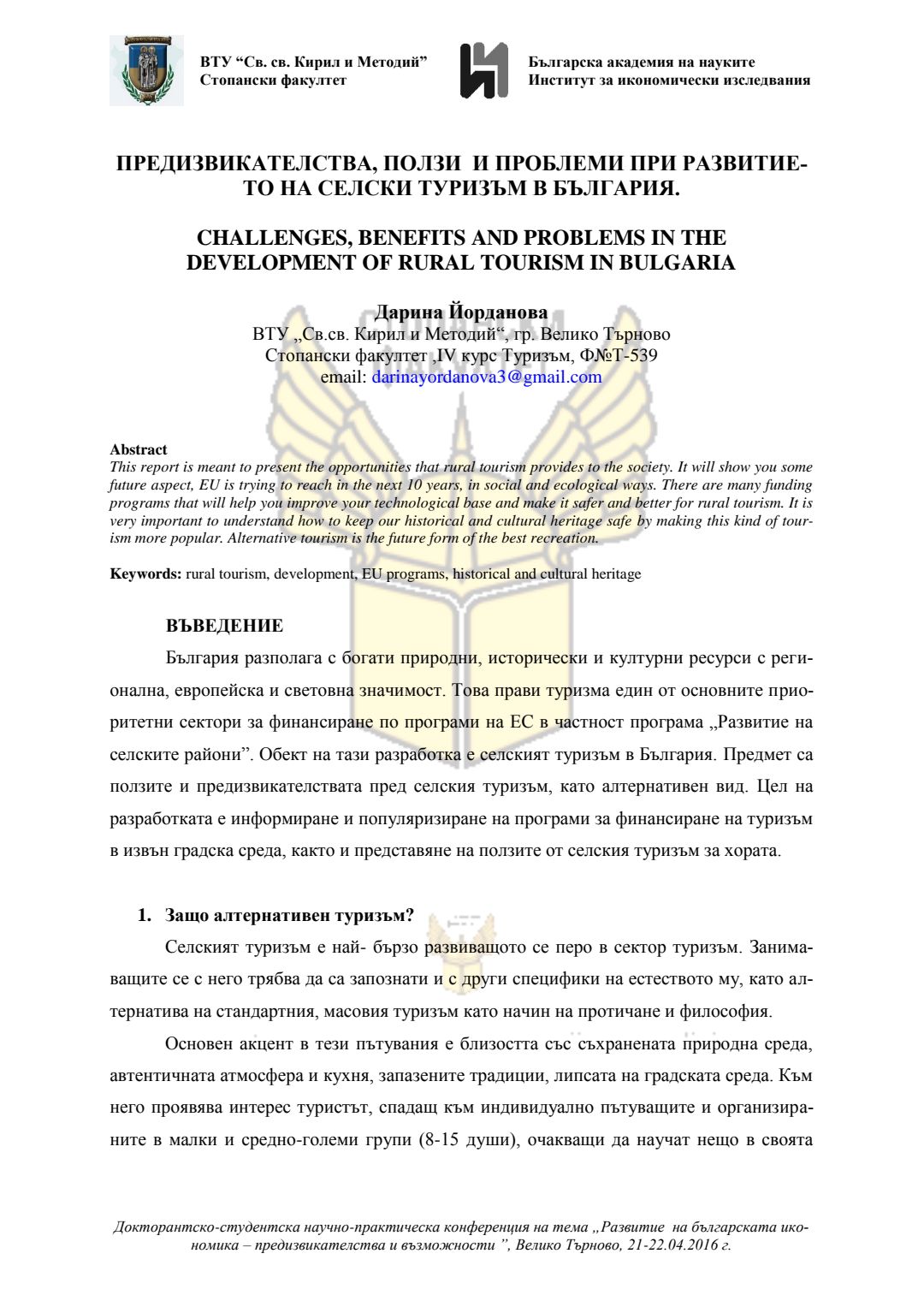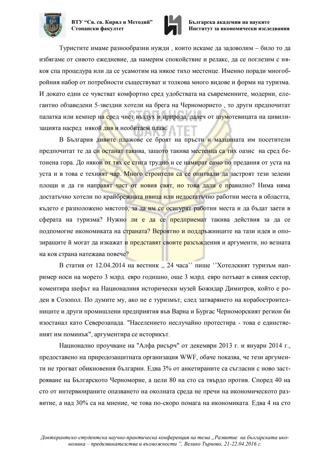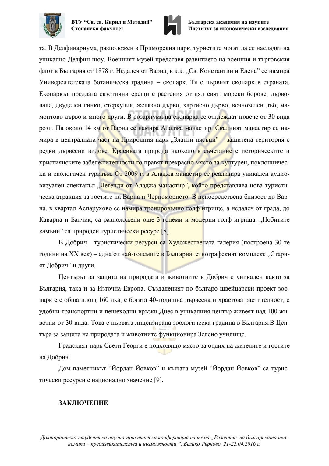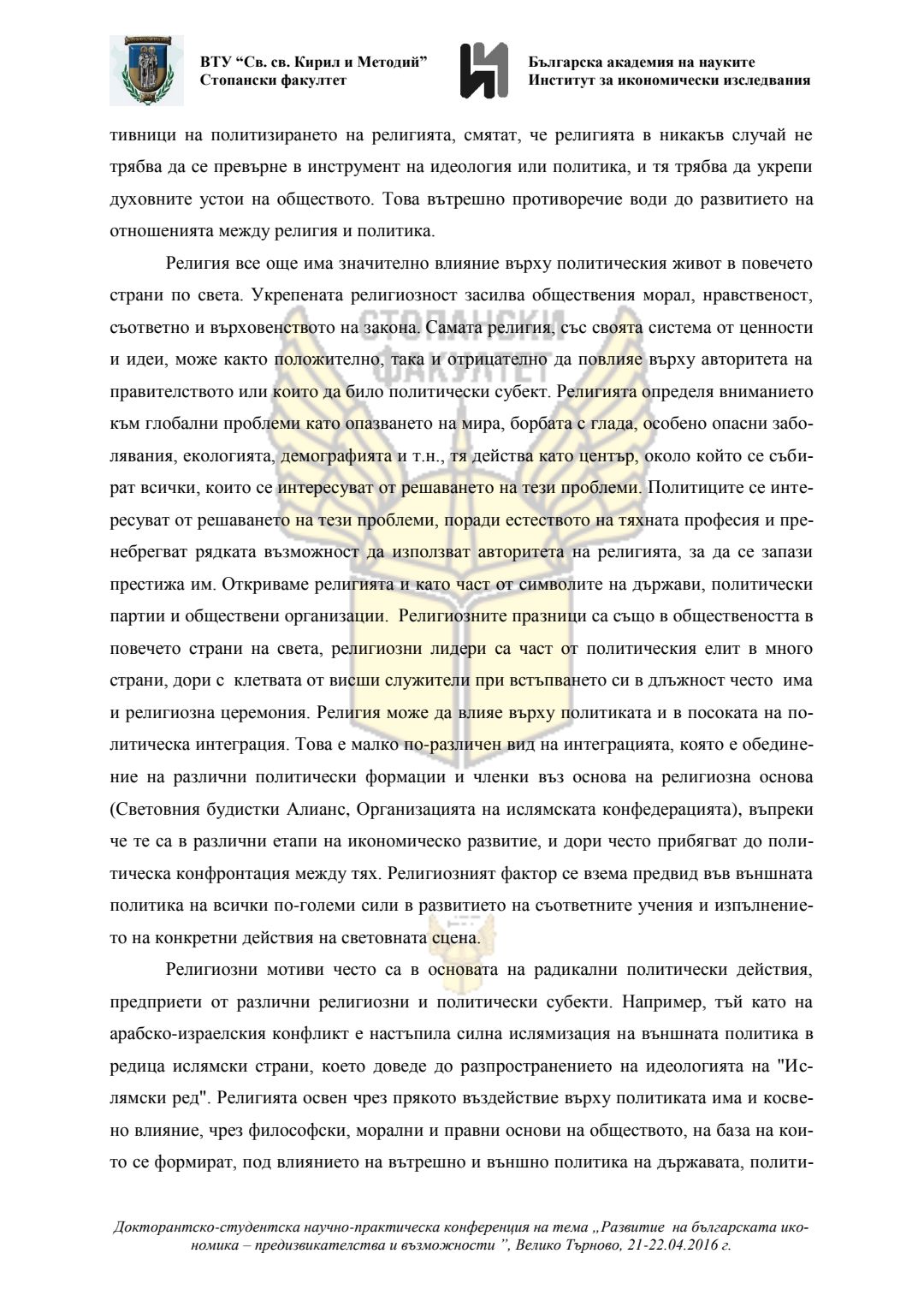 Докторантско-студентска научно-практическа конференция "Развитие на българската икономика - предизвикателства и възможности", 21 април 2016 г., Велико Търново : сборник с доклади